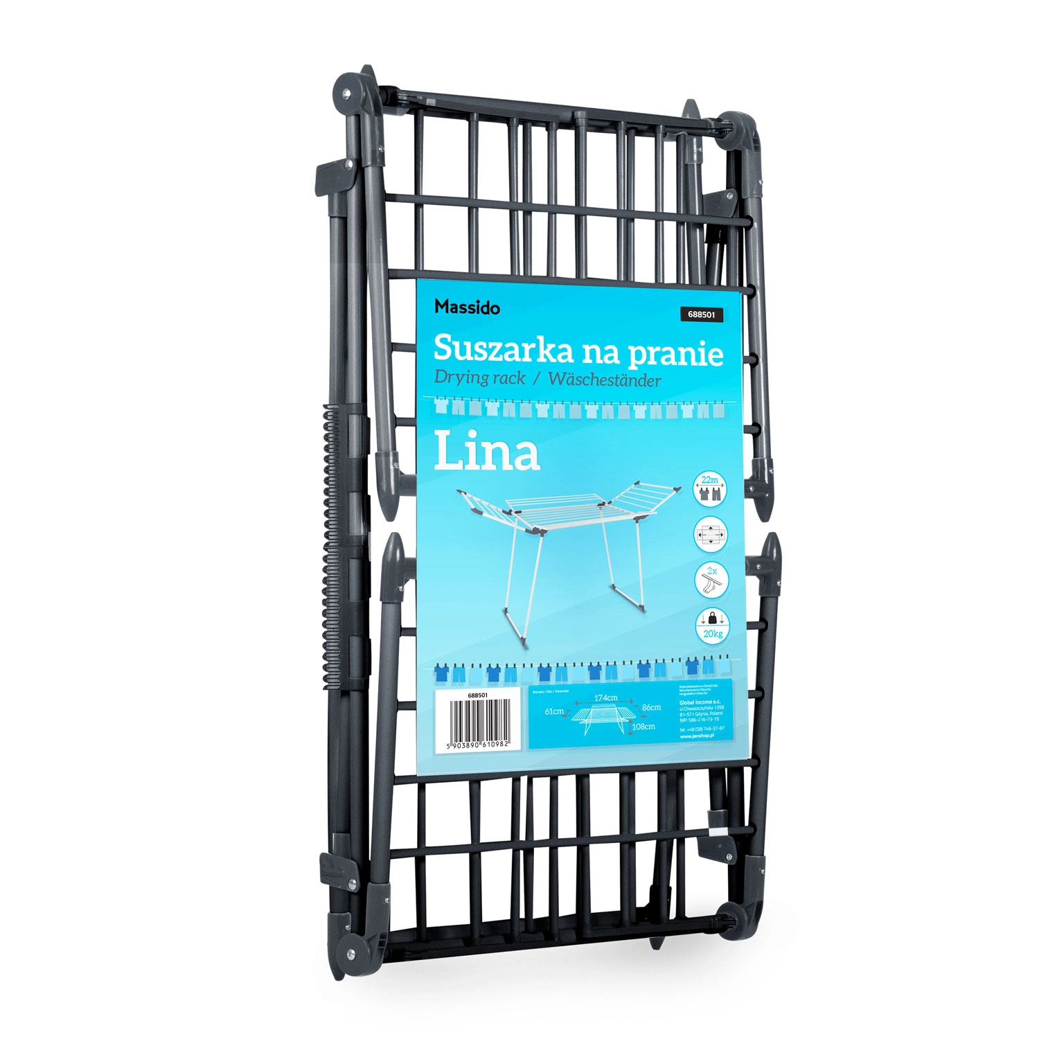 Iščete prostoren, a hkrati shranljiv sušilnik, ki zmore vsakodnevno perilo in tudi večje ture? Massido LINA z dolžino vrvic 22 m nudi dovolj prostora za srajce, hlače in posteljno perilo. Čvrsto, praškasto barvano jeklo zagotavlja stabilnost in dolgo življenjsko dobo, medtem ko se moderno črno izvedbo odlično poda v vsako pralnico ali kopalnico.