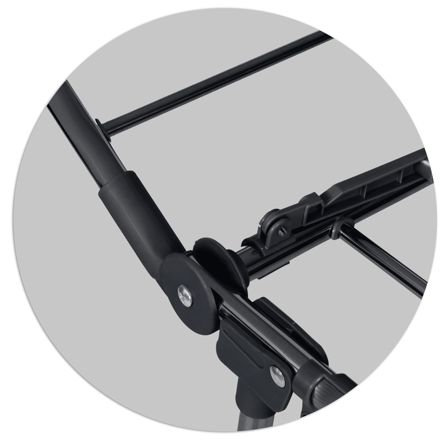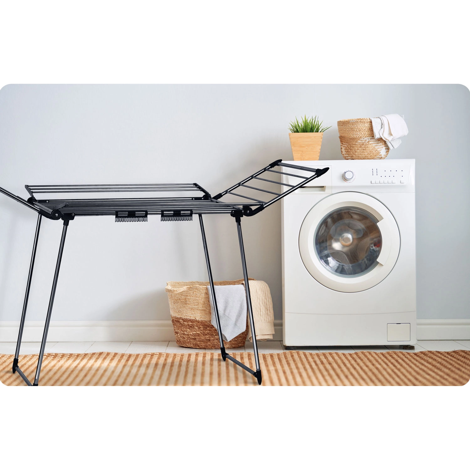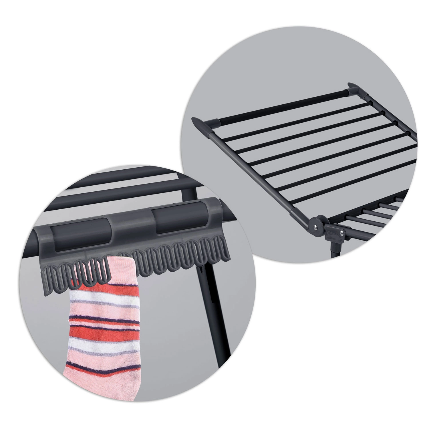 Debeješe prečke porazdelijo težo perila in pomagajo zmanjšati nastanek gub, zato pogosto likanje ne bo potrebno. Premišljeni razmiki med palicami spodbujajo hiter pretok zraka za enakomerno in hitro sušenje. Praktična držala za manjše kose prihranijo prostor na glavnih palicah, štiri zložljiva krila pa zlahka prilagodite dolžini in tipu oblačil.