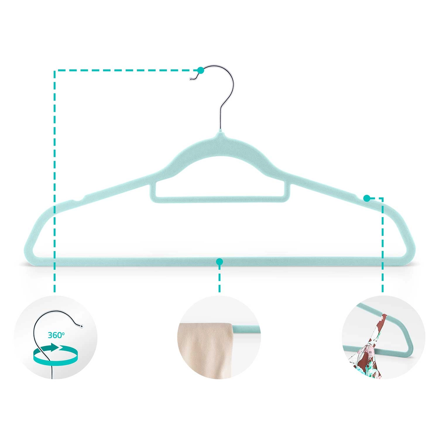 Z vrtljivim kovinskim kavljem zlahka razvrščate in obešate oblačila iz katere koli smeri. Spodnja letvica je idealna za hlače, šale ali rutke, praktične zareze pa držijo naramnice oblek in topov. Tanka zasnova obešalnika prihrani prostor, zato boste v omaro udobno shranili več oblačil.