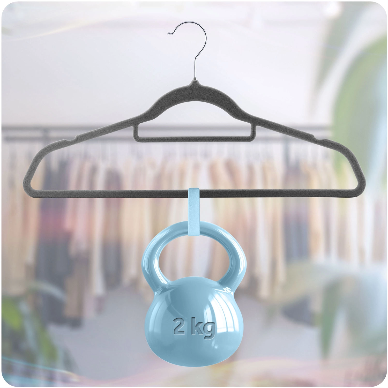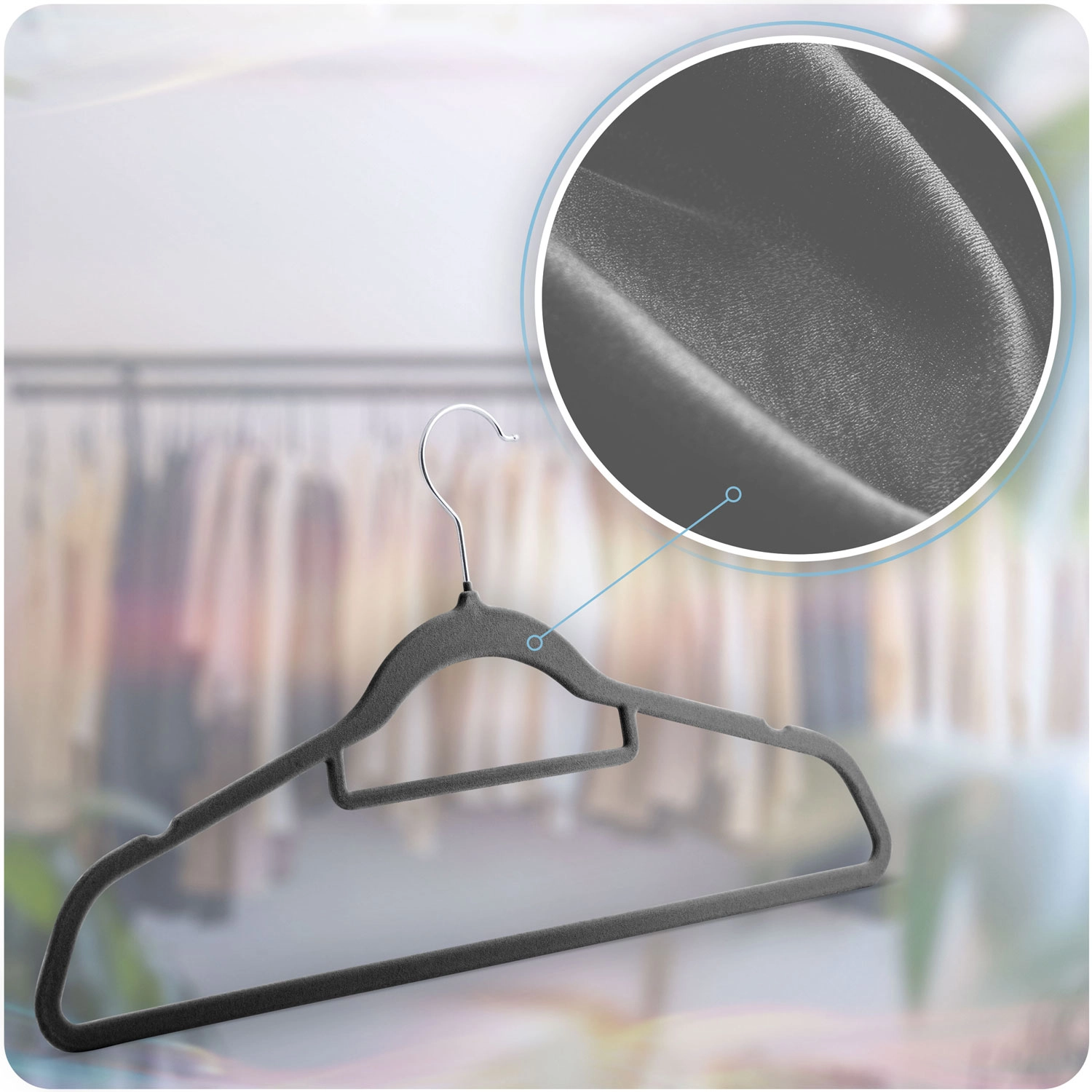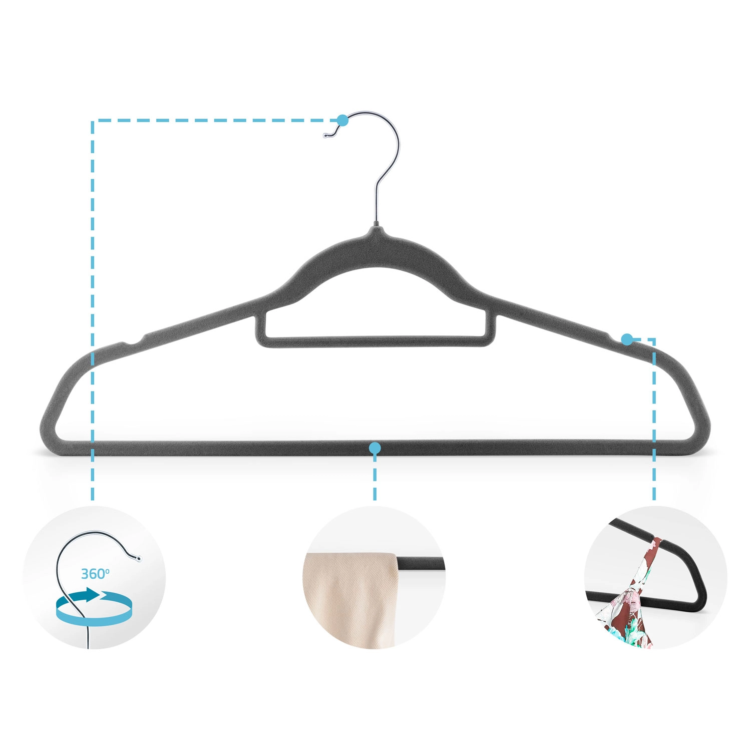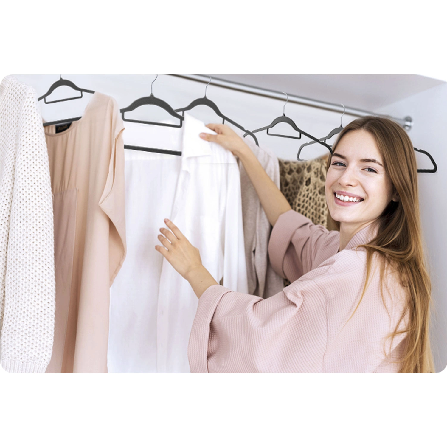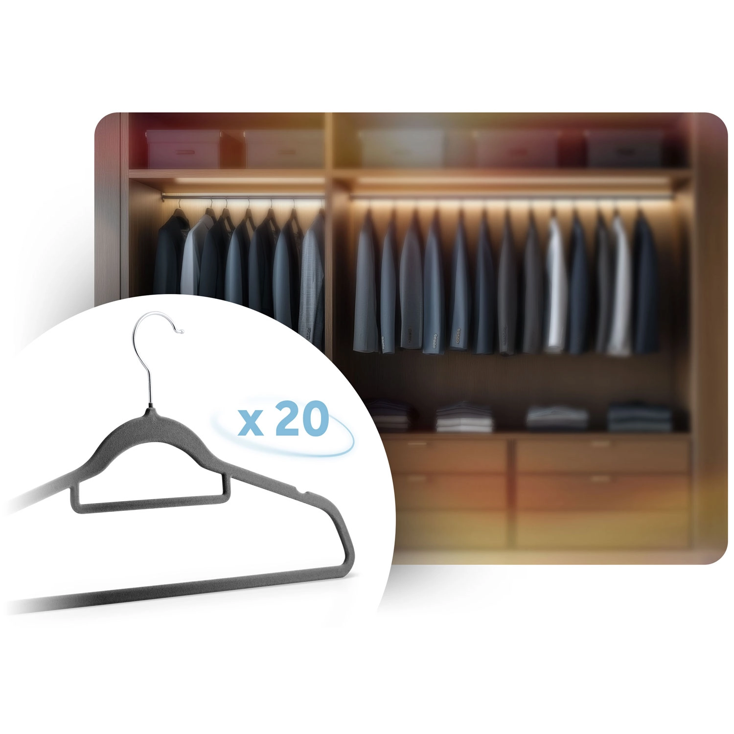 Uredite garderobo elegantno in prostorsko varčno s kompletom 20 žametnih ne-drsnih obešalnikov MASSIDO. Imajo proti-zdrsno površino, vrtljiv jeklen kavelj in prečno palico za hlače, šale ali kravate. Zahvaljujoč ozkemu profilu boste na isti prostor obesili več oblačil, obešalniki pa ohranijo obliko tudi pri težjih kosih brez deformacij.