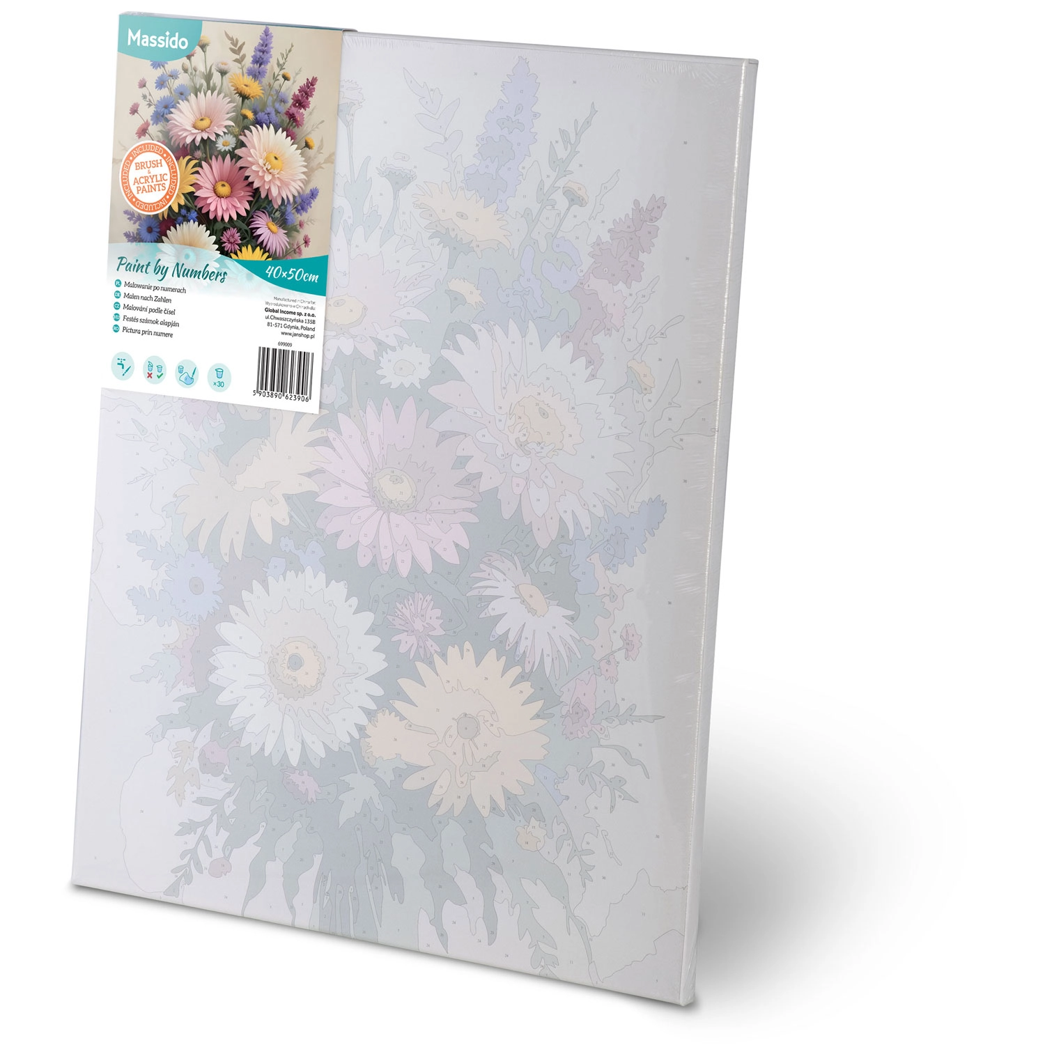 Stabilno platno na lesenem okvirju z jasno označenimi številkami olajša slikanje in zagotavlja čist rezultat brez zapletene priprave.