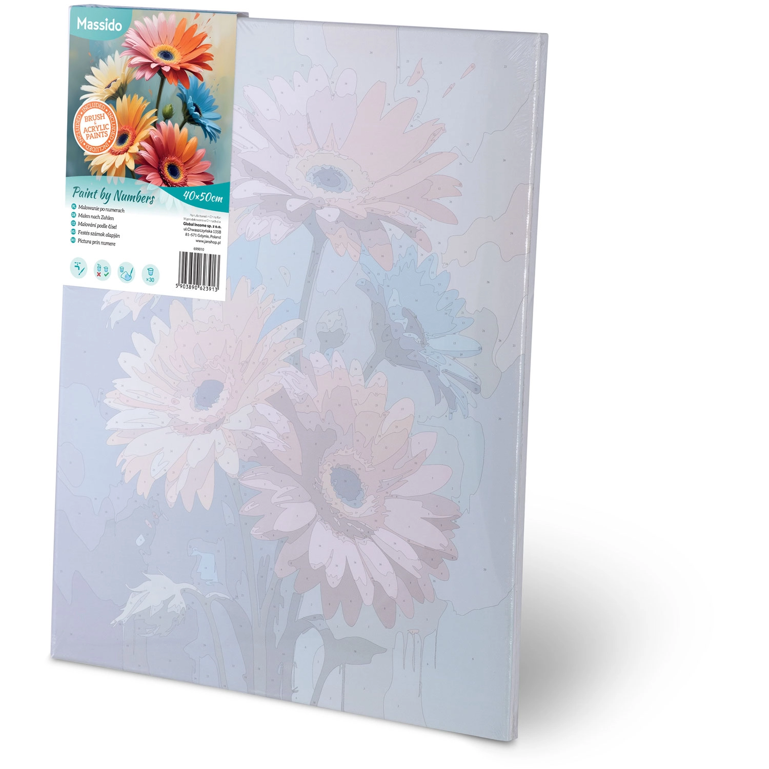 Grundirano platno 40 × 50 cm na okvirju, do 30 intenzivnih akrilnih barv in trije čopiči (1 mm, 2 mm, 7 mm) za detajle in površine – začnete lahko slikati takoj.