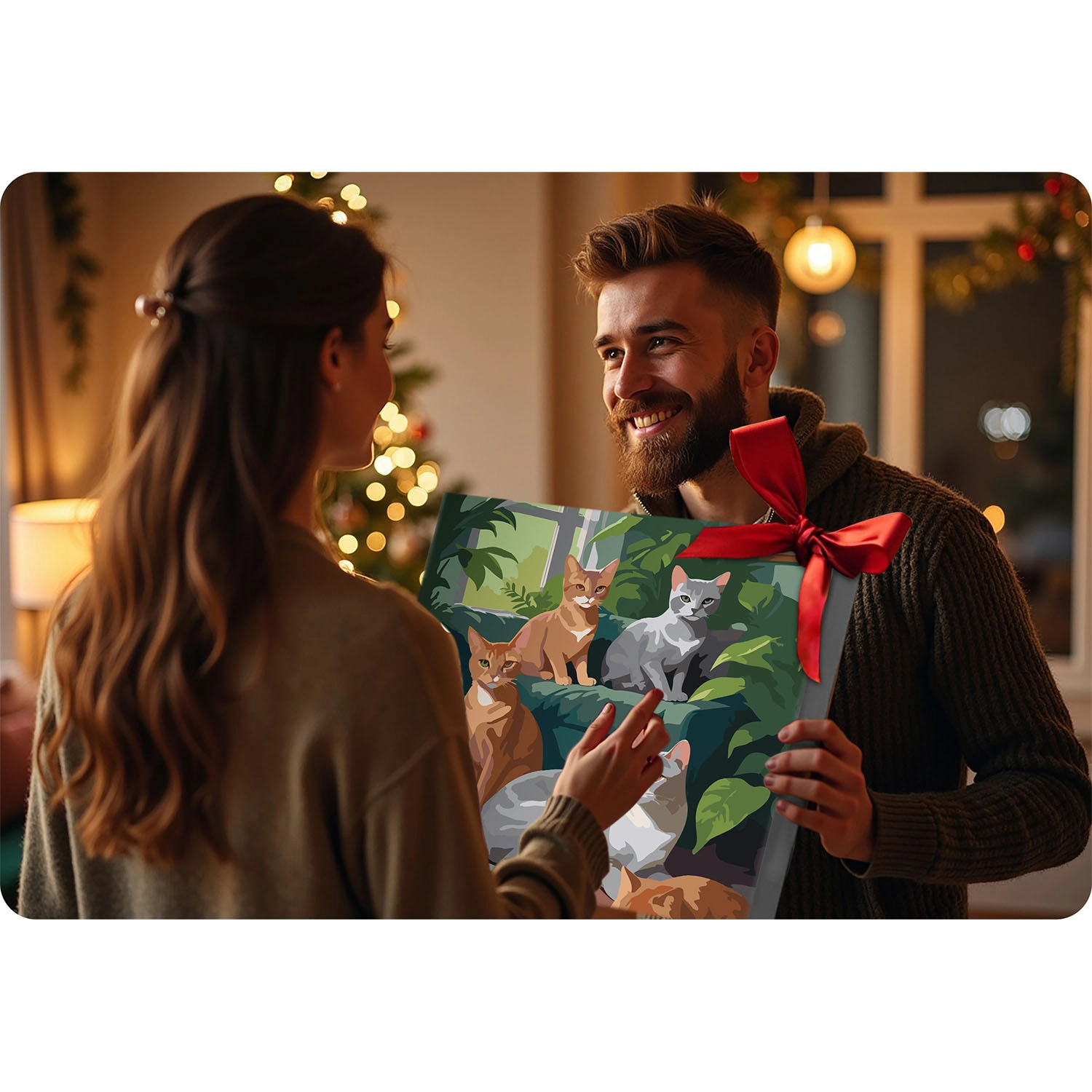 Idealno ustvarjanje za posameznike in družine. Končana slika z motivom mačk bo izviren okras notranjosti ali darilo od srca.