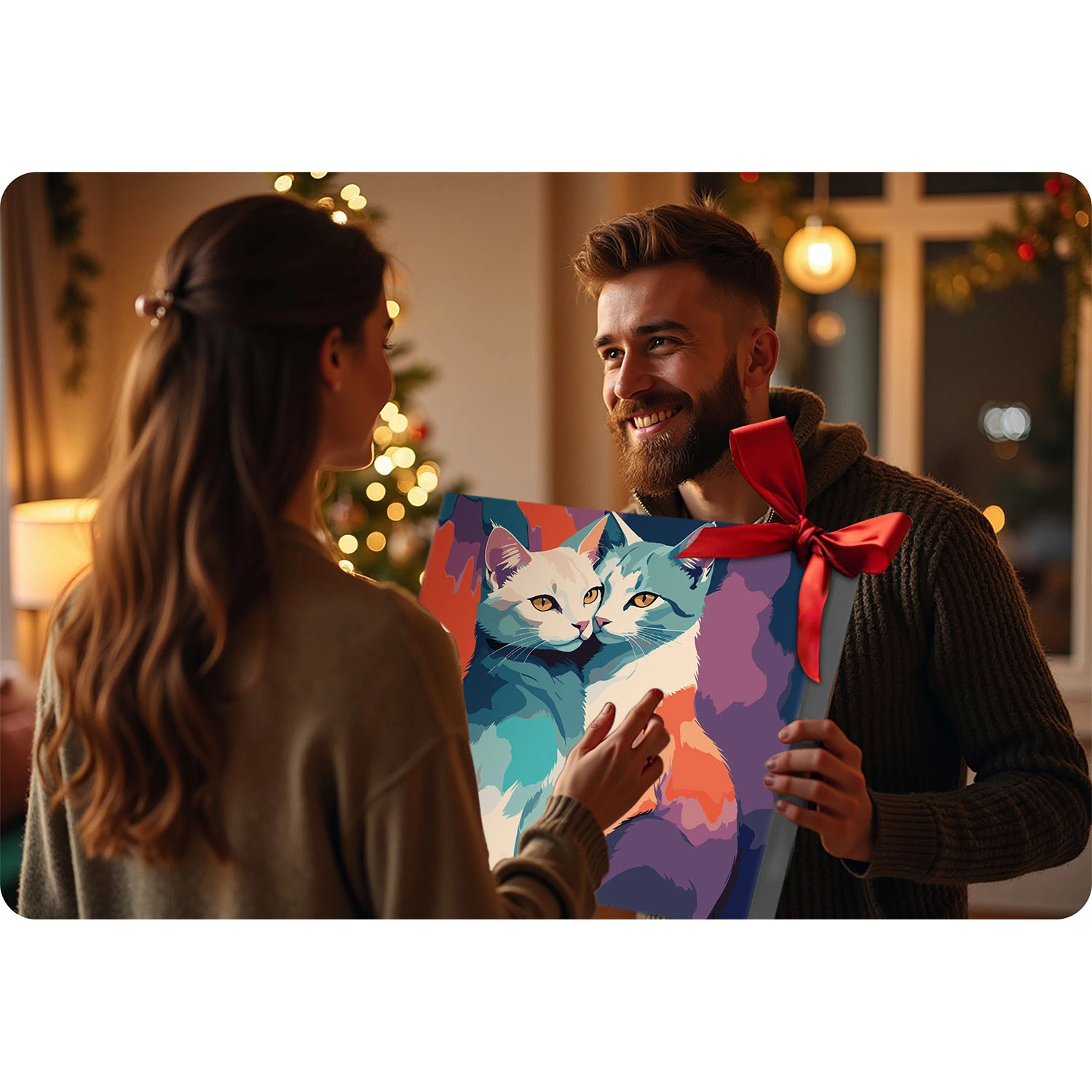Živahen, sodoben motiv mačk poživi vsak interier. Končano delo je odlična dekoracija in osebno darilo iz srca.