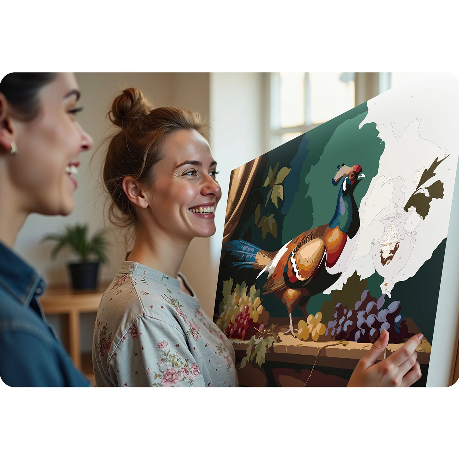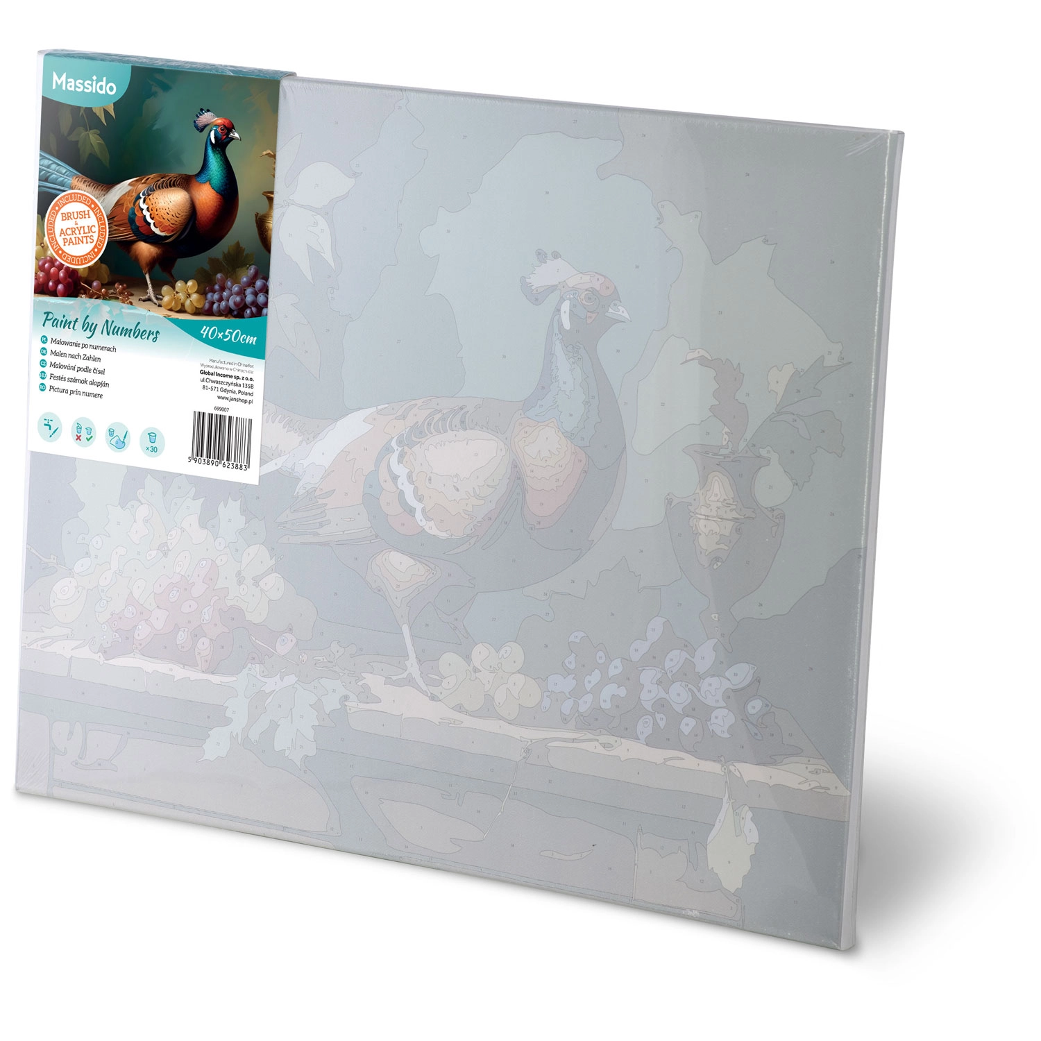 Ustvarite lastno umetniško delo z motivom barvitega fazana med grozdjem in vazo. Predtiskano, nežno tonirano platno z oštevilčenimi polji vas korak za korakom vodi do popolnega rezultata. Zaradi intenzivnih in prekrivnih barv linije ne prosevajo, slika pa deluje profesionalno – brez potrebe po redčenju barvne mešanice.