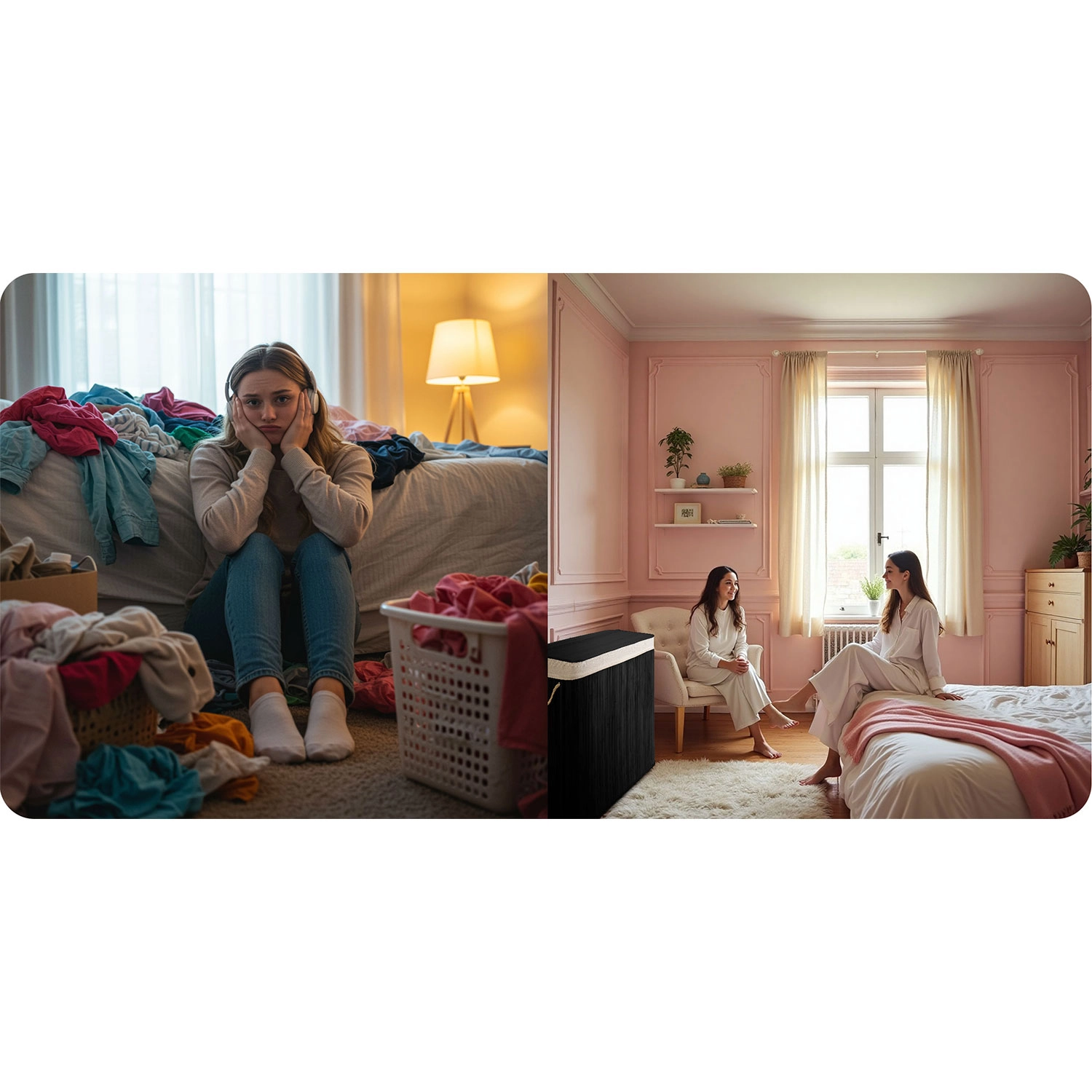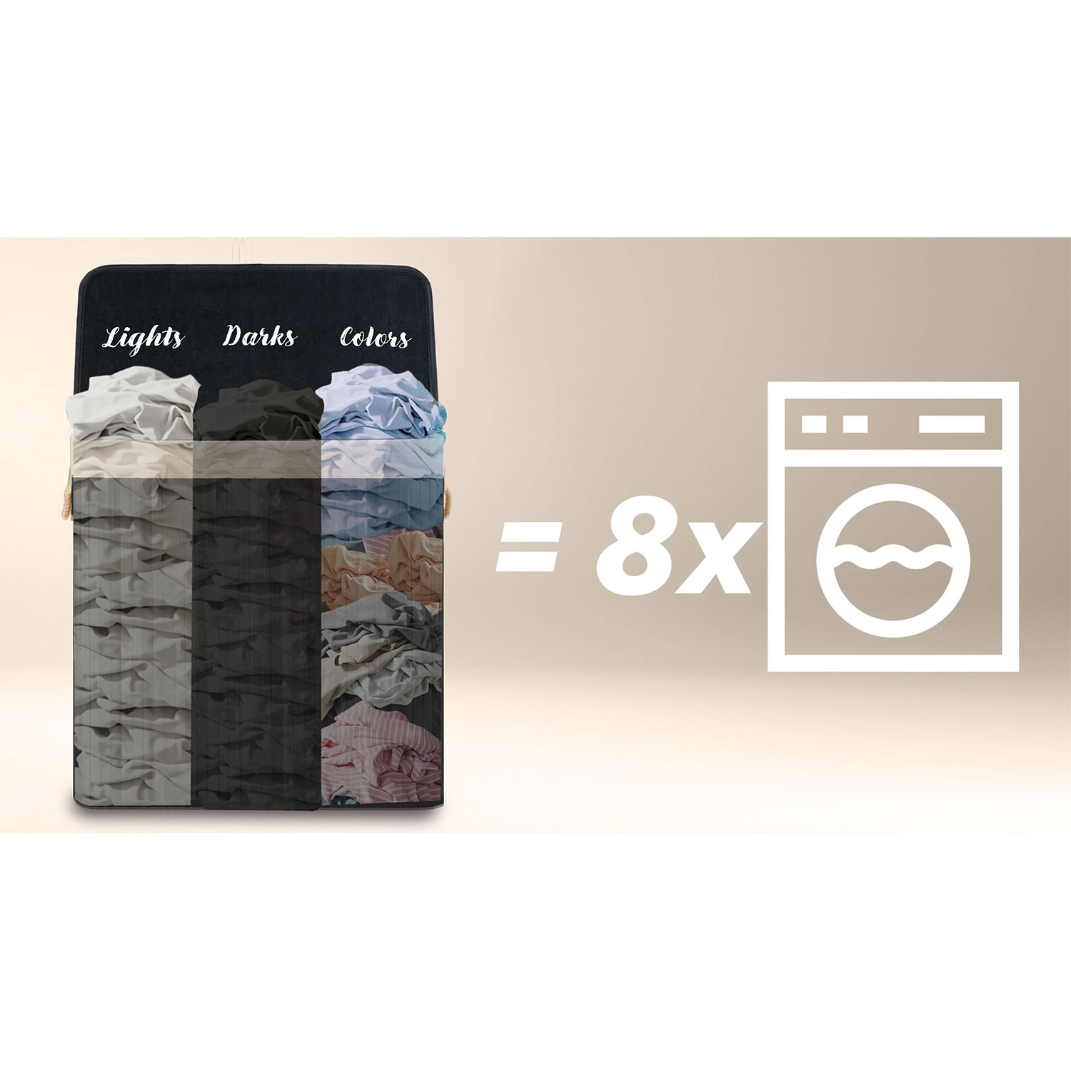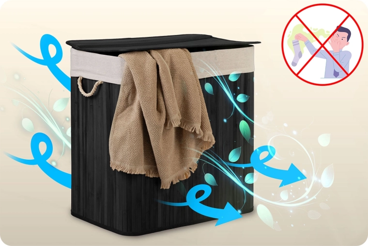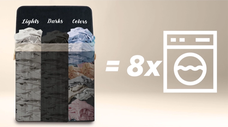 Odkrijte praktično rešitev za vsakodnevno razvrščanje perila. Velikodušna prostornina 150 litrov sprejme perilo iz več pranj, pregledne oznake Lights / Darks / Colors pa vas razbremenijo zamudnega razvrščanja pred pranjem. Naravni materiali – bambus in bombaž – podpirajo kroženje zraka in zmanjšujejo vonjave.