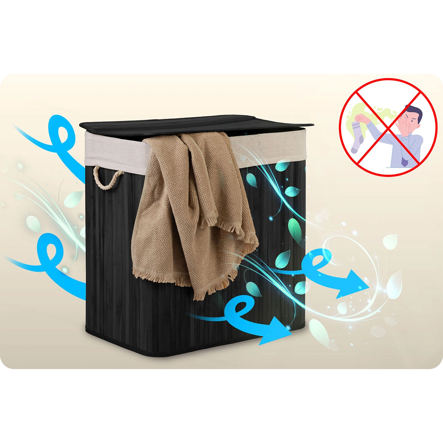 Vnesite red v pranje z elegantnim bambusovim košem s prostornino 150 l in pametnim 3-prekatnim razvrščanjem za svetlo, temno in barvito perilo. Zahvaljujoč naravnemu bambusu je koš odporen na vlago, trpežen in stilski, medtem ko odstranljiva bombažna vreča omogoča enostaven prenos perila naravnost v pralni stroj brez nereda.