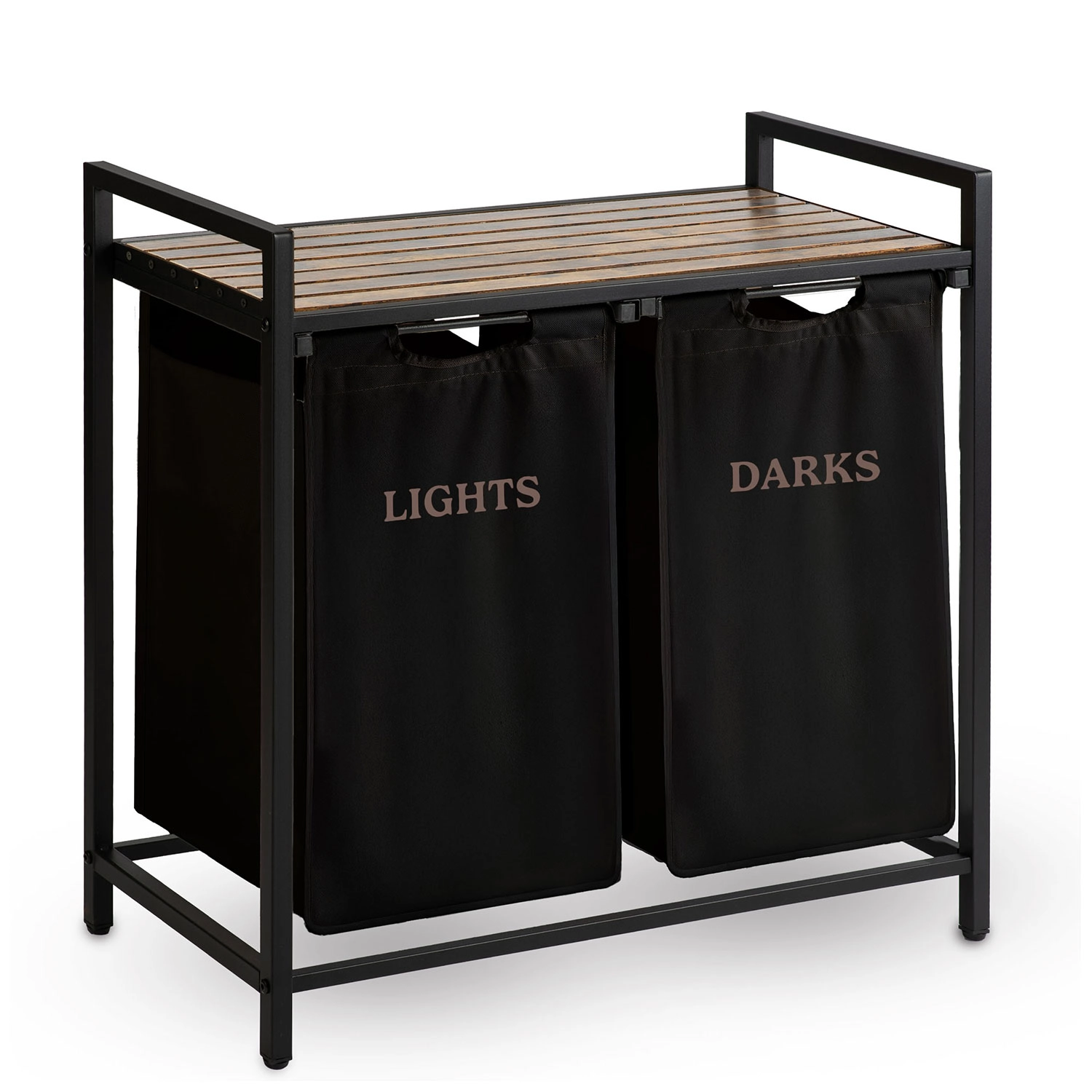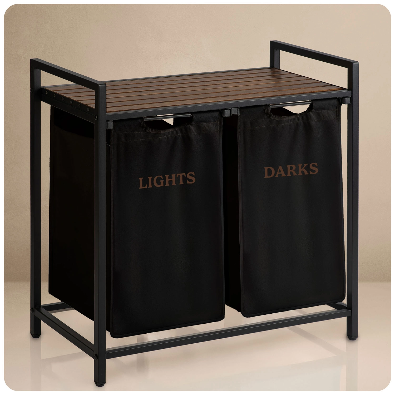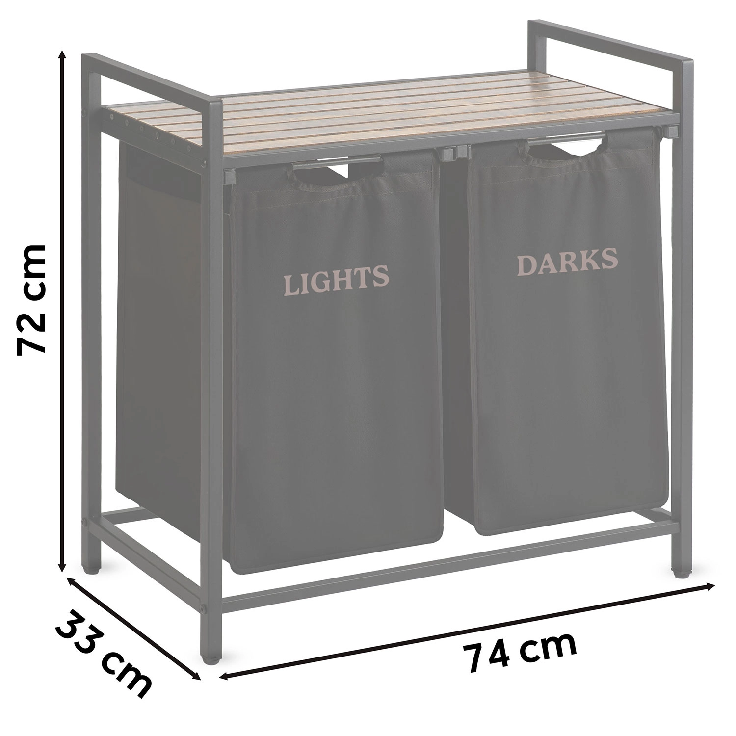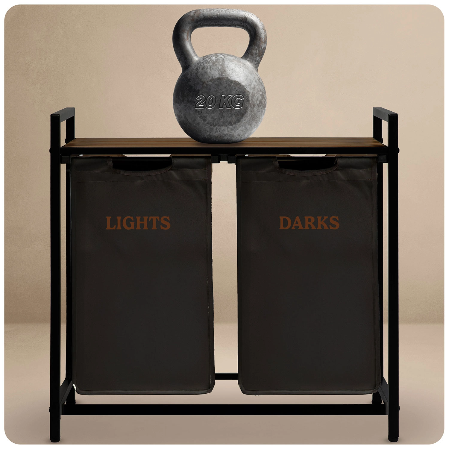 Z dvema ločenima tekstilnima košema z oznakama »Lights« in »Darks« perilo razvrščate že ob odlaganju – brez dolgotrajnega deljenja pred pranjem. Zgornja polica iz naravnega lesa nudi prostor za detergente, košare z brisačami ali manjše aparate in nosi do 20 kg.