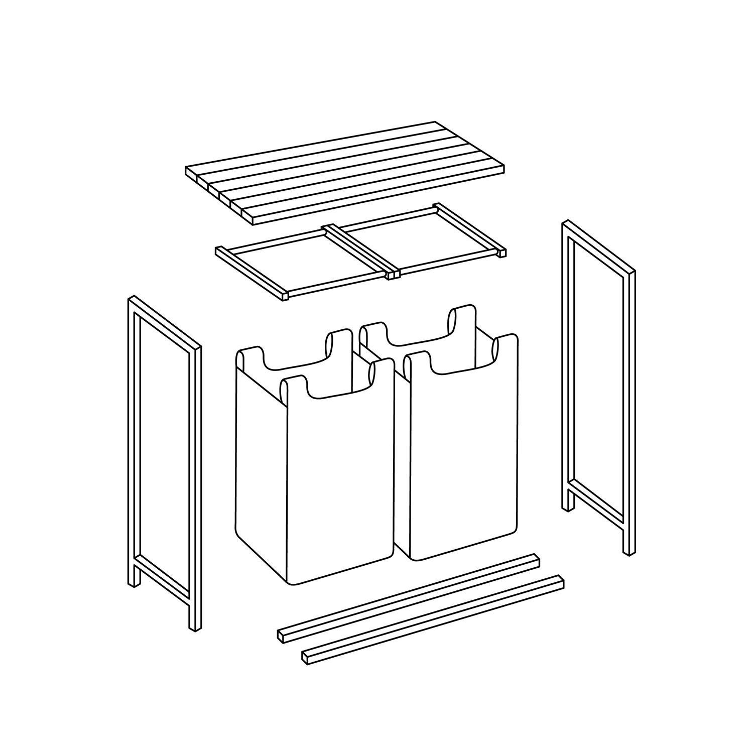 Ogrodje iz prašno lakiranega jekla je odporno proti koroziji, praskam in obrabi, lesena plošča pa je odporna na vlago in plesen. Odstranljivi vložki s priročnimi ročaji spremenijo koš v prenosno vrečo – preprosto vzamete ven in odnesete do pralnega stroja brez nereda.