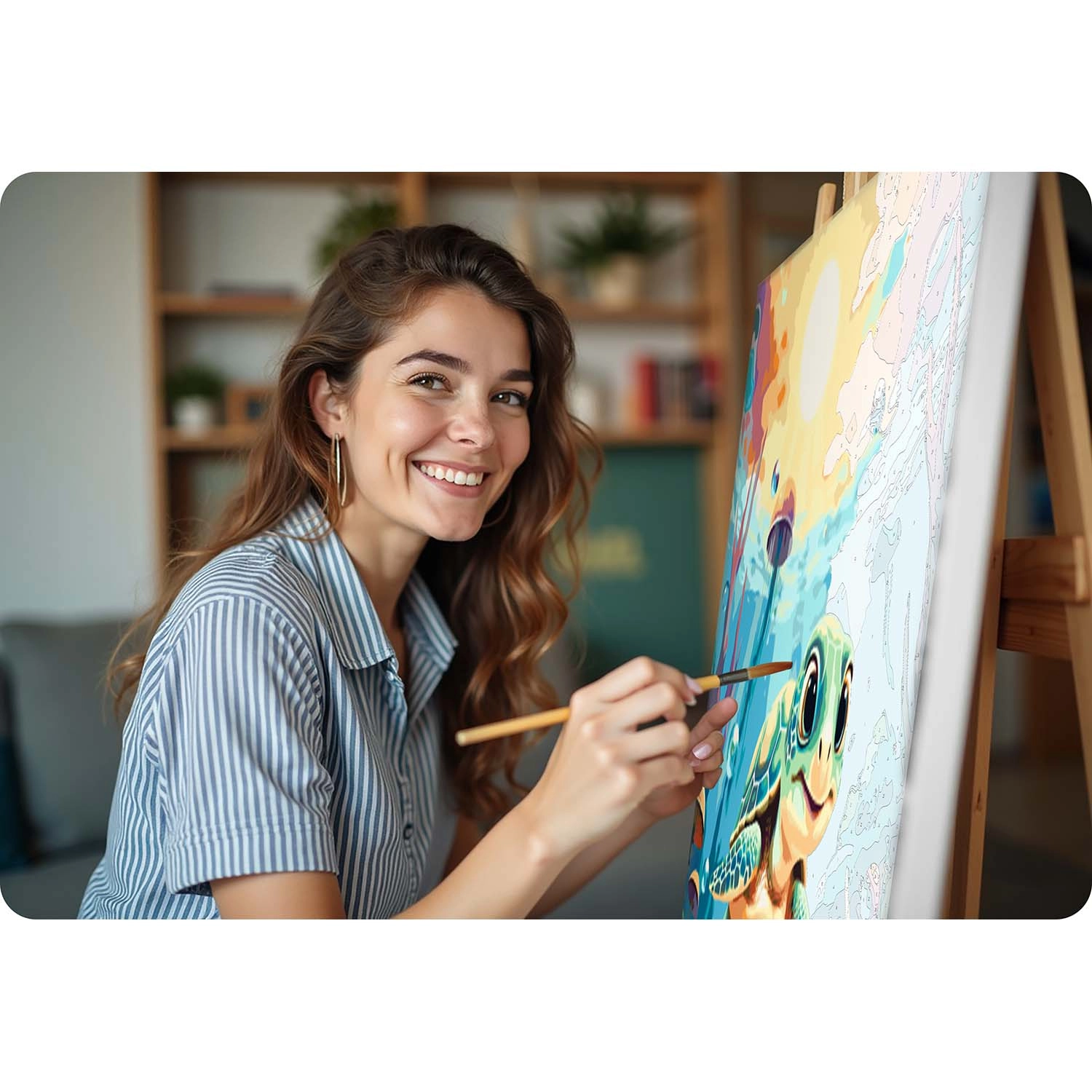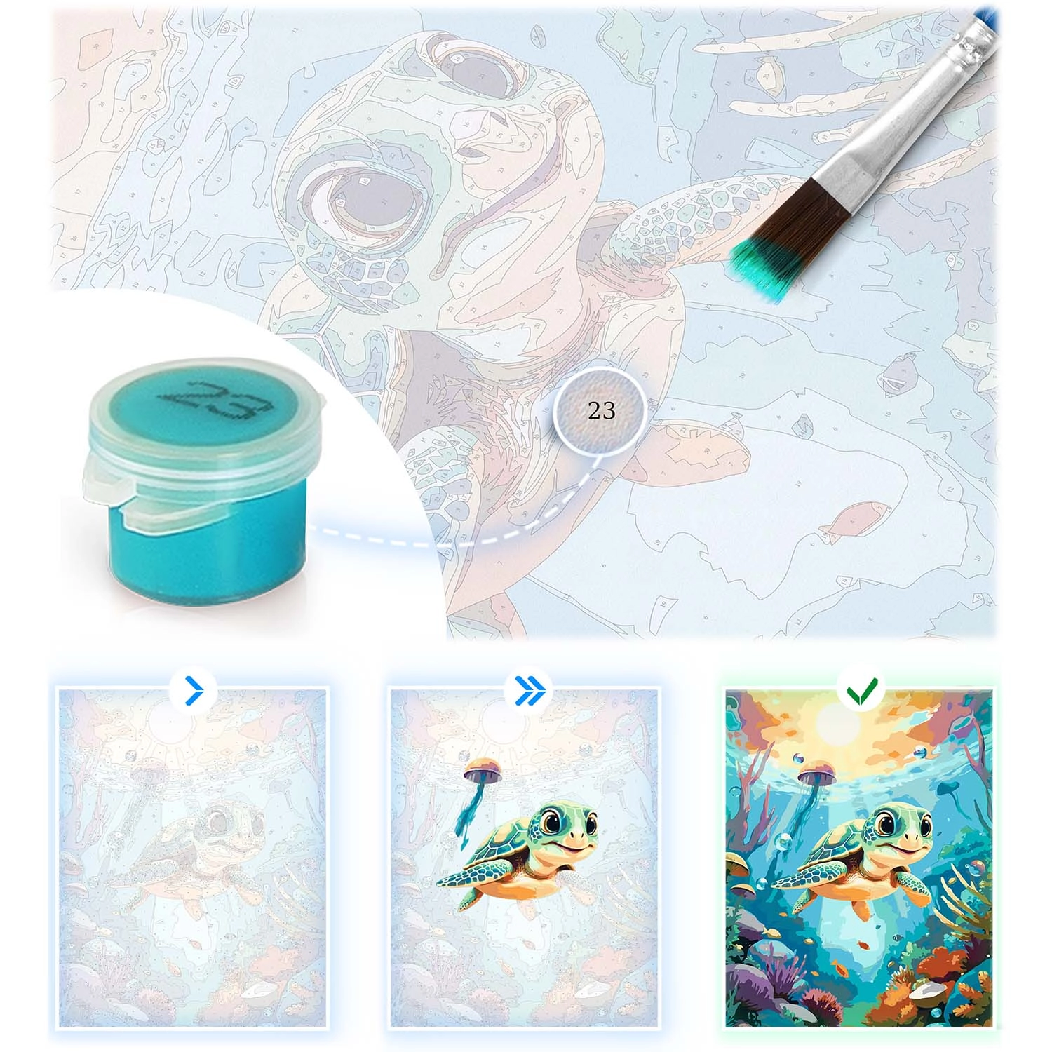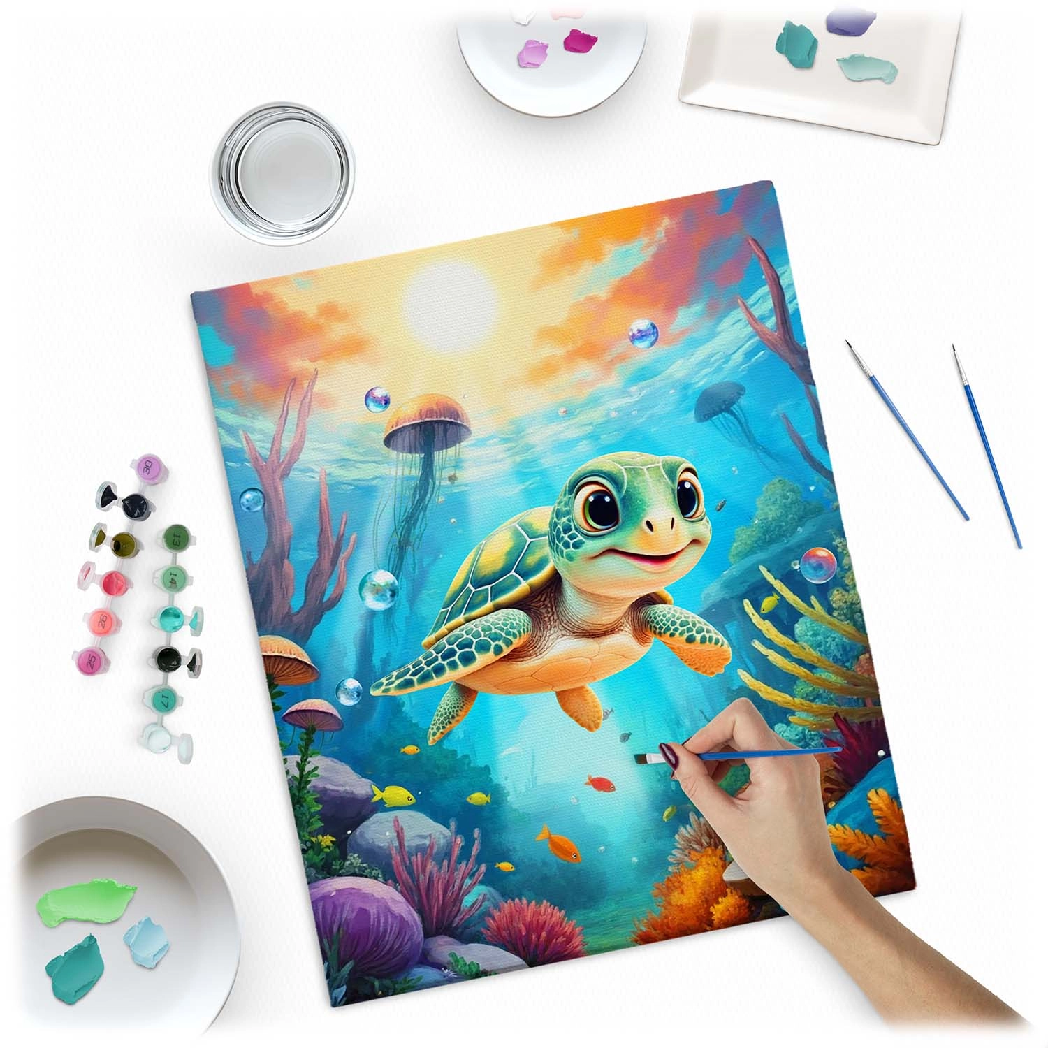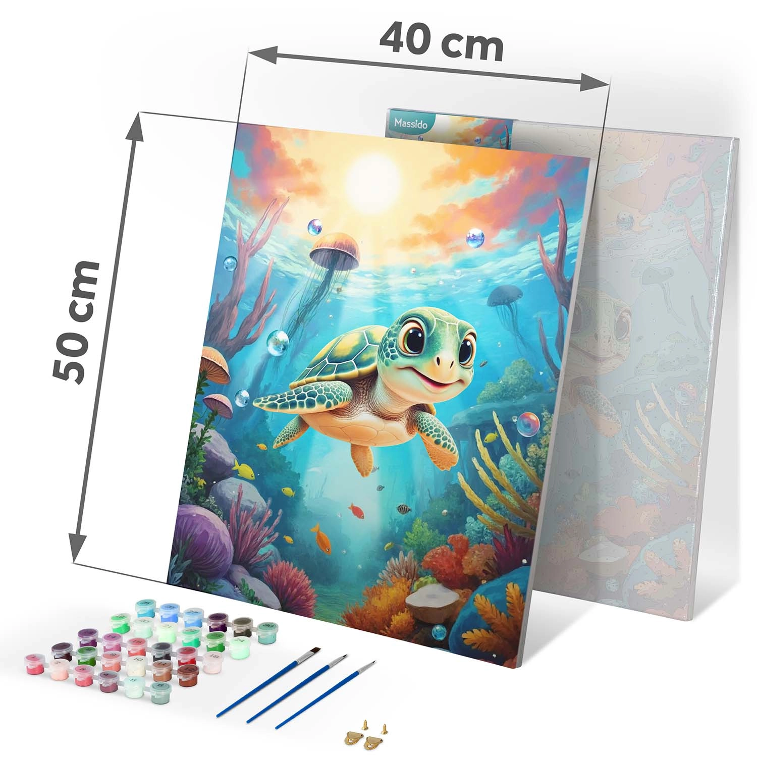 Ta celovit komplet za slikanje po številkah prinaša vse, kar potrebujete za ustvarjanje čudovite slike z motivom morske želvice. Osnova je grundirano platno, napeto na trden lesen okvir z jasno berljivimi številkami, barvna podslikava za lažjo orientacijo ter intenzivne, dobro prekrivne akrilne barve, ki jih ni treba redčiti.