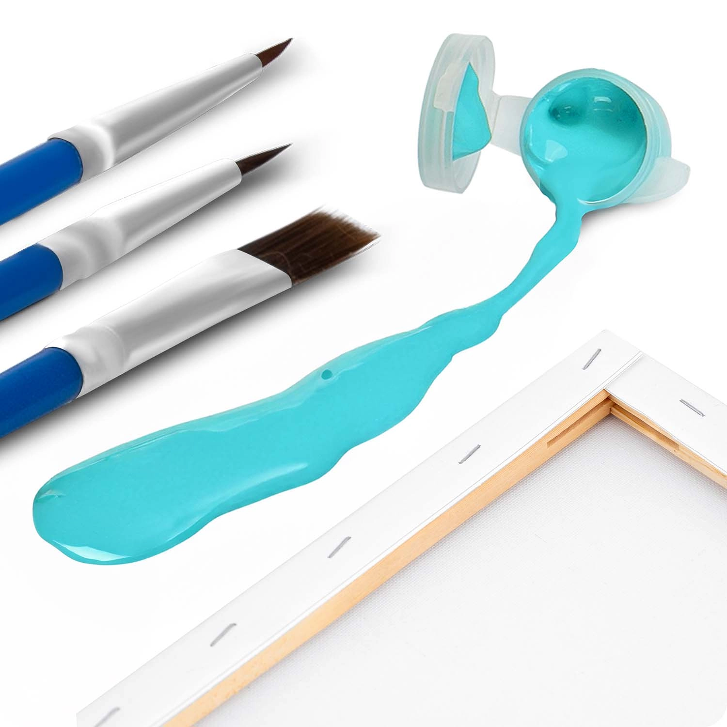 Predtiskano platno na okvirju, 30 prekrivnih akrilnih barv, 3 čopiči in kljukice – odprite in slikate brez dodatnih nakupov.