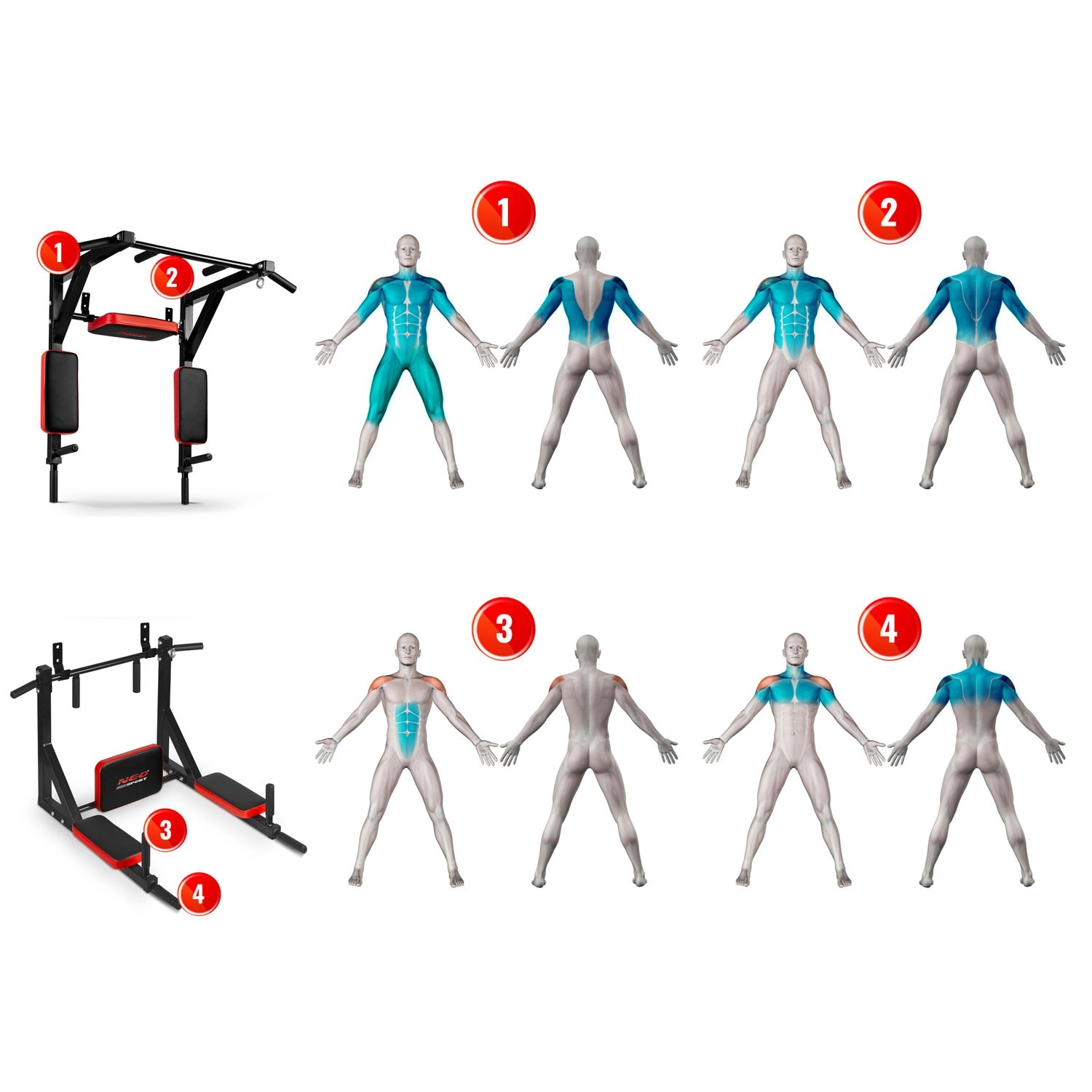 Spremenite svojo sobo v domačo telovadnico z drogovo postajo NEO SPORT NS-319. Robustna jeklena konstrukcija, več oprijemov in udobno oblazinjenje omogočajo učinkovit trening hrbta, ramen, trebuha in prsnega koša. Zahvaljujoč hitri stenski montaži, nosilnosti 150 kg in multifunkcijski zasnovi 2v1 boste zlahka trenirali celo telo, od zgibov in dipov do dvigovanja nog. Priložena je popolna montažna garnitura in kavelj za obešanje boksarske vreče.