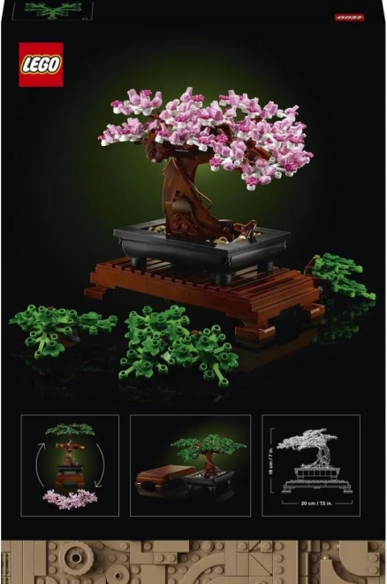 LEGO Bonsaj Drevo je popolno darilo in privla0den projekt za tiste, ki obo7eujejo bonsaje, rastline in kreativno gradnjo iz LEGO kock. Komplet vsebuje zamenljive dele, ki omogo0dajo okrasitev drevesa s klasi0dnimi zelenimi listi ali ro7enimi cvetovi. Cvetovi so zanimivo oblikovani z malimi 7eabami in model je zaradi pravokotne posode in podstavka preprosto razstaviti v notranjosti. Dimenzije modela so pribli7eno 18 cm v vi61ino, 21 cm v dol7eino in 20 cm v 61irino.
