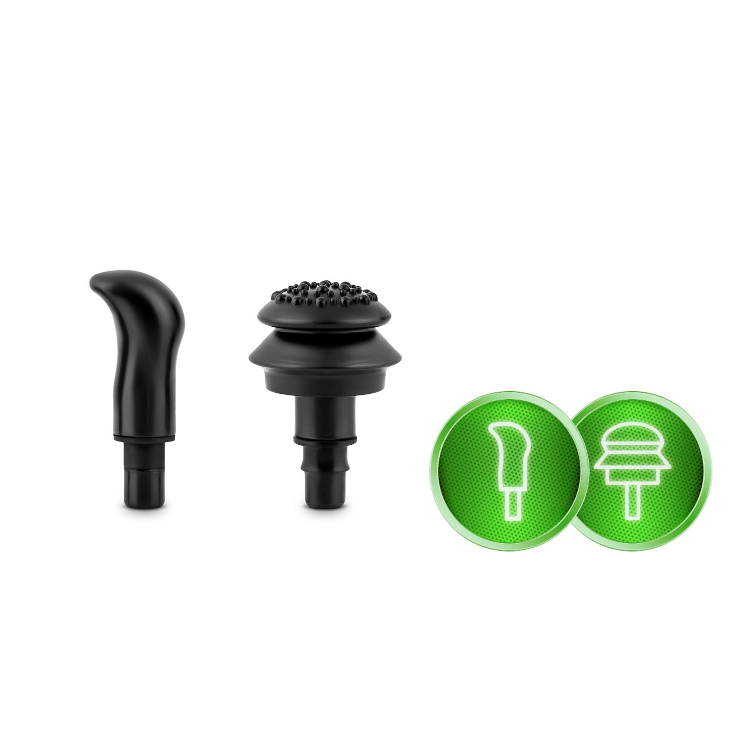 Vilica za področje hrbtenice in Ahilove tetive, kroglična za velike mišice, ploščata za zgoščena tkiva, projektil za točkovni pritisk in drugi specialni nastavki.