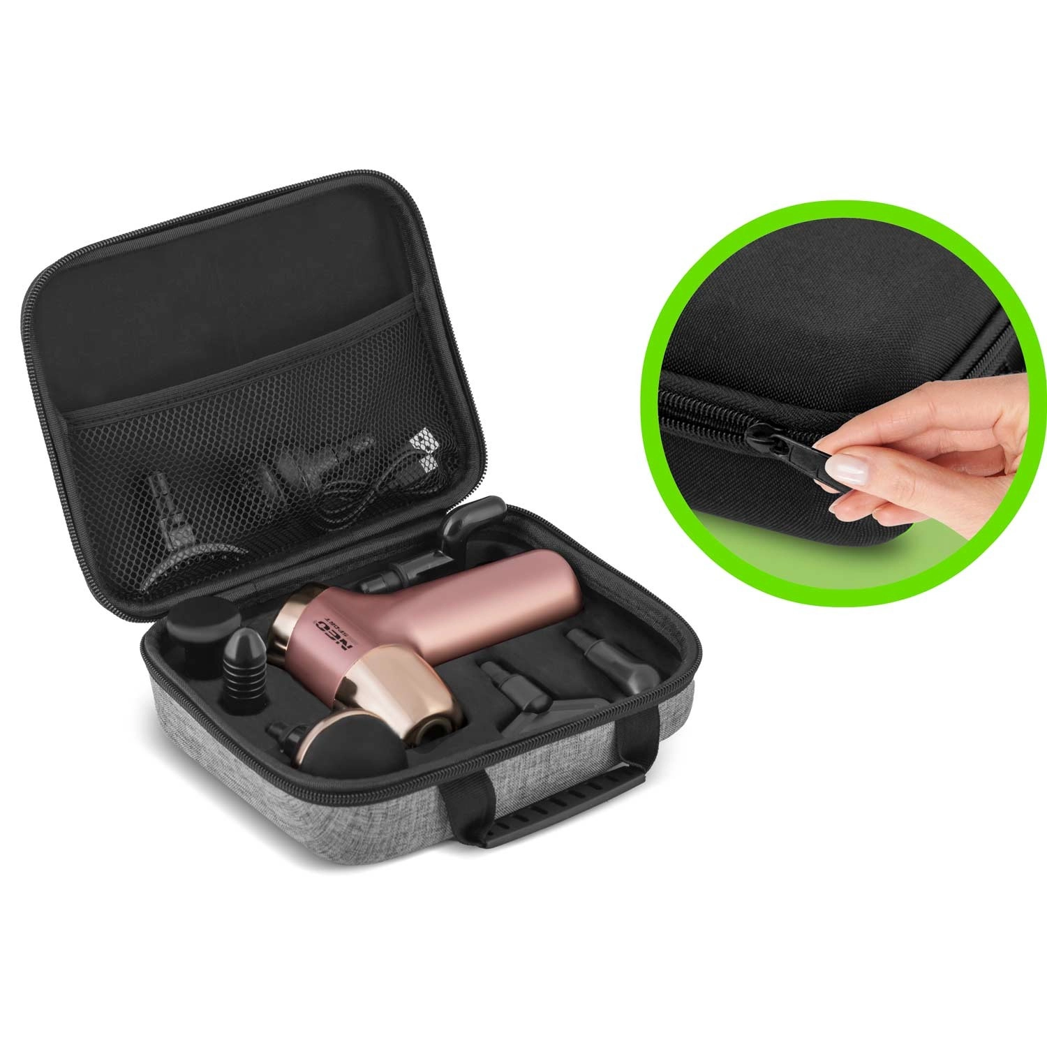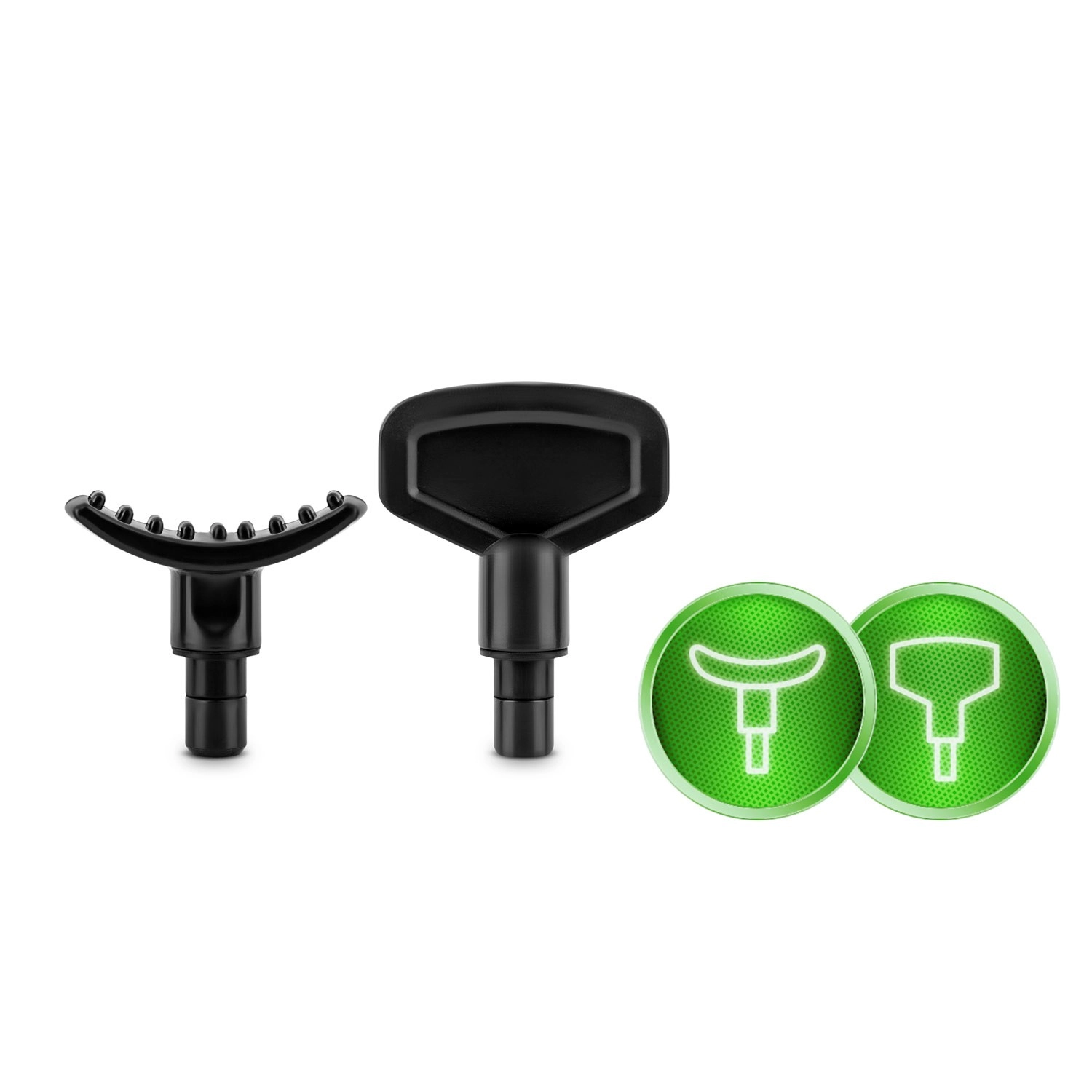 Del paketa je 8 specializiranih nastavkov za različne mišične skupine, elegantna tekstilna potovalna torbica in polnilni kabel USB‑C. LCD-zaslon omogoča preprosto spremljanje hitrosti in stanja baterije. Varnostni sistem ščiti motor pred preobremenitvijo in samodejno izklopi napravo ob premočnem pritisku.