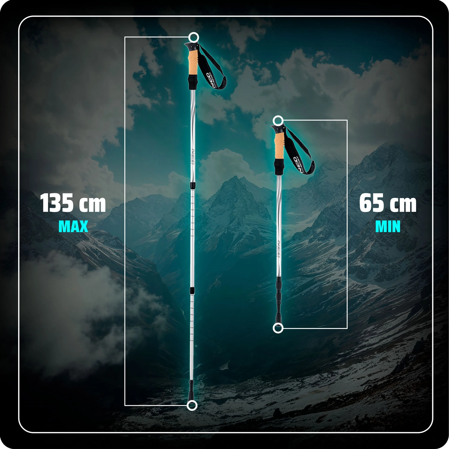 Lahke in trpežne treking palice z nastavitvijo dolžine 65–135 cm za pohodništvo in nordijsko hojo. Ponuja antivibracijski sistem ANTYSHOCK, ergonomske plutovinaste ročaje, nastavljiv pašček in zamenljive nastavke za različne podlage. Izdelane iz aluminijeve zlitine AL 7075 za visoko trdnost pri nizki teži. V kompletu je brezplačen transportni etui.