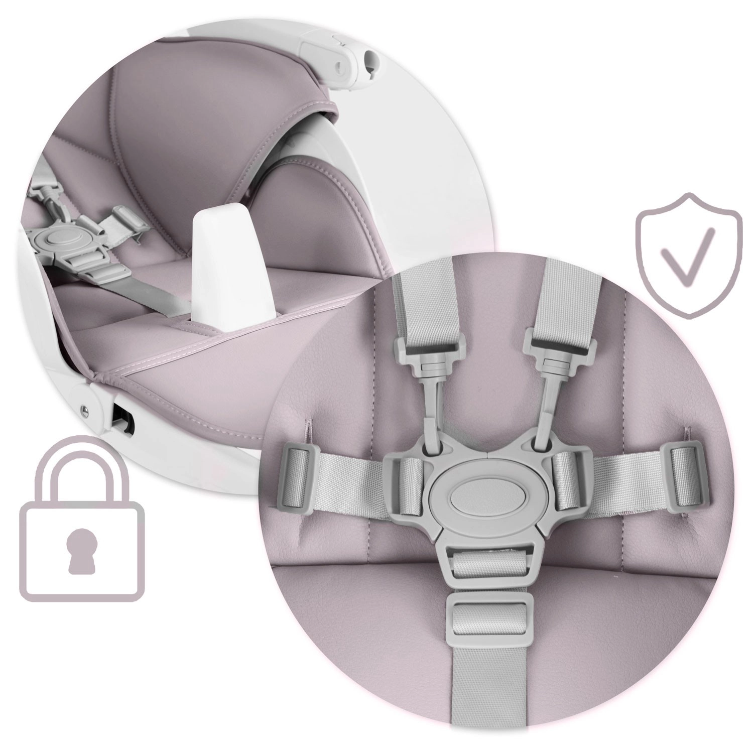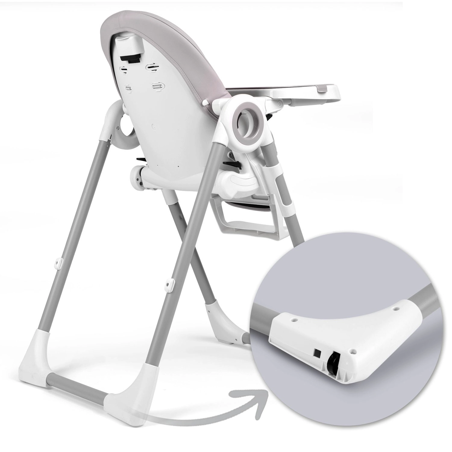Stabilna kovinska konstrukcija s protizdrsnimi elementi, 5-točkovni varnostni pasovi in certifikat EN 14988 zagotavljajo brezskrbno uporabo. Praktična zadnja kolesca olajšajo premikanje po stanovanju, kompaktno zlaganje pa prihrani prostor, ko stolčka ne potrebujete.
