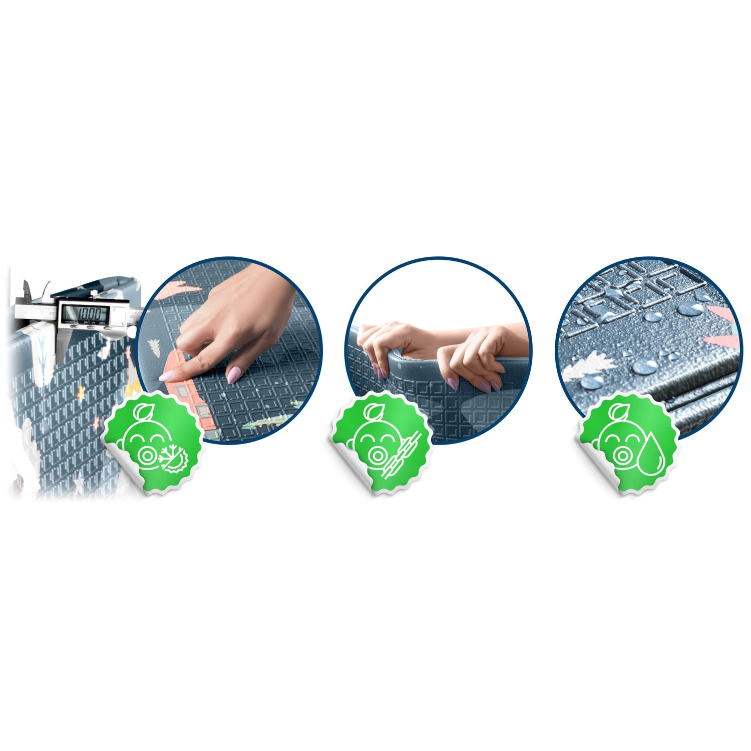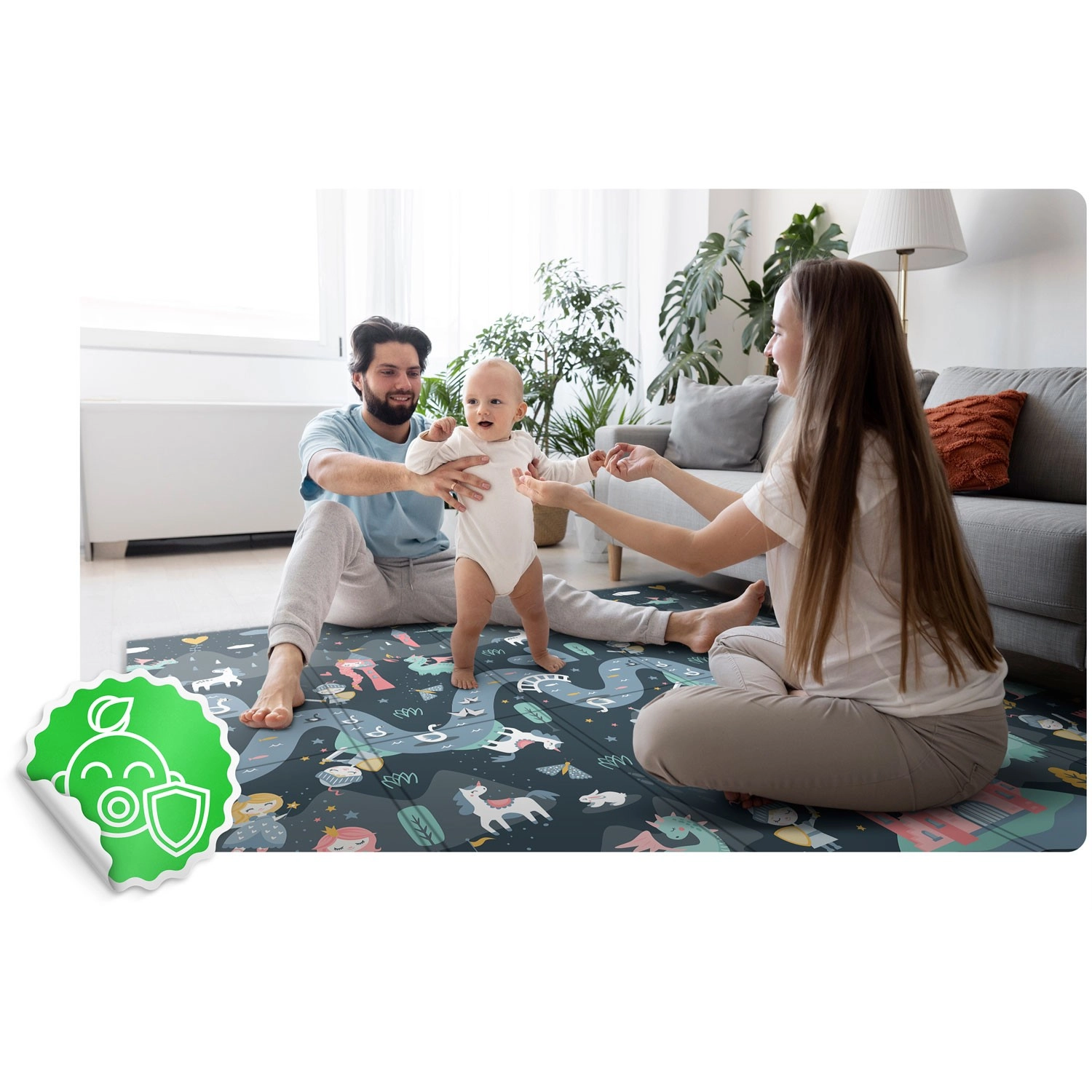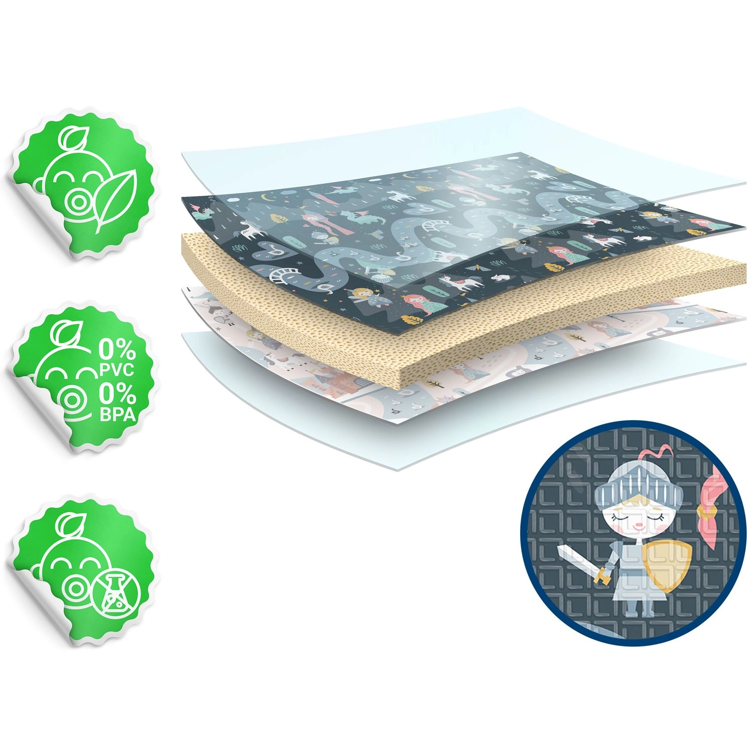 Podloga je vodoodporna in preprosta za čiščenje – dovolj je obris z vlažno krpo. Protizdrsna struktura zagotavlja stabilnost na različnih podlagah, trpežno večkratno zlaganje pa olajša prenašanje in shranjevanje doma, v avtomobilu ali pod posteljo. Material ne vsebuje BPA, PVC, ftalatov ali formamida ter izpolnjuje evropske varnostne standarde EN71, vključno s certifikatom CE.