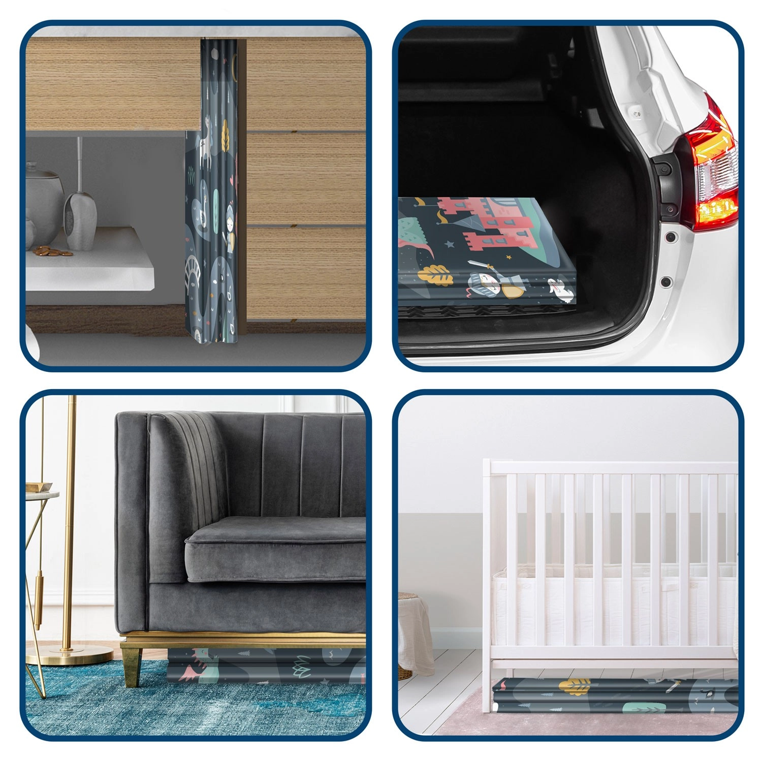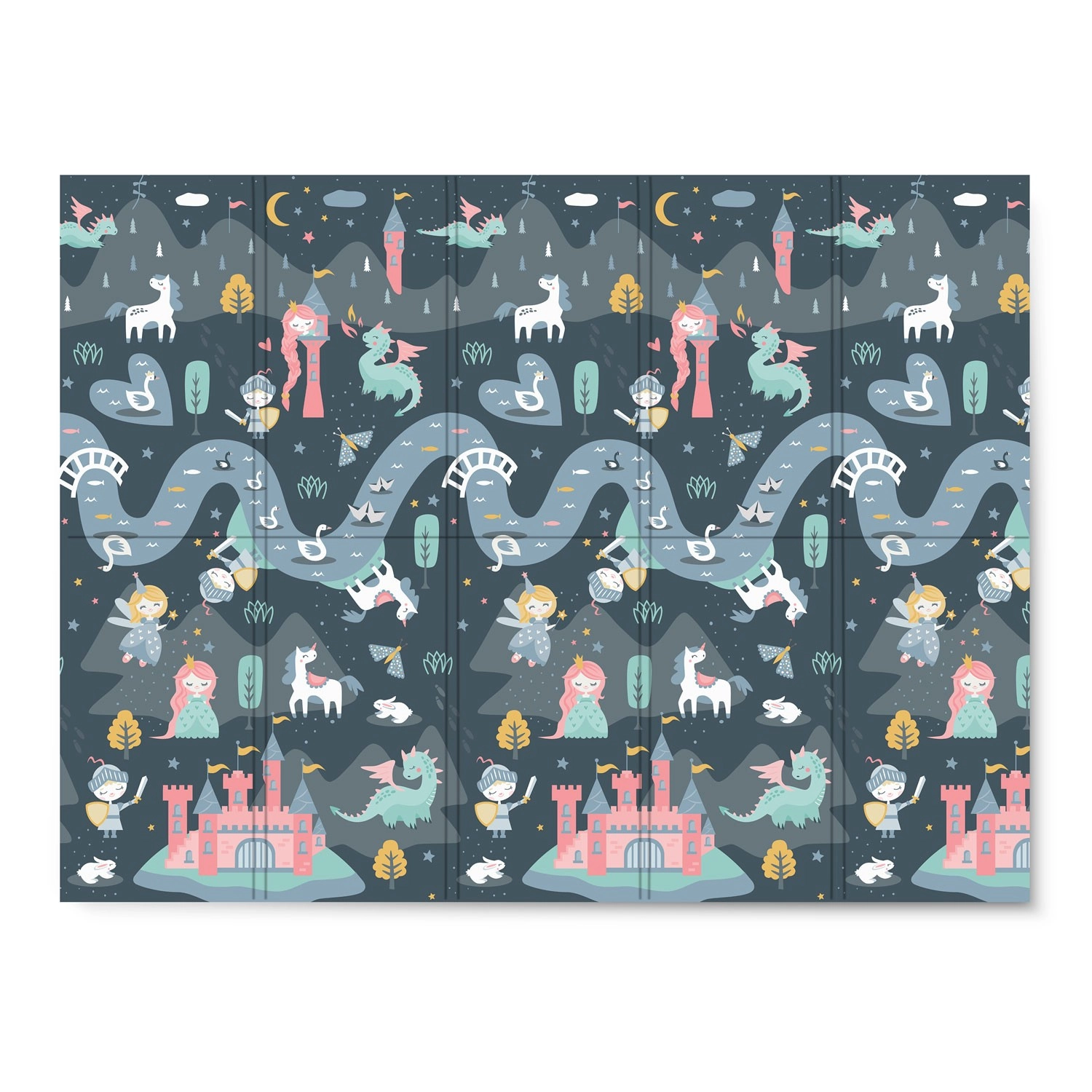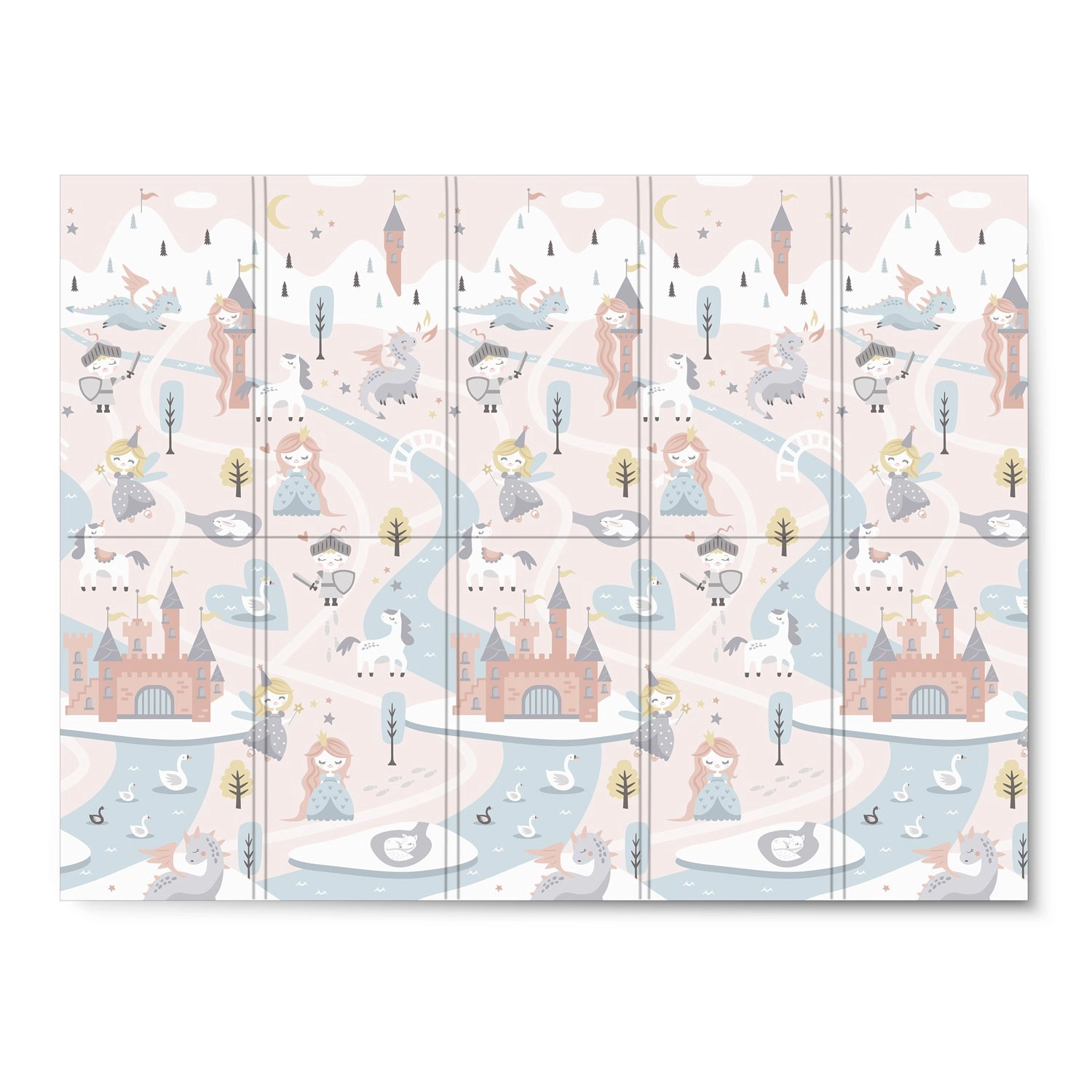 Vsaka stran ponuja drugačen motiv – temnejšo in svetlejšo različico z gradovi, zmaji in samorogi. Zlahka spremenite videz sobe in spodbudite otroško domišljijo pri igri in učenju.