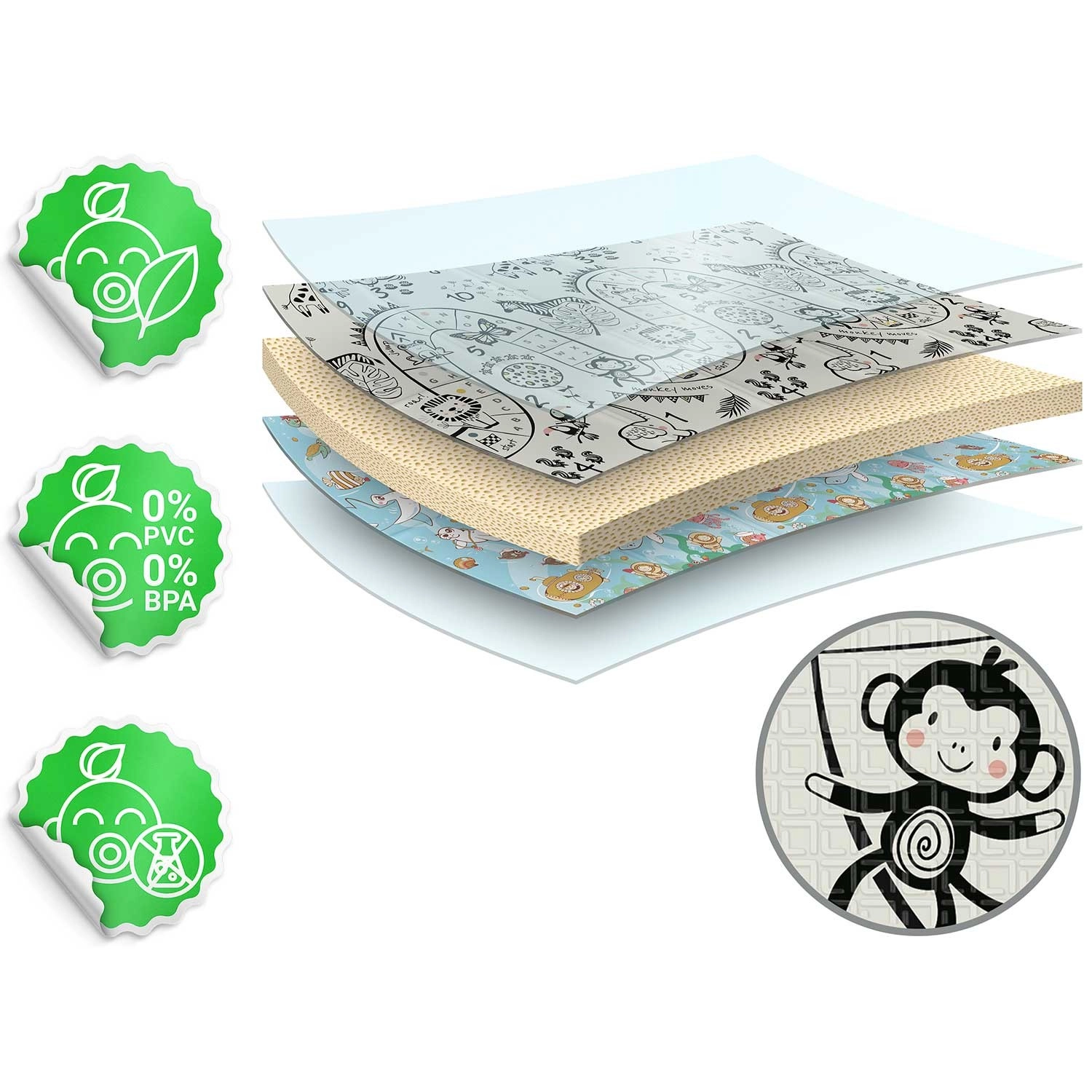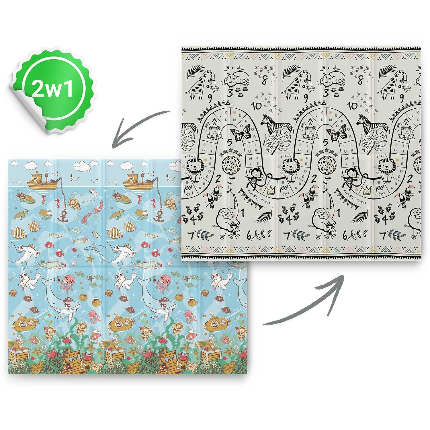 Zložljiva penasta podloga NUKIDO je premišljena do zadnje podrobnosti: debela 1‑centimetrska XPE pena učinkovito absorbira udarce, površina z nežno teksturo preprečuje drsenje, obojestranski potisk (ocean in safari/igrala s številkami) pa podpira zgodnji razvoj, učenje števil in senzorično stimulacijo. Zahvaljujoč vodoodpornemu in pralnemu površju jo očistite v hipu.