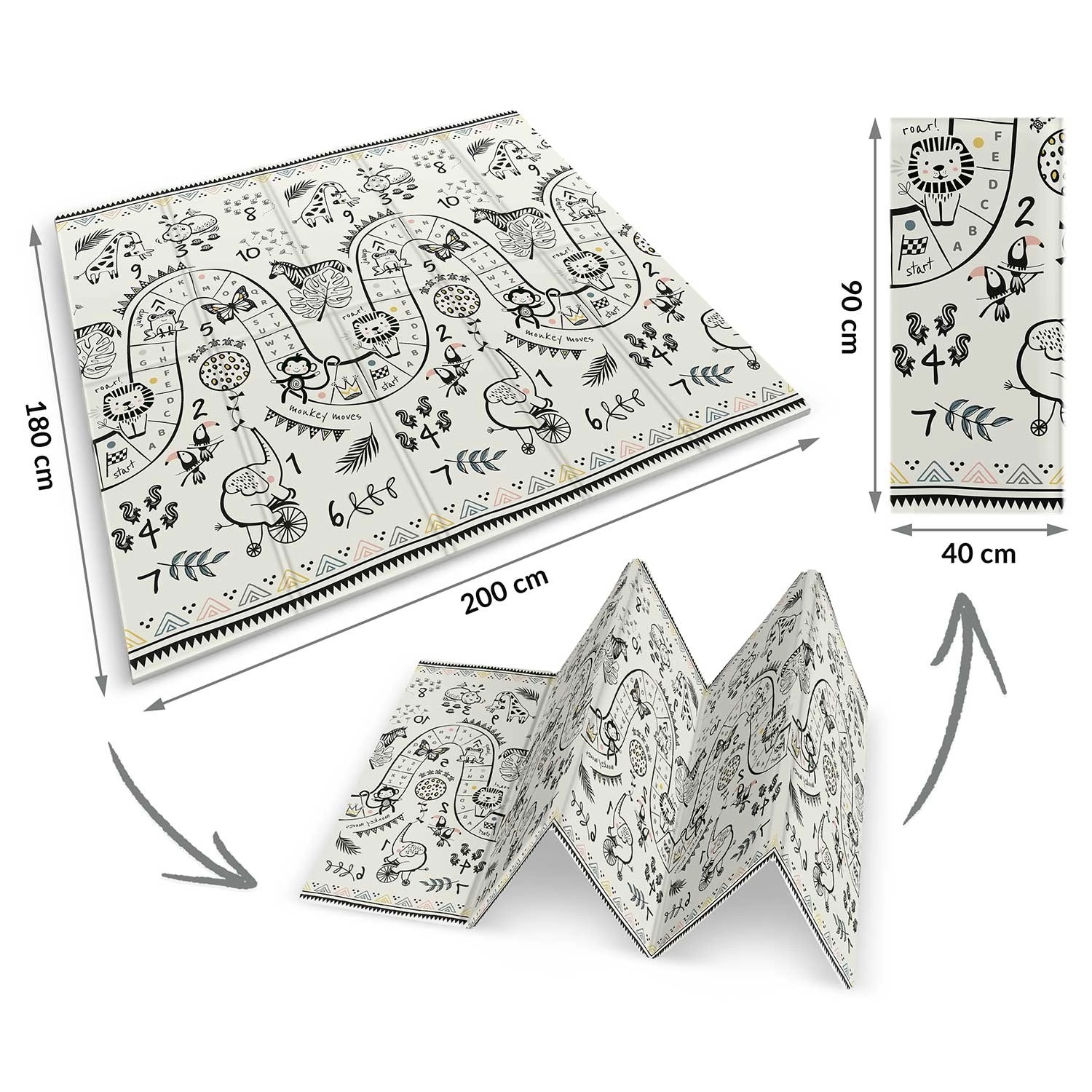 Podloga se zlaga kot harmonika, zato jo zlahka prenašate, shranite pod posteljo ali v avto ter vzamete na obisk, v igralnico ali na piknik. Kakovostno vroče stiskanje povečuje življenjsko dobo, robovi se ne cefrajo, material pa je brez vonja in alergenov.