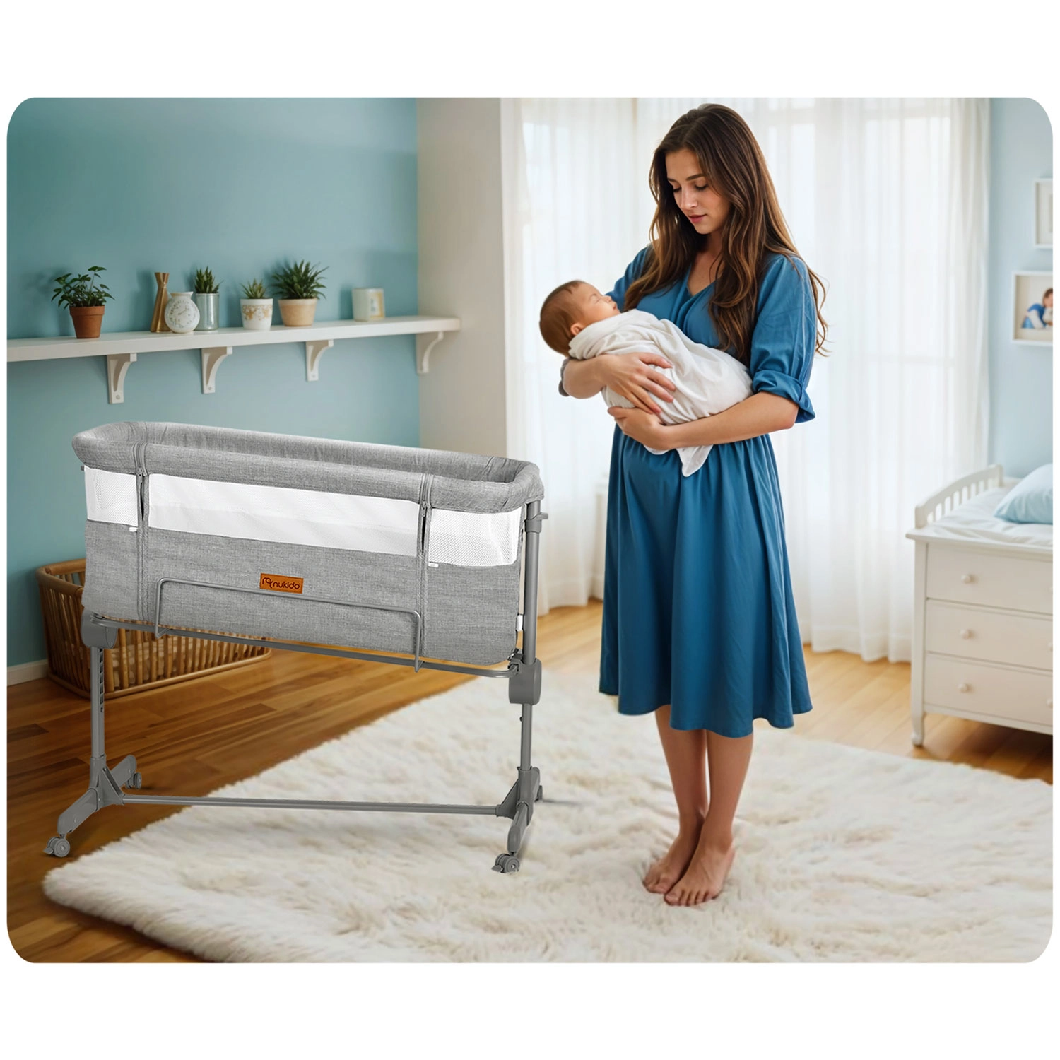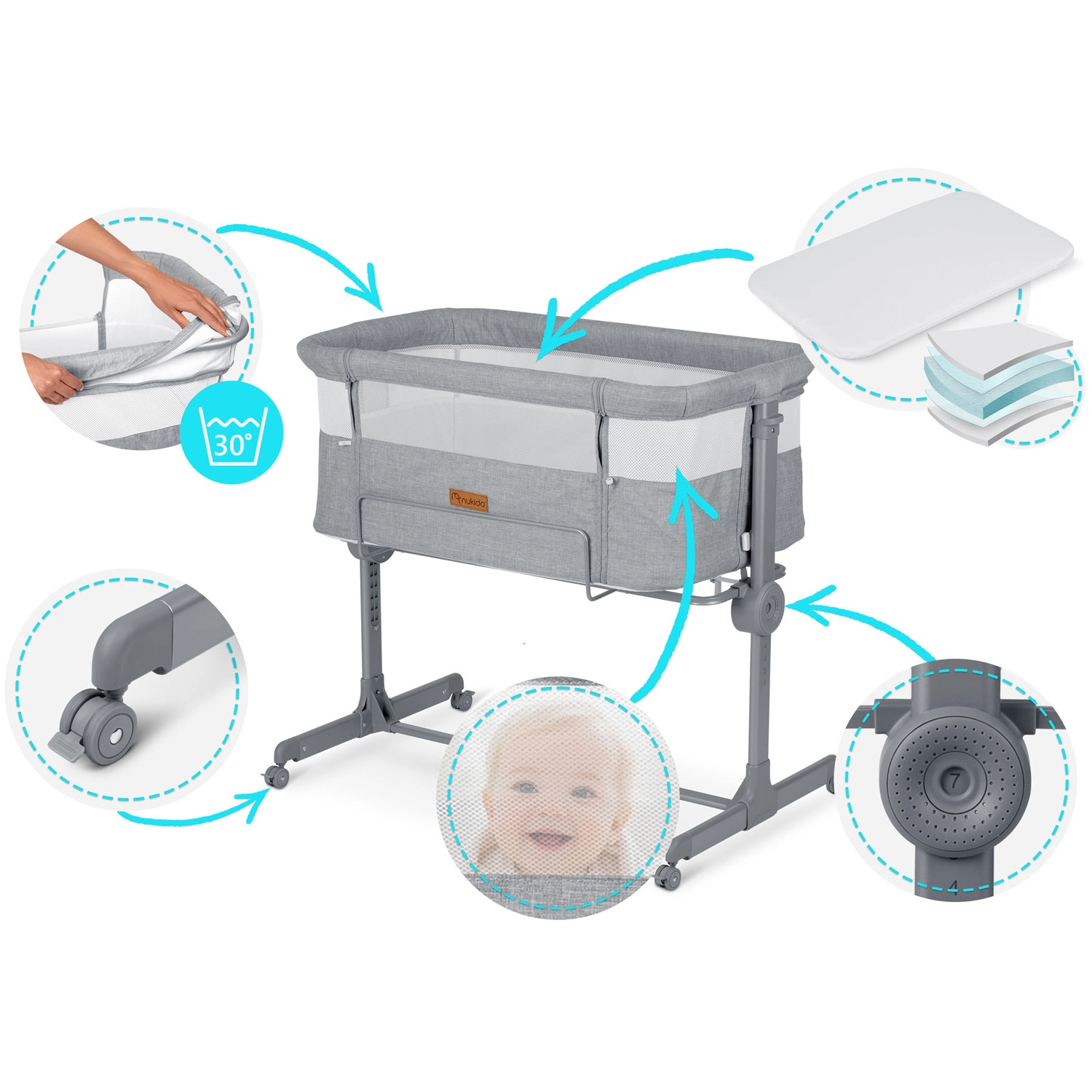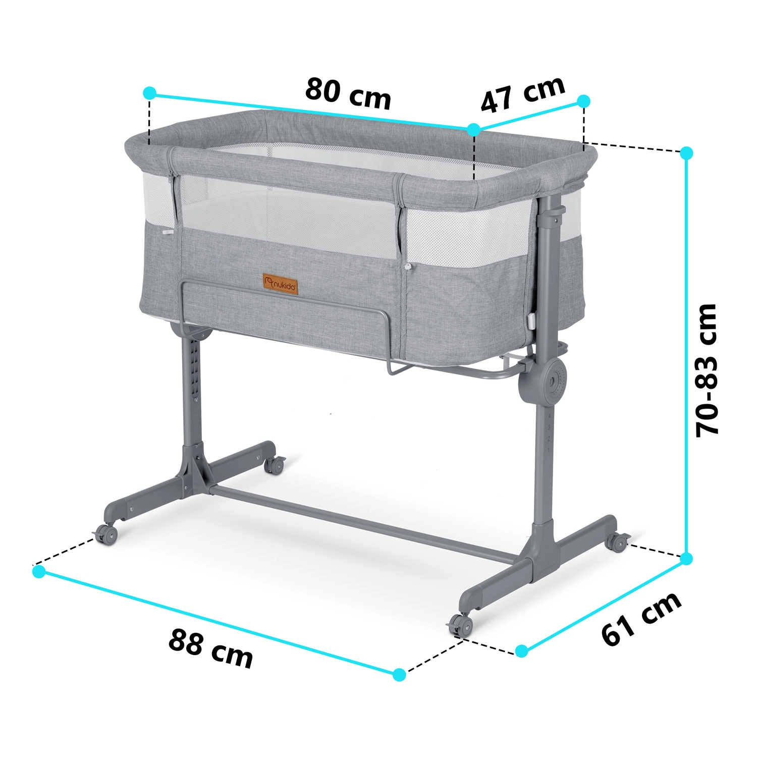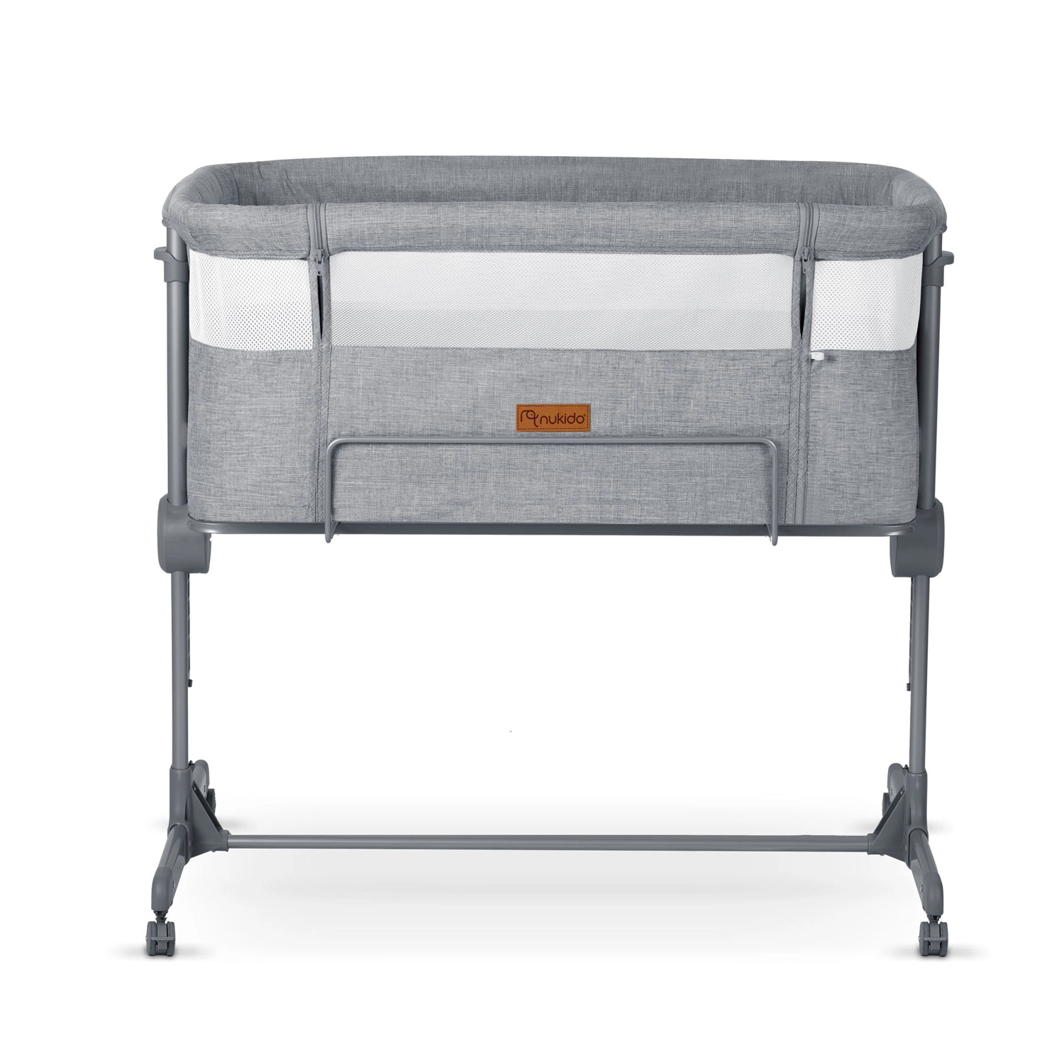 Zahvaljujoč neodvisni nastavitvi višine na obeh straneh preprosto poravnate višino z rodiško posteljo ali ustvarite rahel naklon, ki lahko pomaga pri refluksu. Zložljiva konstrukcija, lahko snemljiv in pralen prevlek ter kolesa z zavorami naredijo NUKIDO praktičnega pomočnika za manjše spalnice in za na pot.