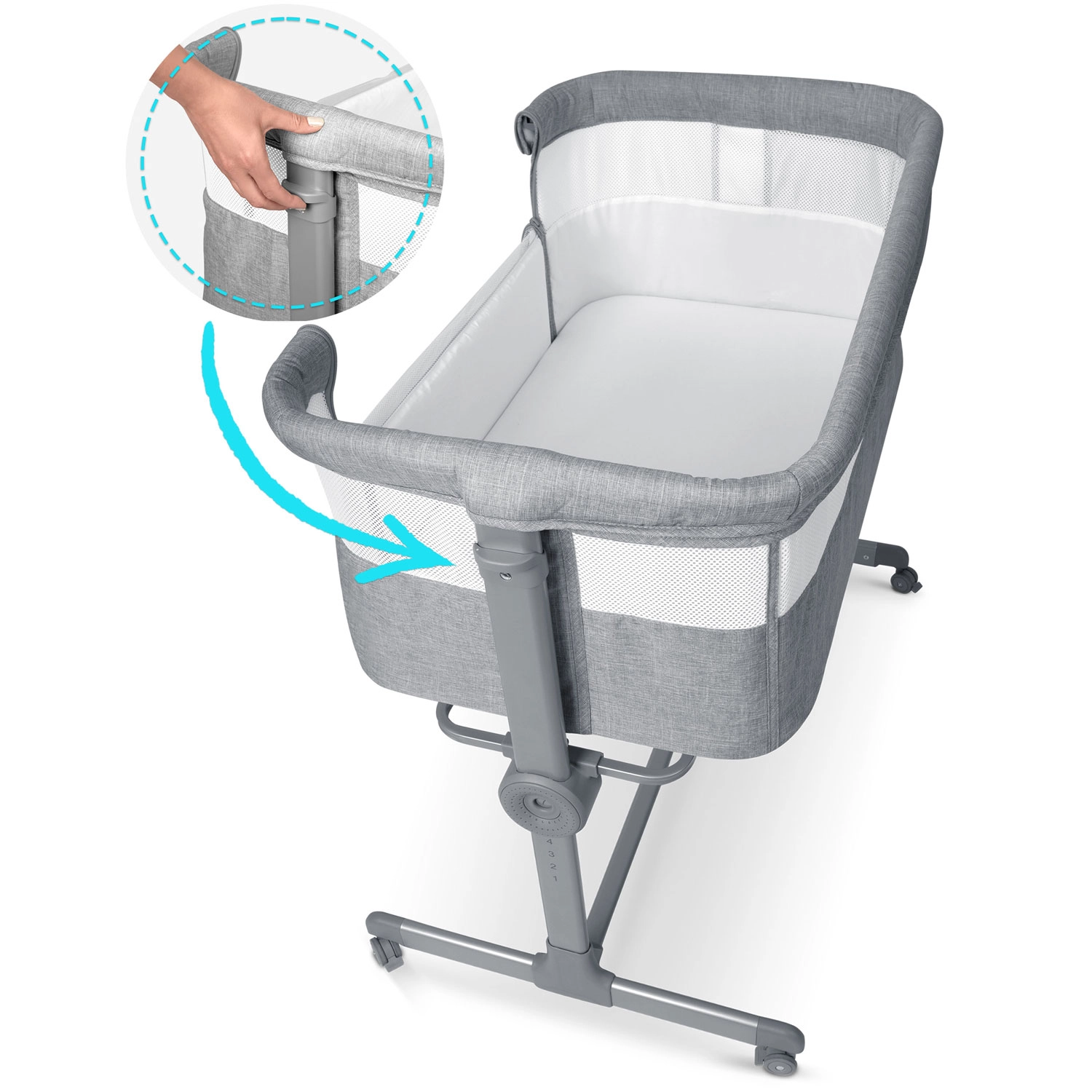 Višino vsake strani preprosto nastavite posebej. Višino lahko poravnate z rodiško posteljo ali ustvarite rahel naklon, koristen na primer pri refluksu.