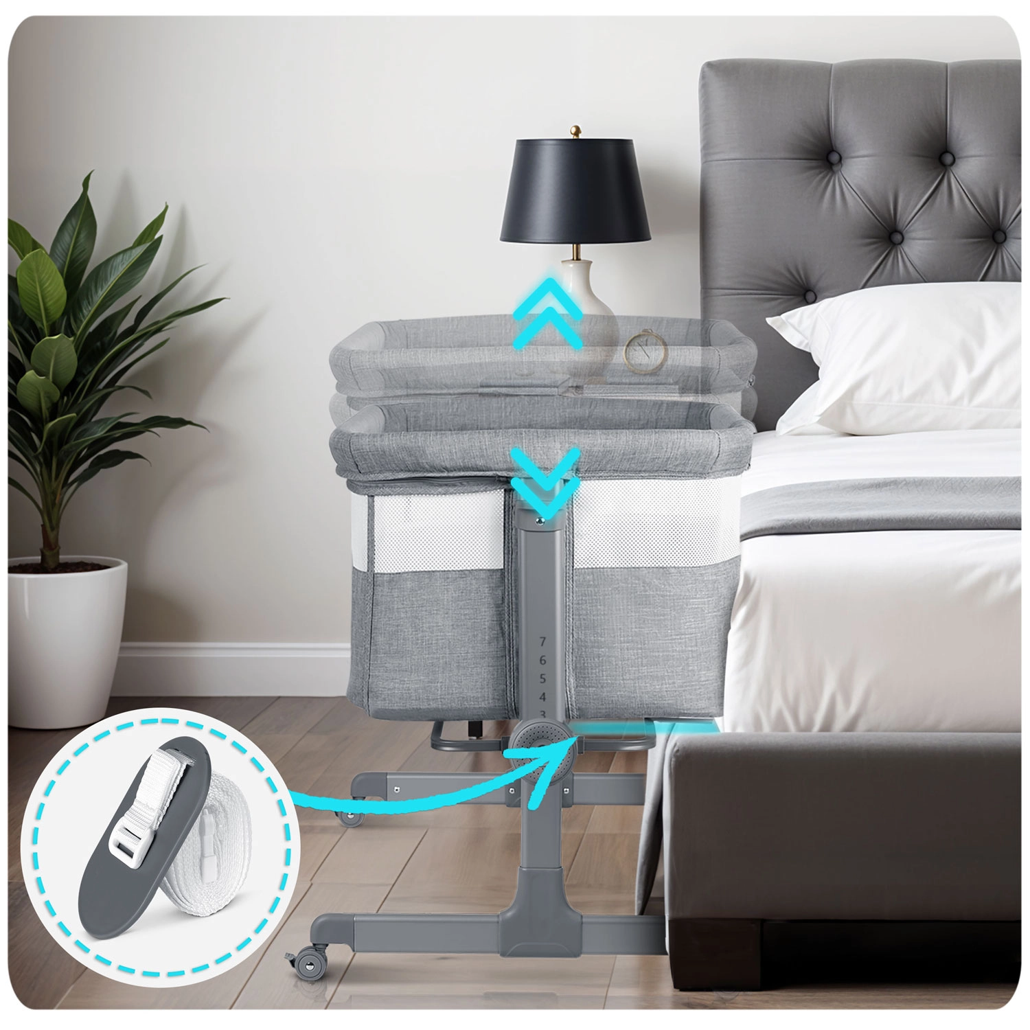 Posteljico zlahka premikate po stanovanju in jo varno fiksirate. Stabilen okvir in kakovostna blokada zagotavljata varno uporabo ob postelji.