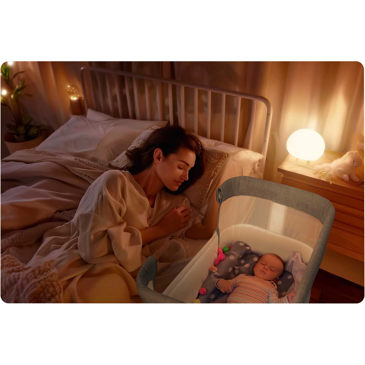 Uživajte v mirnejših nočeh s pristavljeno posteljico NUKIDO, ki združuje udobje, varnost in funkcionalnost. Dojenček spi v svojem prostoru, a ostaja na dosegu roke, kar olajša nočno hranjenje in hitro odzivanje na njegove potrebe. Zračne mrežaste stene zagotavljajo odlično kroženje zraka in boljšo vidljivost.