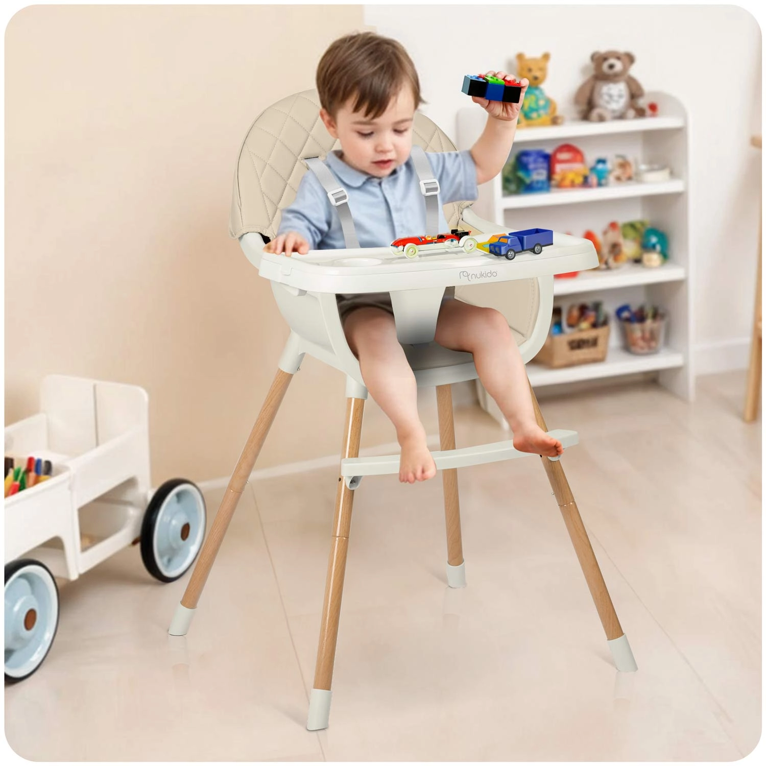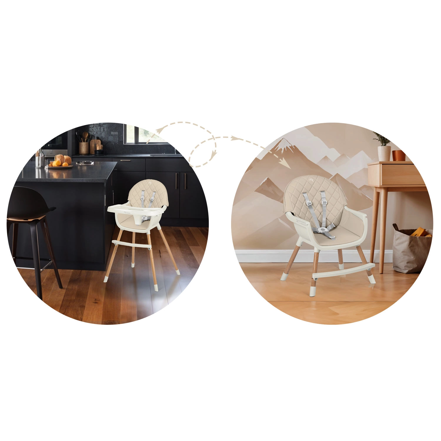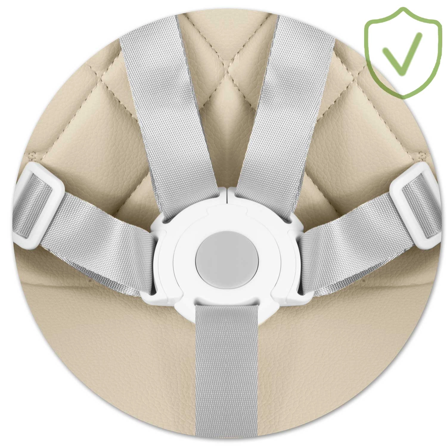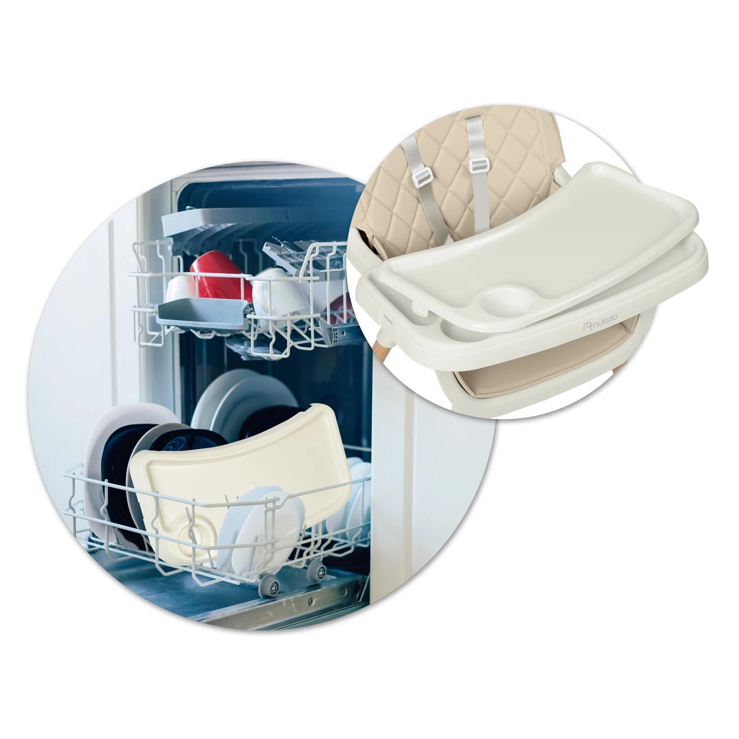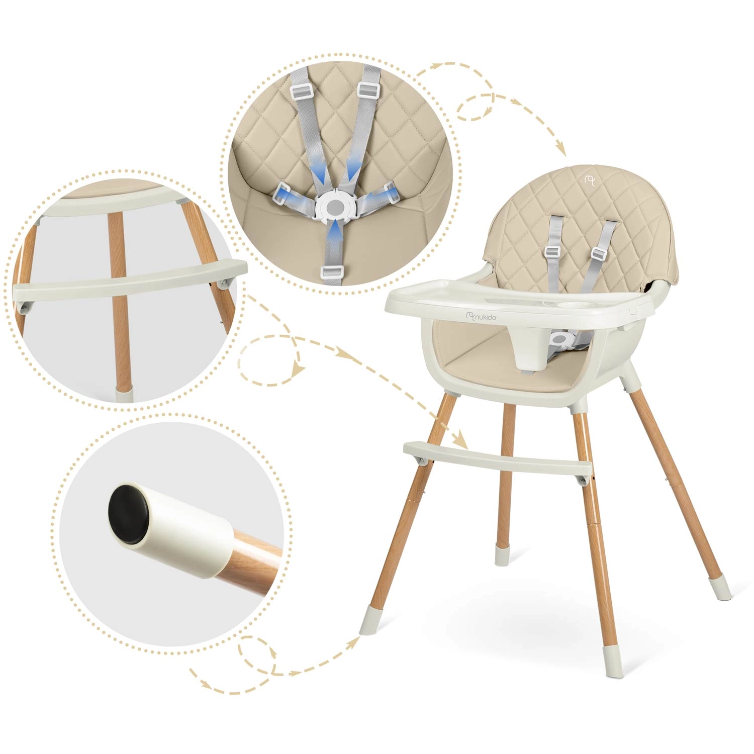 Stilski in varen jedilni stolček NUKIDO Lilo v bež barvi združuje udobje, stabilnost in enostavno vzdrževanje. Ponuja odstranljiv in nastavljiv pladenj z zvišanimi robovi, 5-točkovni varnostni pas, stabilne noge s protizdrsnimi končniki ter udobno oblazinjenje, ki ne vpija nečistoč. Odličen za hranjenje, igro in učenje.