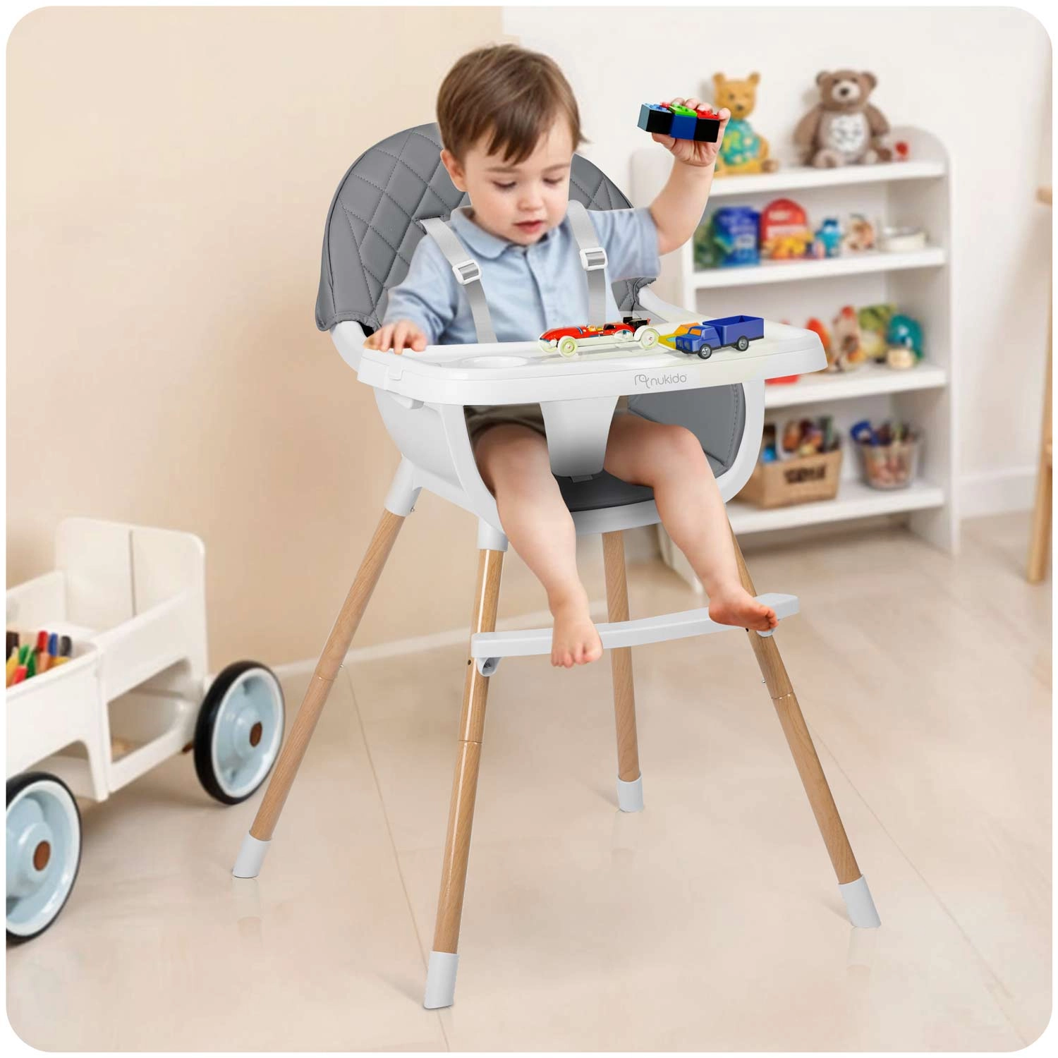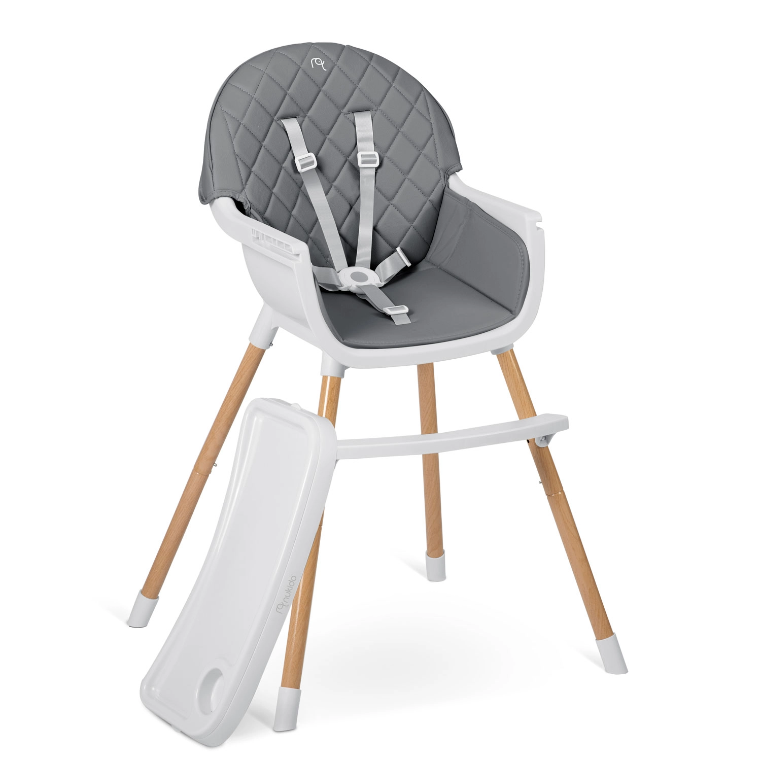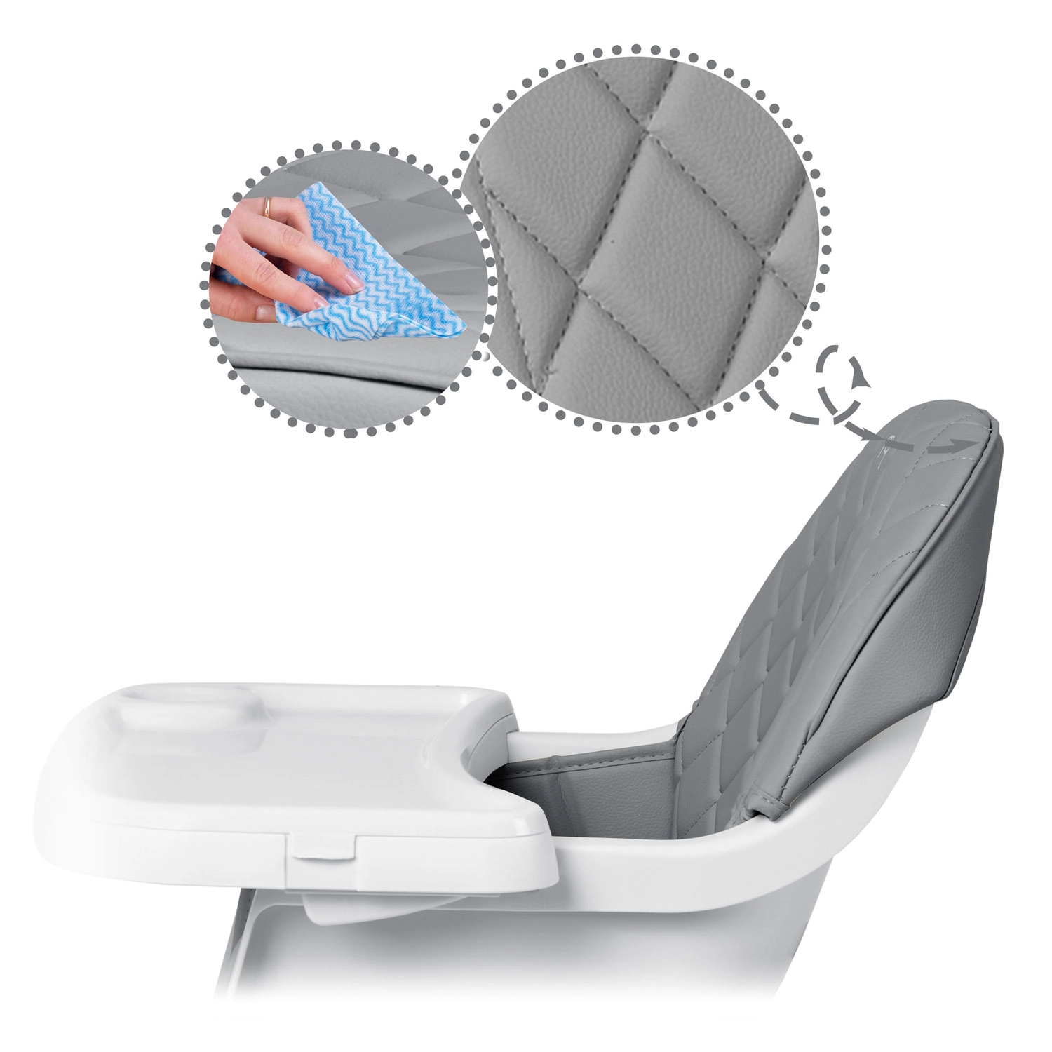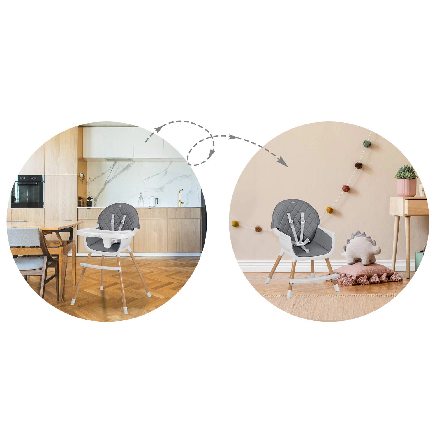 Nastavljiv in odstranljiv pladenj, čvrsta opora za noge in stabilna konstrukcija omogočajo uporabo kot visok jedilni stolček ali nižji sedež. Idealno za hranjenje, risanje, sestavljanje kock in branje.