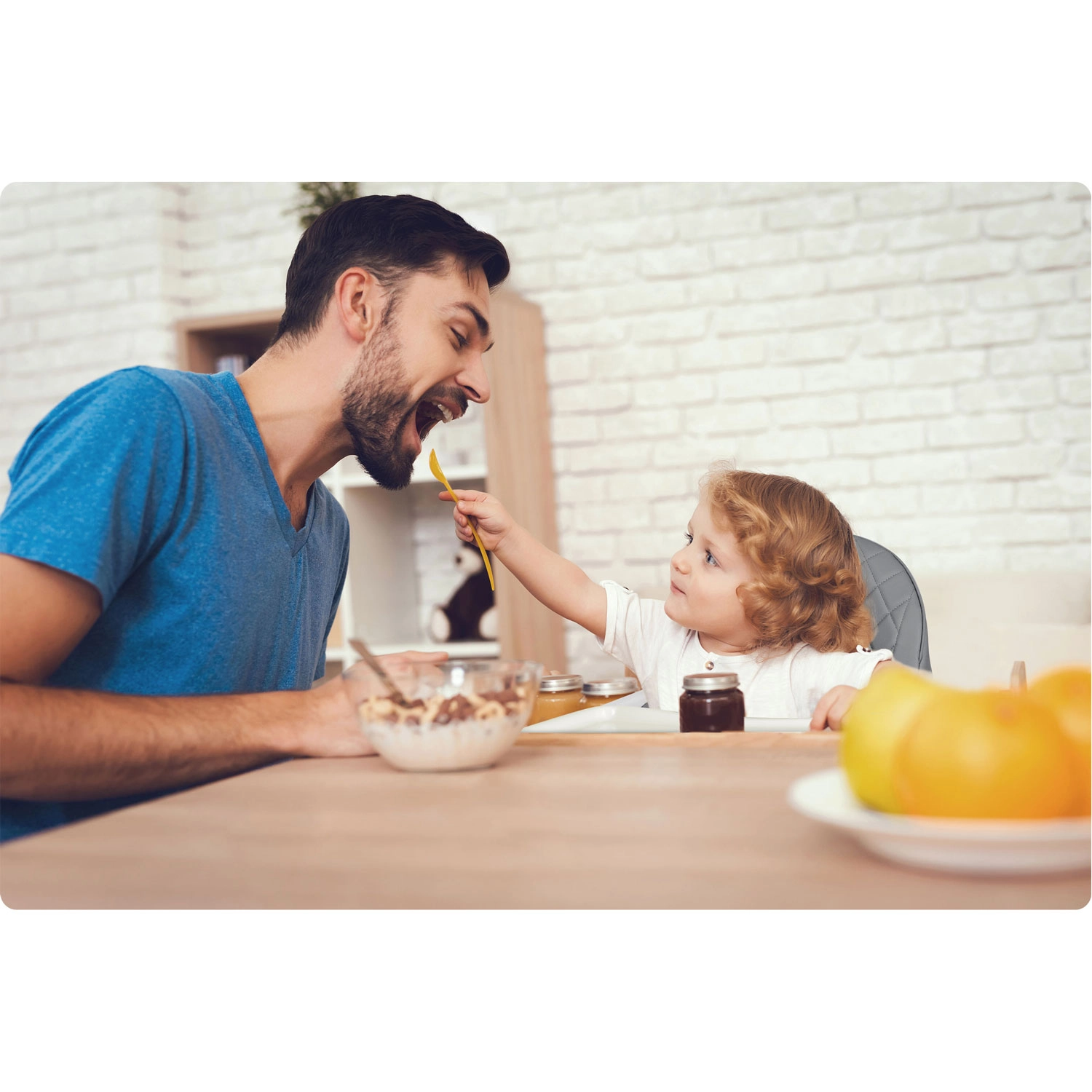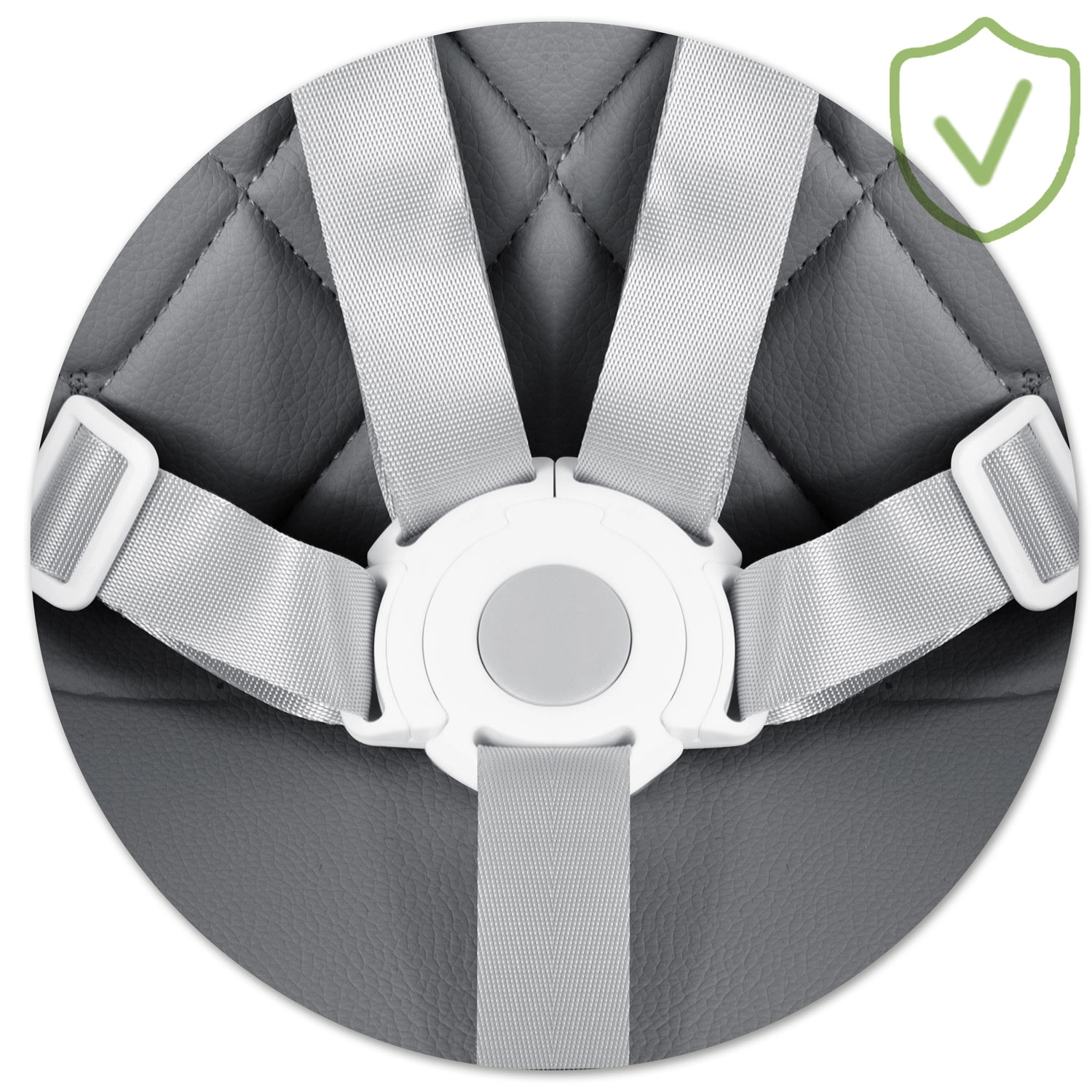 Vgrajeni 5-točkovni pasovi varno in udobno zadržijo otroka v stolčku ter preprečijo nenamerno zdrsovanje. Stolček izpolnjuje strogi evropski standard EN 14988 za brezskrbnost pri vsakem obroku in igri.