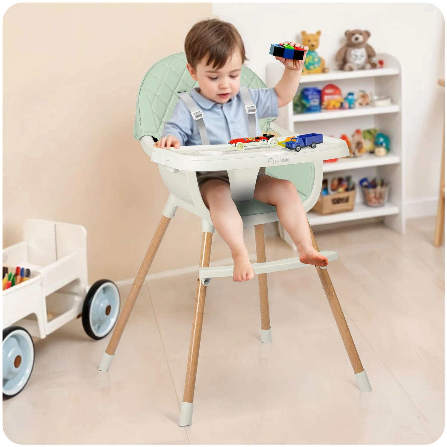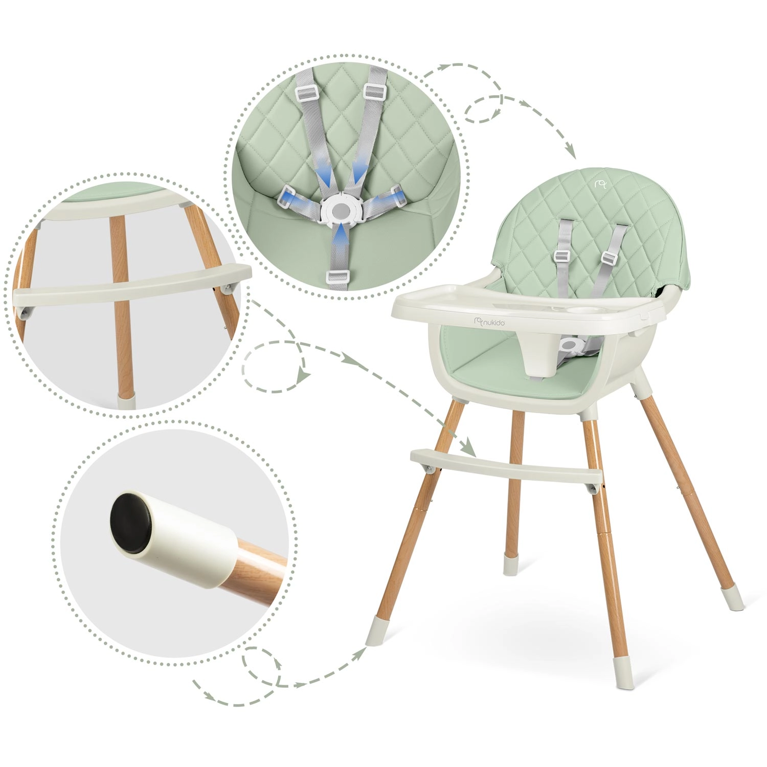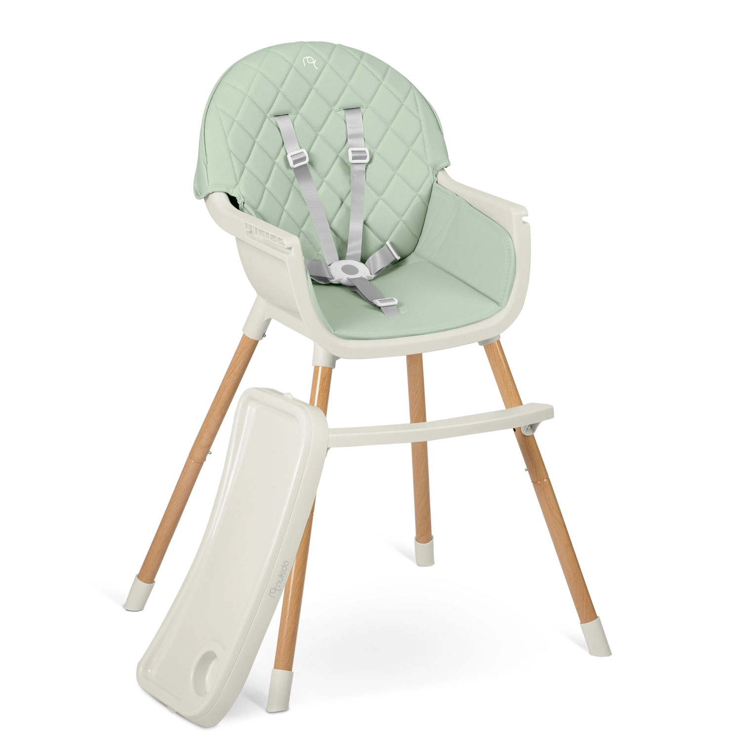 Praktičen otroški jedilni stolček NUKIDO Lilo 3v1 v mentol barvi združuje varnost, udobje in enostavno čiščenje. Ponuja odstranljiv pladenj z vložkom, 5-točkovne varnostne pasove, stabilne noge s protizdrsnimi nastavki in nastavljiv podnožnik. Idealno za hranjenje, igro in učenje – ustreza standardu EN 14988.
