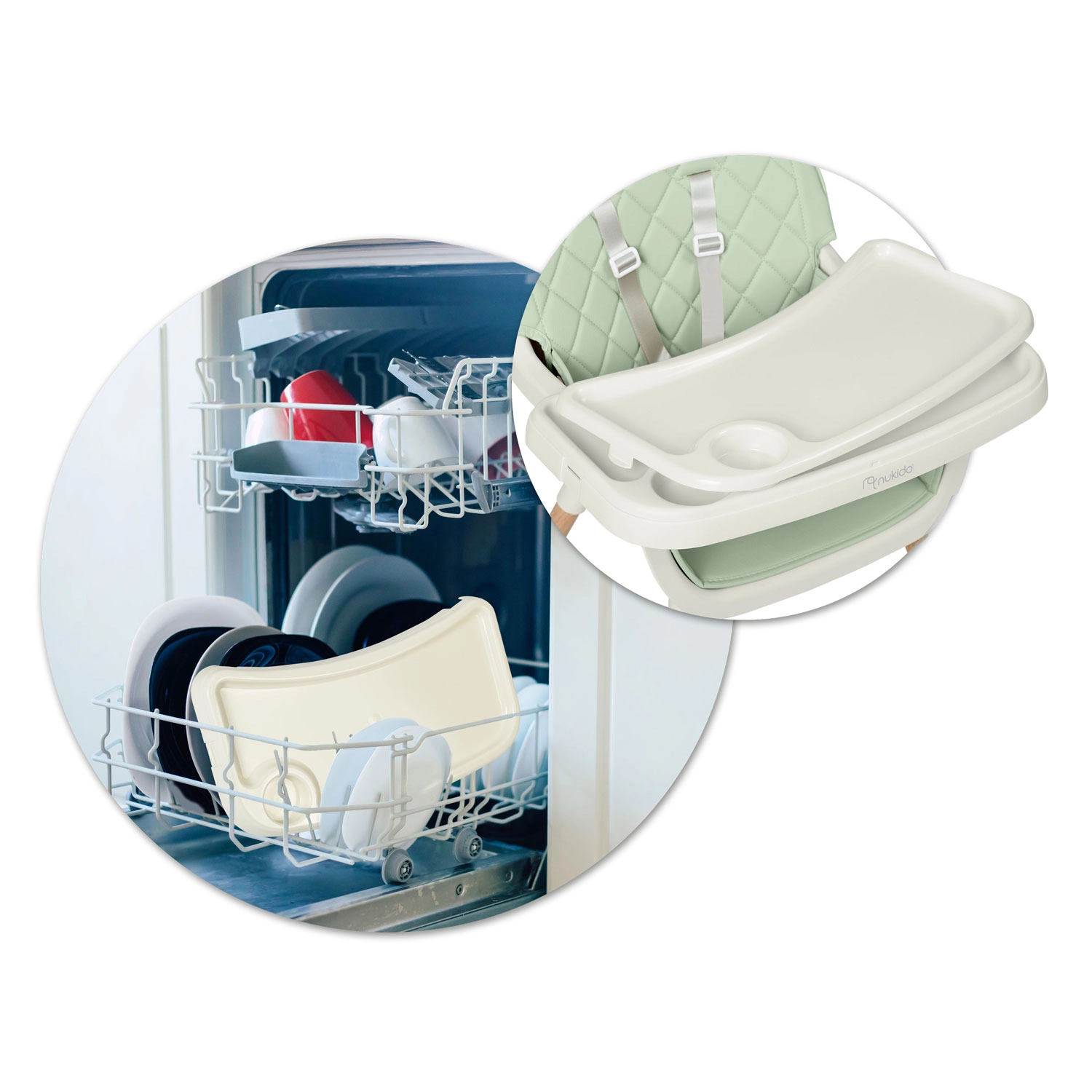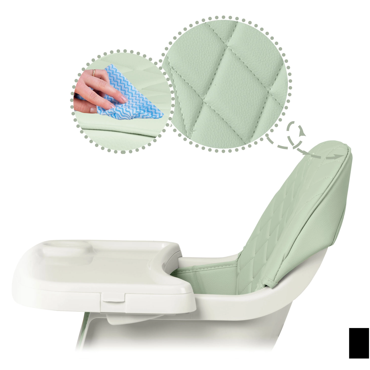 Odstranljiv vložek pladnja lahko pomijete pod vodo ali v pomivalnem stroju. Obloženo sedišče je pralno in ne vpija nečistoč – dovolj je, da ga obrišete.