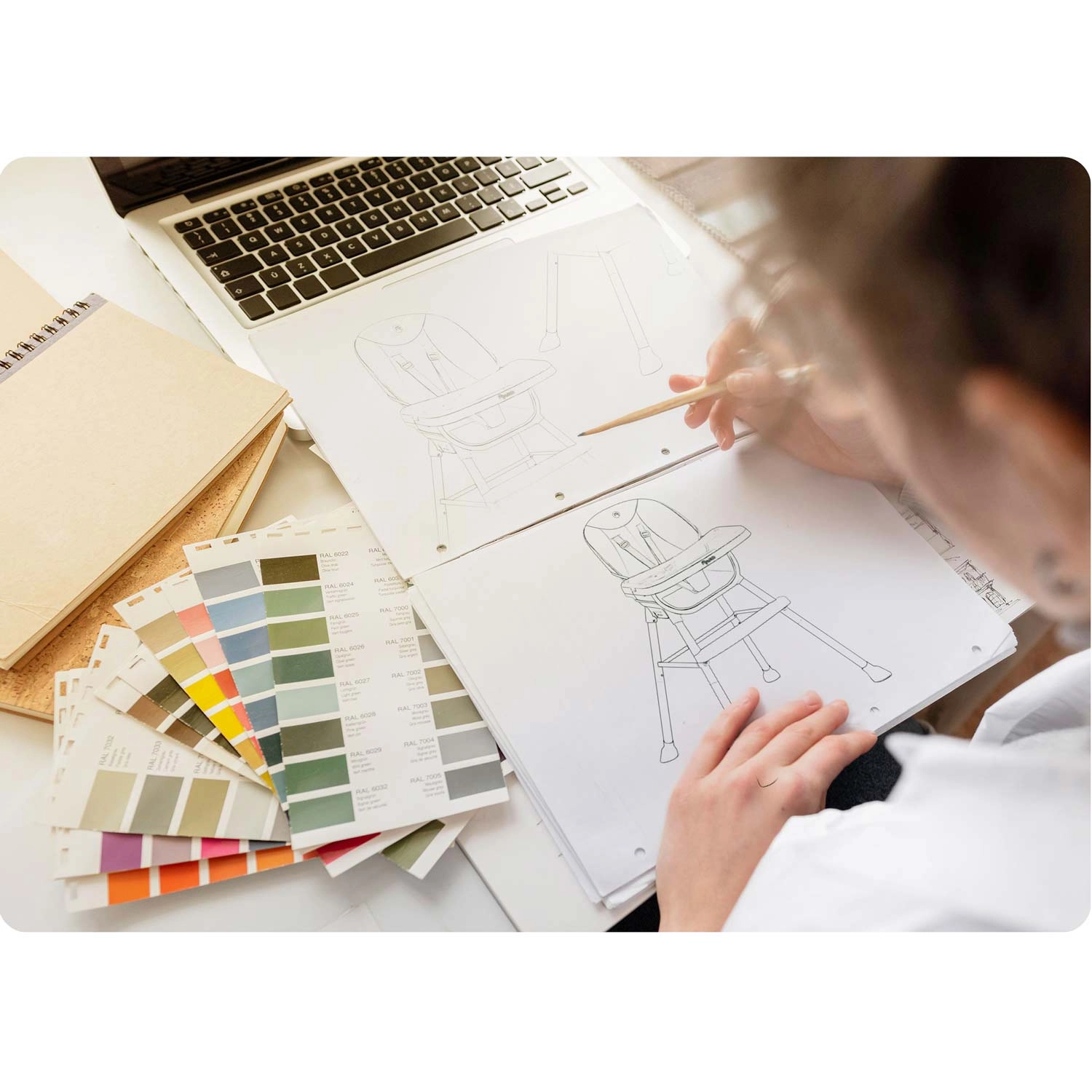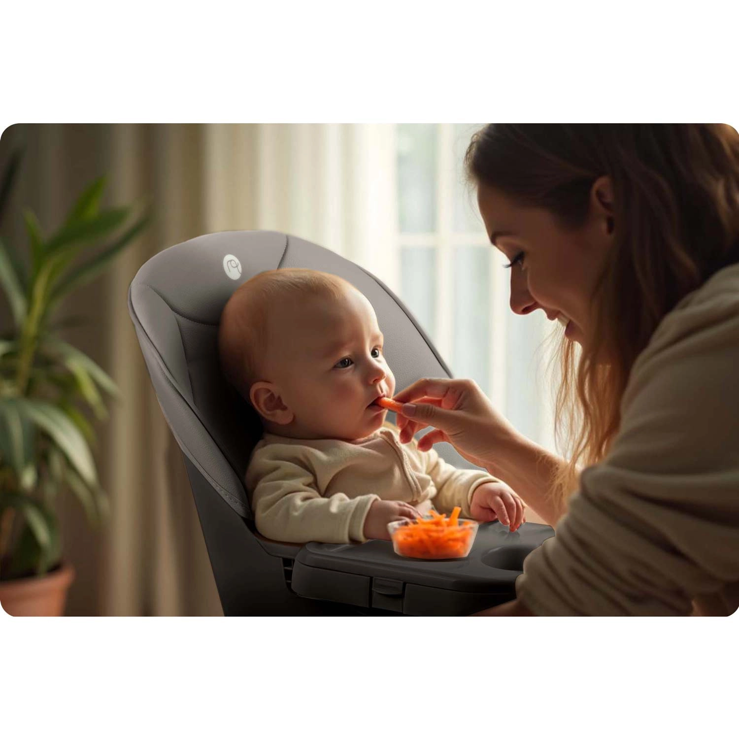 Preklapljajte med visokim stolčkom za hranjenje, nizkim naslanjačem s pladnjem in samostojnim stolčkom za igro in branje. Idealno od prvih kašic do malčka.