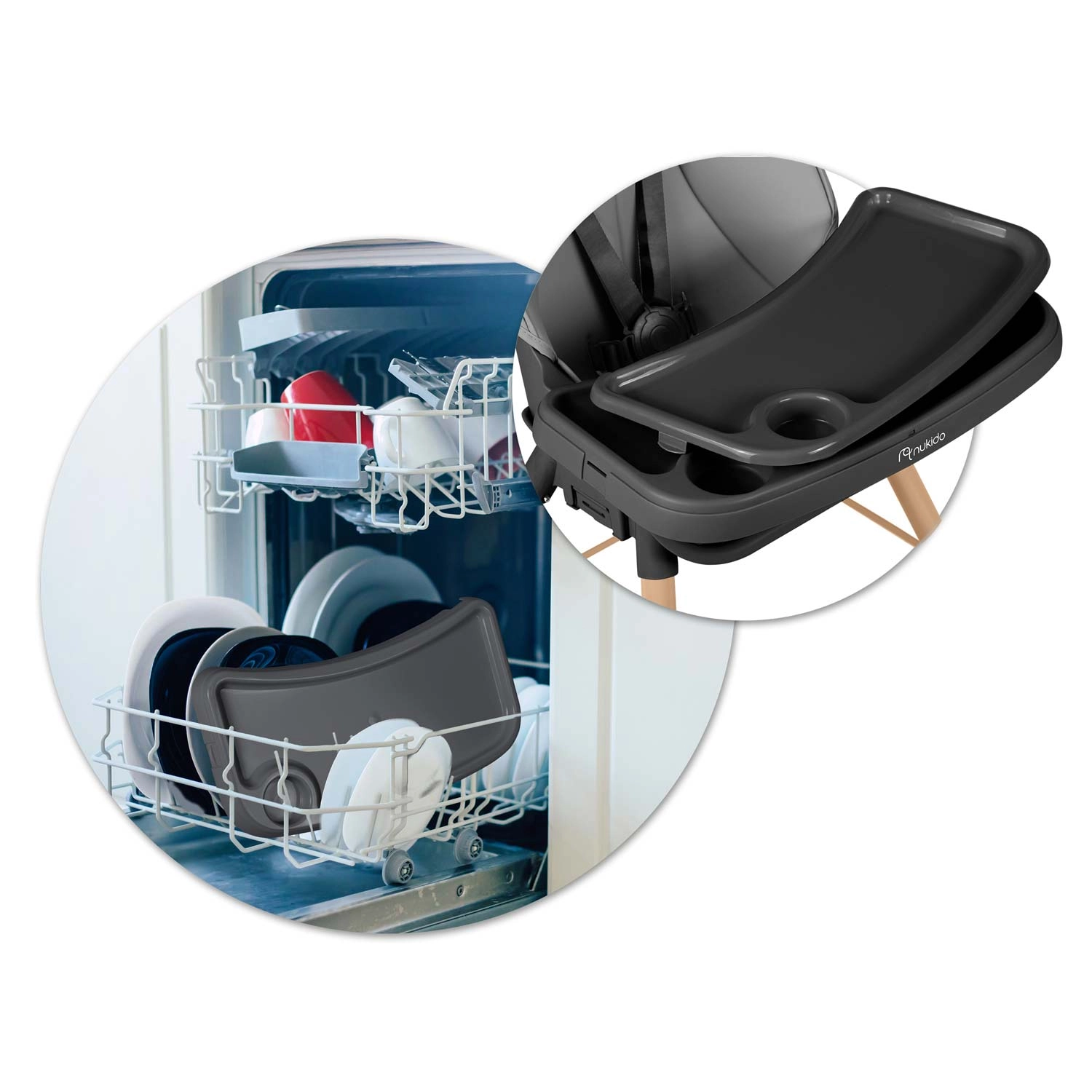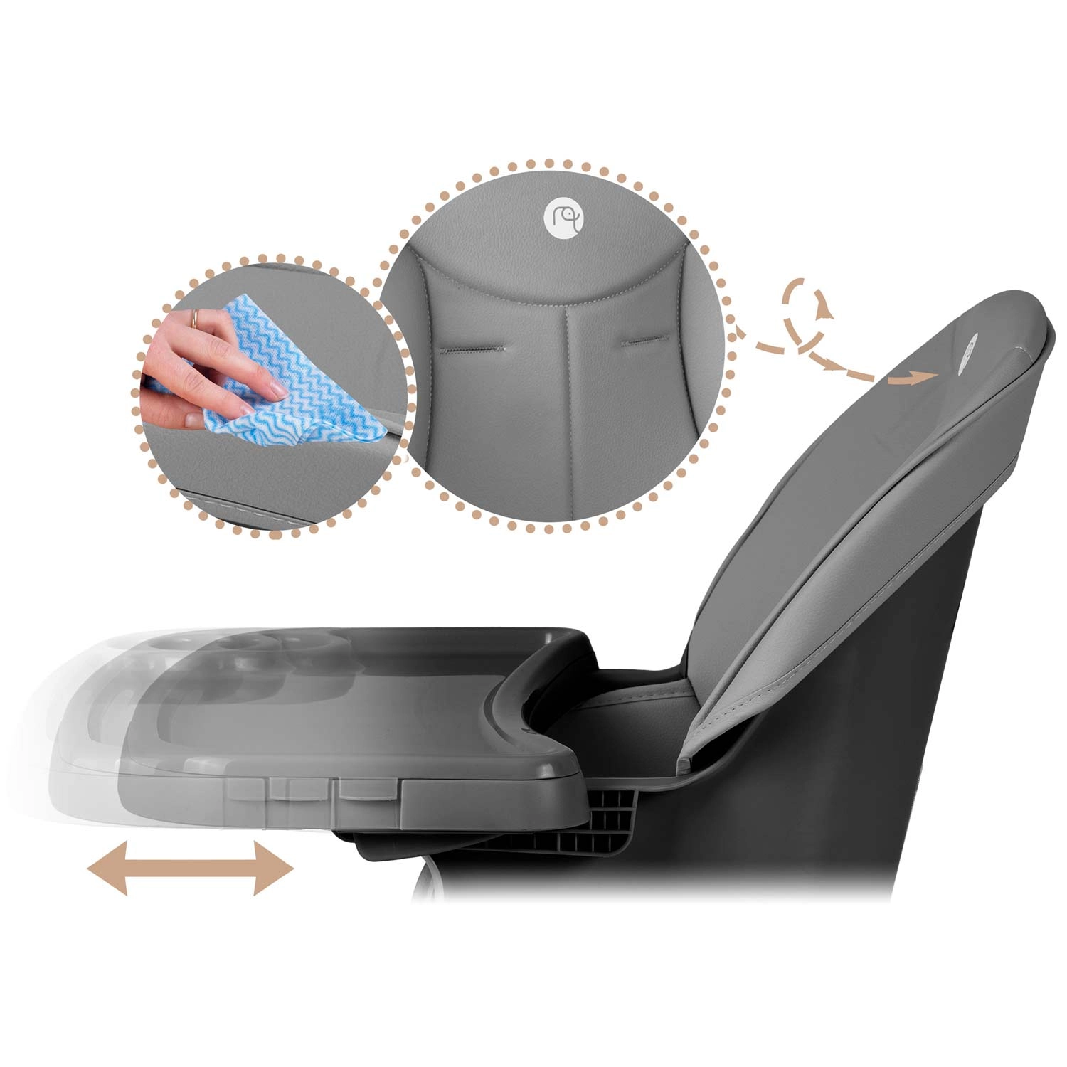 Stabilne noge z nedrsečimi kapicami, čvrsto naslonilo za noge in zanesljivi 5-točkovni pasovi poskrbijo za varnost in udobje otroka pri jedi in igri.