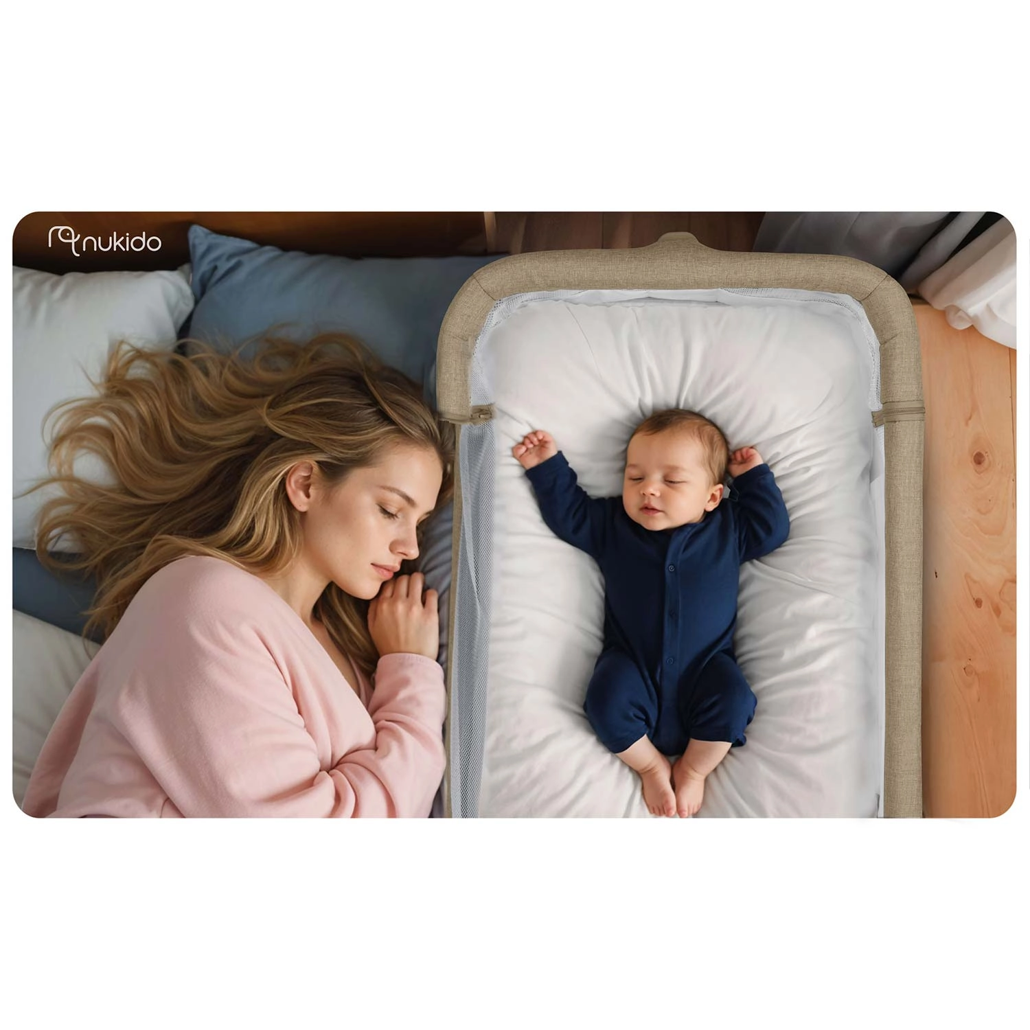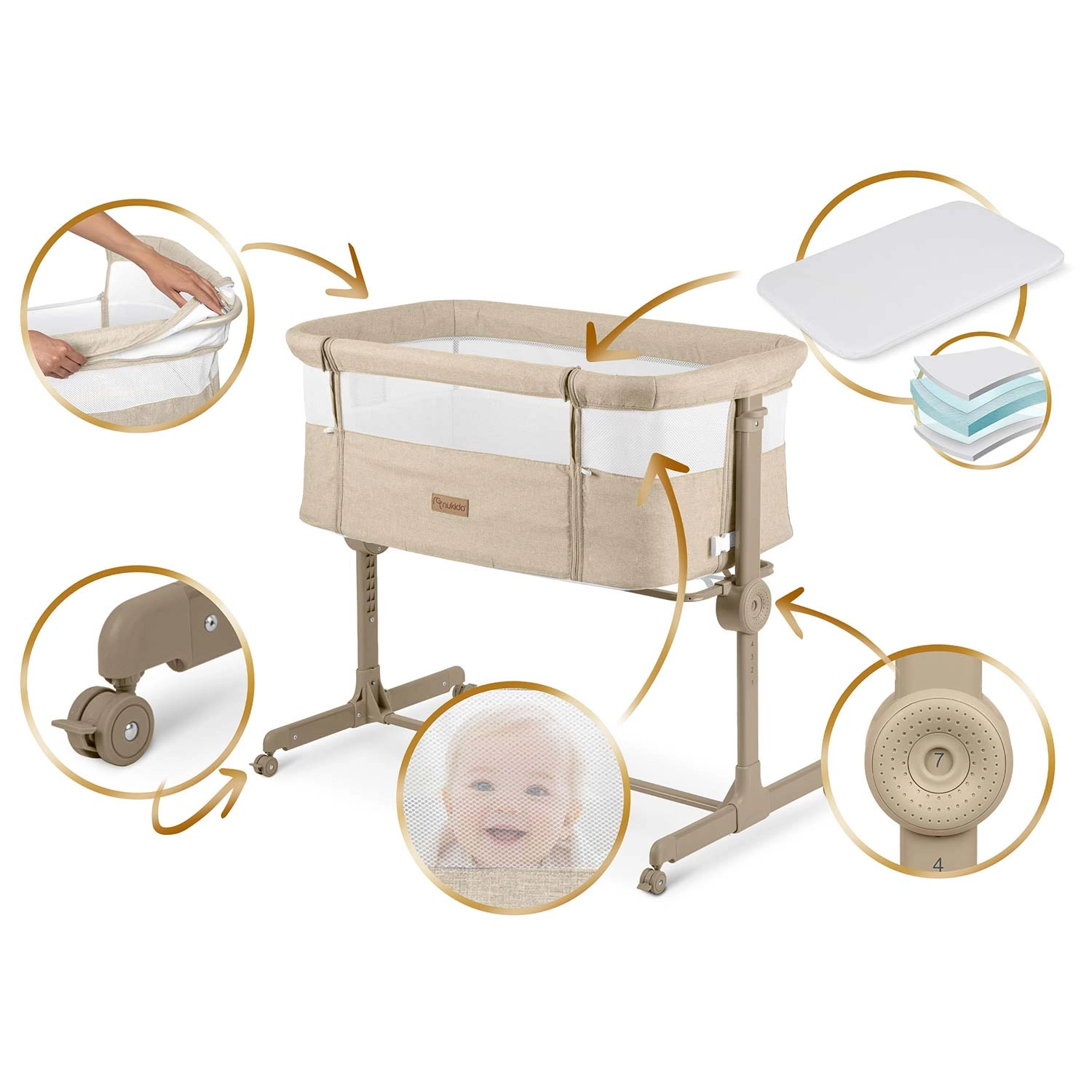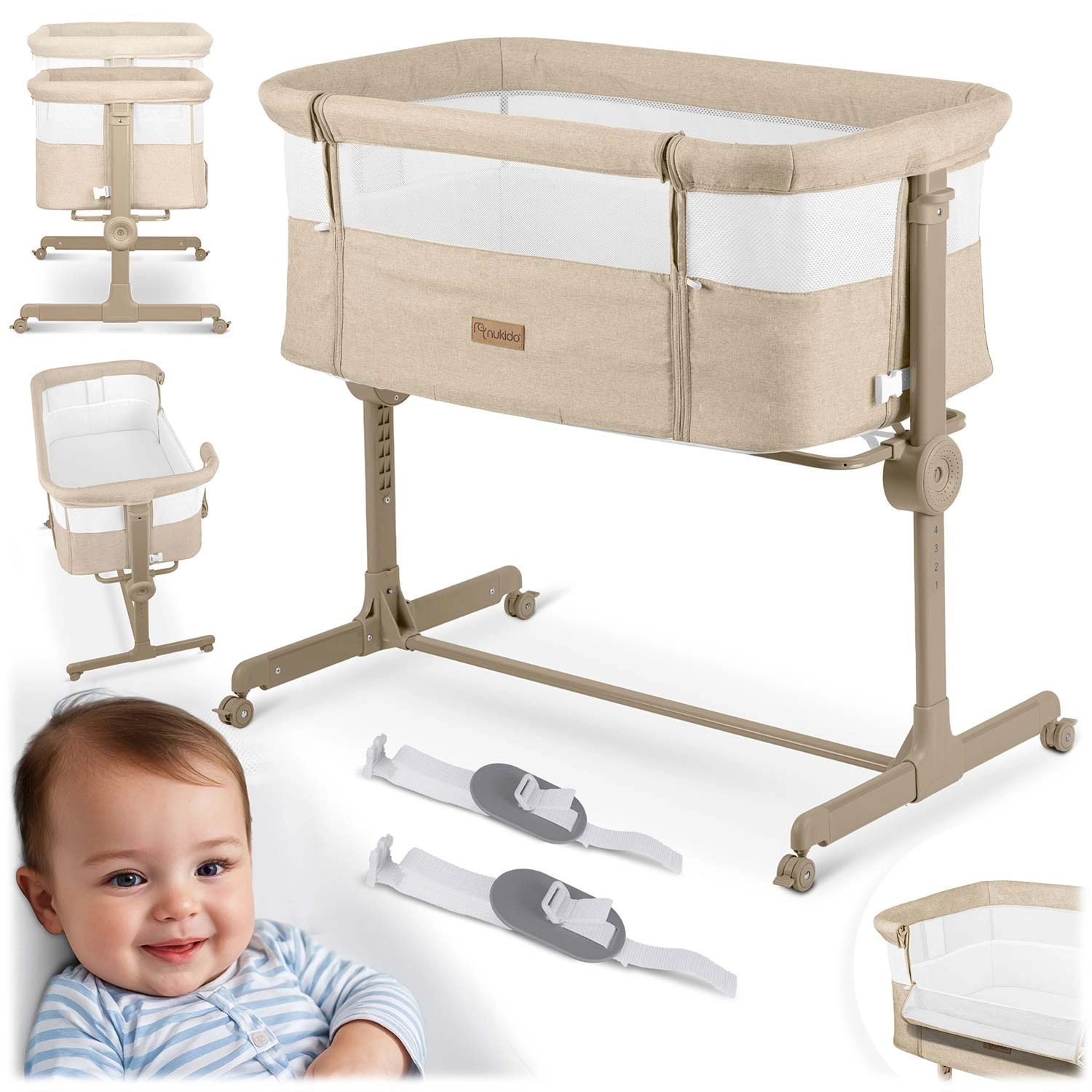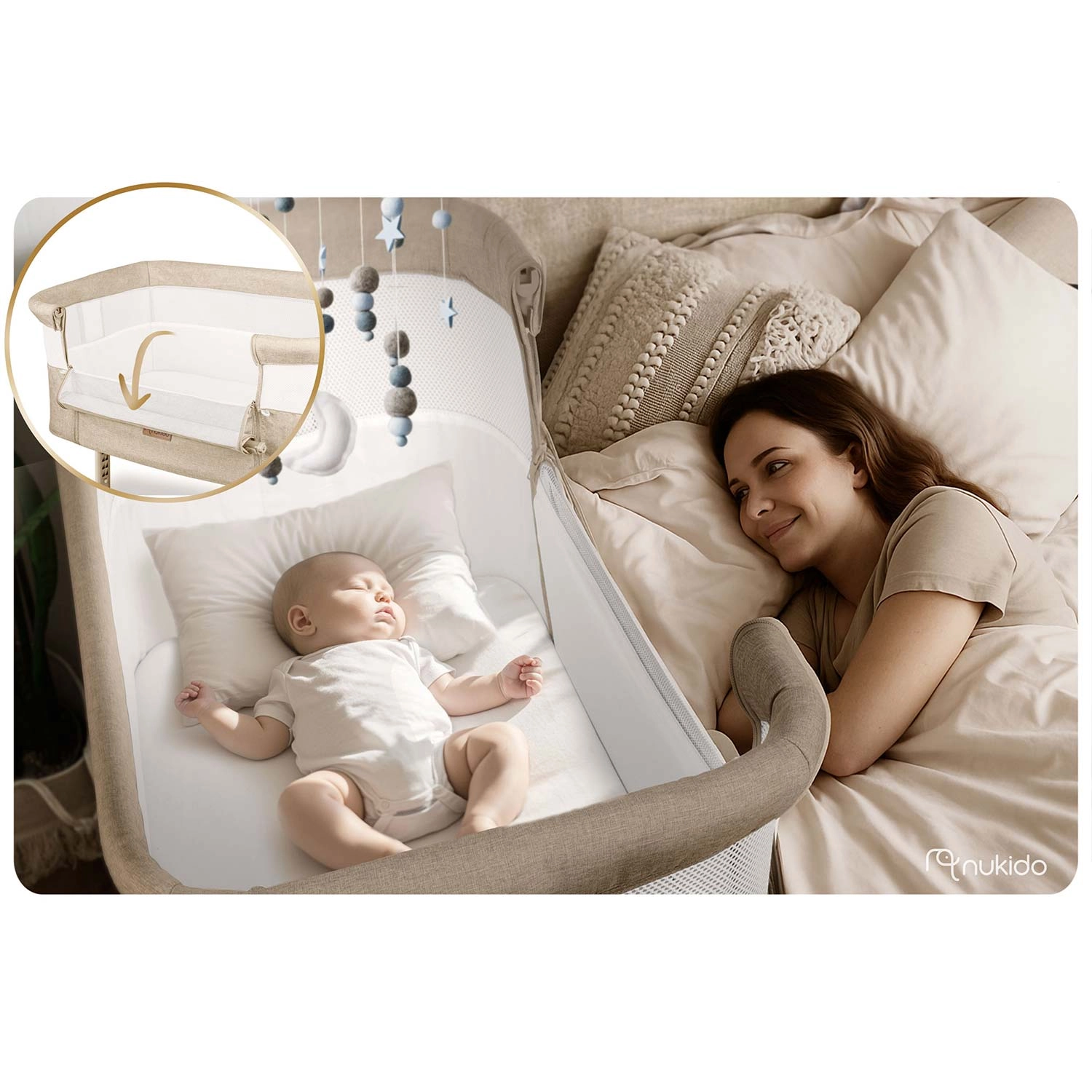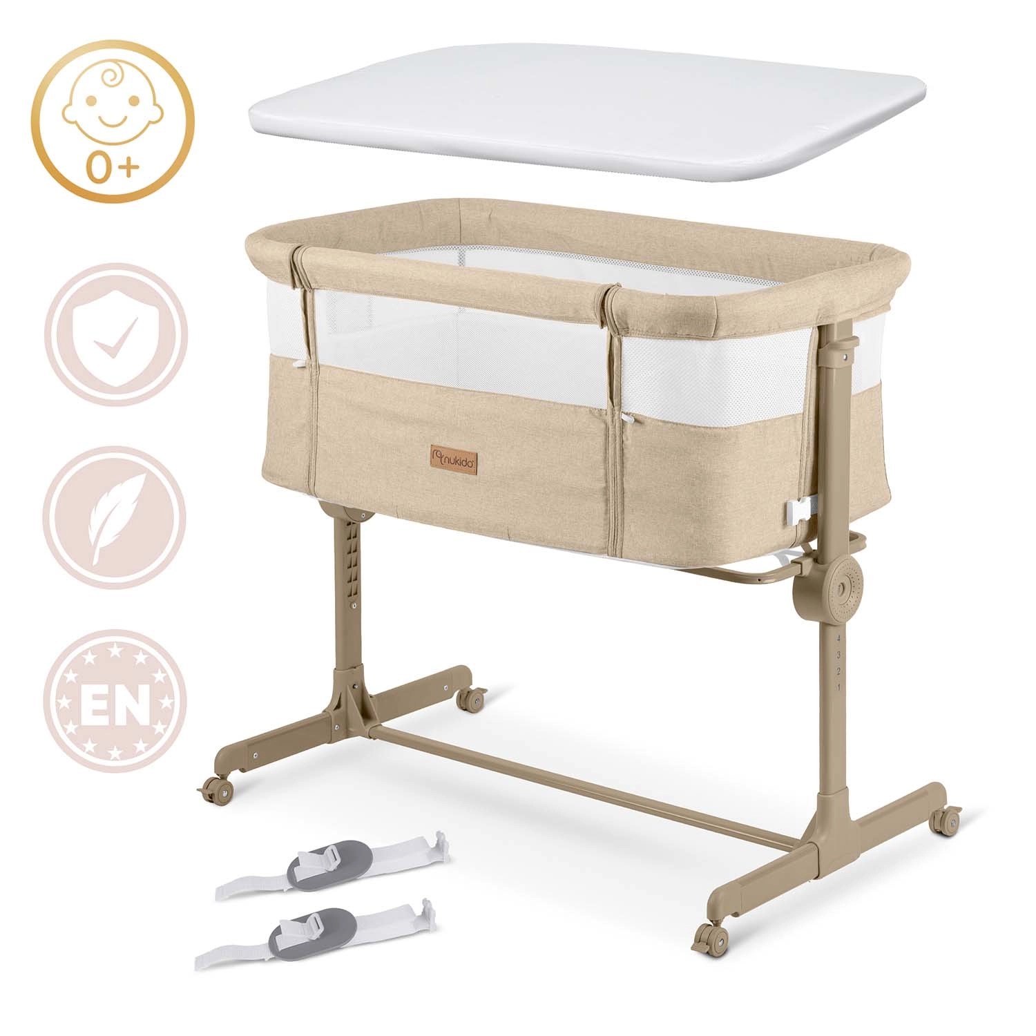 Varno pripnite dojenčka ob svojo posteljo in si zagotovite mirnejše noči. Prislonljiva posteljica NUKIDO nudi stabilno konstrukcijo, zračne mrežaste stene za boljše kroženje zraka in odličen pregled nad otrokom. Zahvaljujoč neodvisni dvostranski regulaciji višine zlahka poravnate višino z vzmetnico staršev ali ustvarite rahel naklon, ki lahko pomaga na primer pri refluksu.