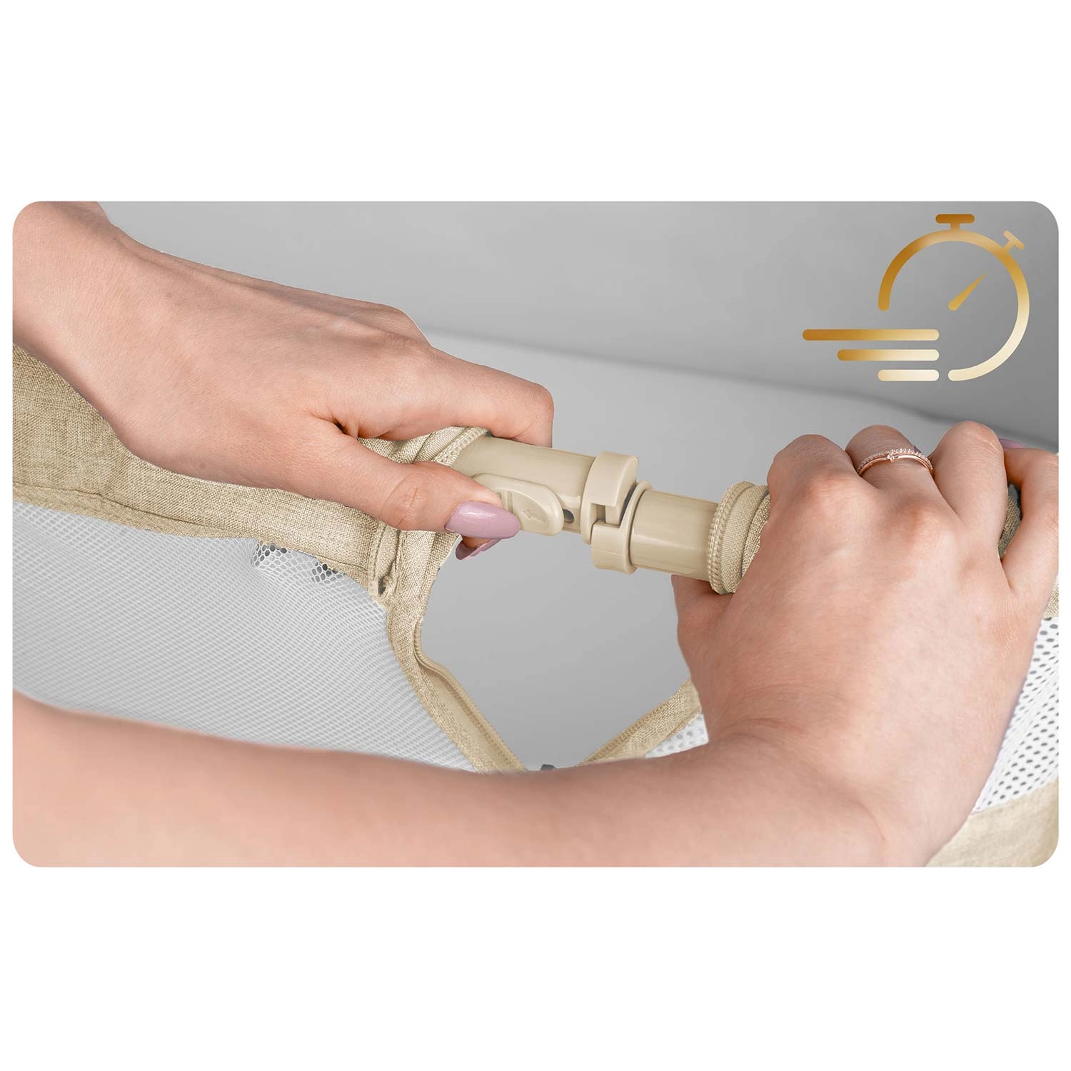 Posteljico zložite v hipu, z kolesci z zavoro pa jo prestavite tja, kjer jo ravno potrebujete – v spalnico, dnevno sobo ali k otroškemu kotičku. Odstranljiv bočni panel z zunanjim zadrgo olajša dostop do dojenčka in hkrati preprečuje njegovo nenamerno odpiranje od znotraj. Vzmetnica s pralno prevleko pomaga vsak dan ohranjati popolno čistočo.