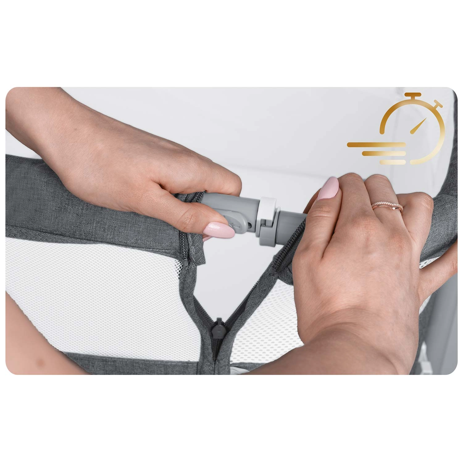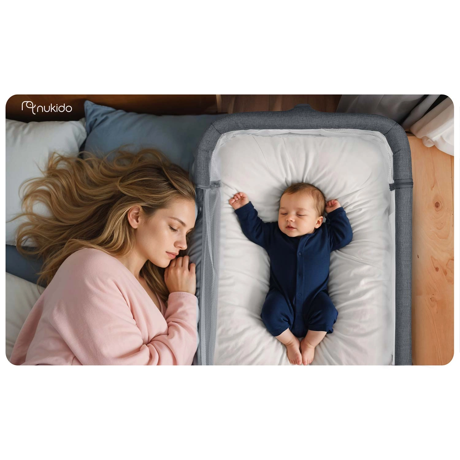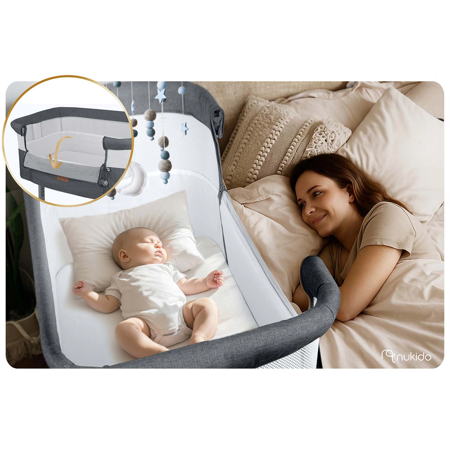 Imejte dojenčka varno na dosegu roke. Obposteljna posteljica NUKIDO zagotavlja udobne in mirne noči – otrok je blizu, lažje ga podojite in pomirite, ne da bi vstajali. Zračne mrežaste stranice izboljšajo kroženje zraka in omogočajo stalen očesni stik.
