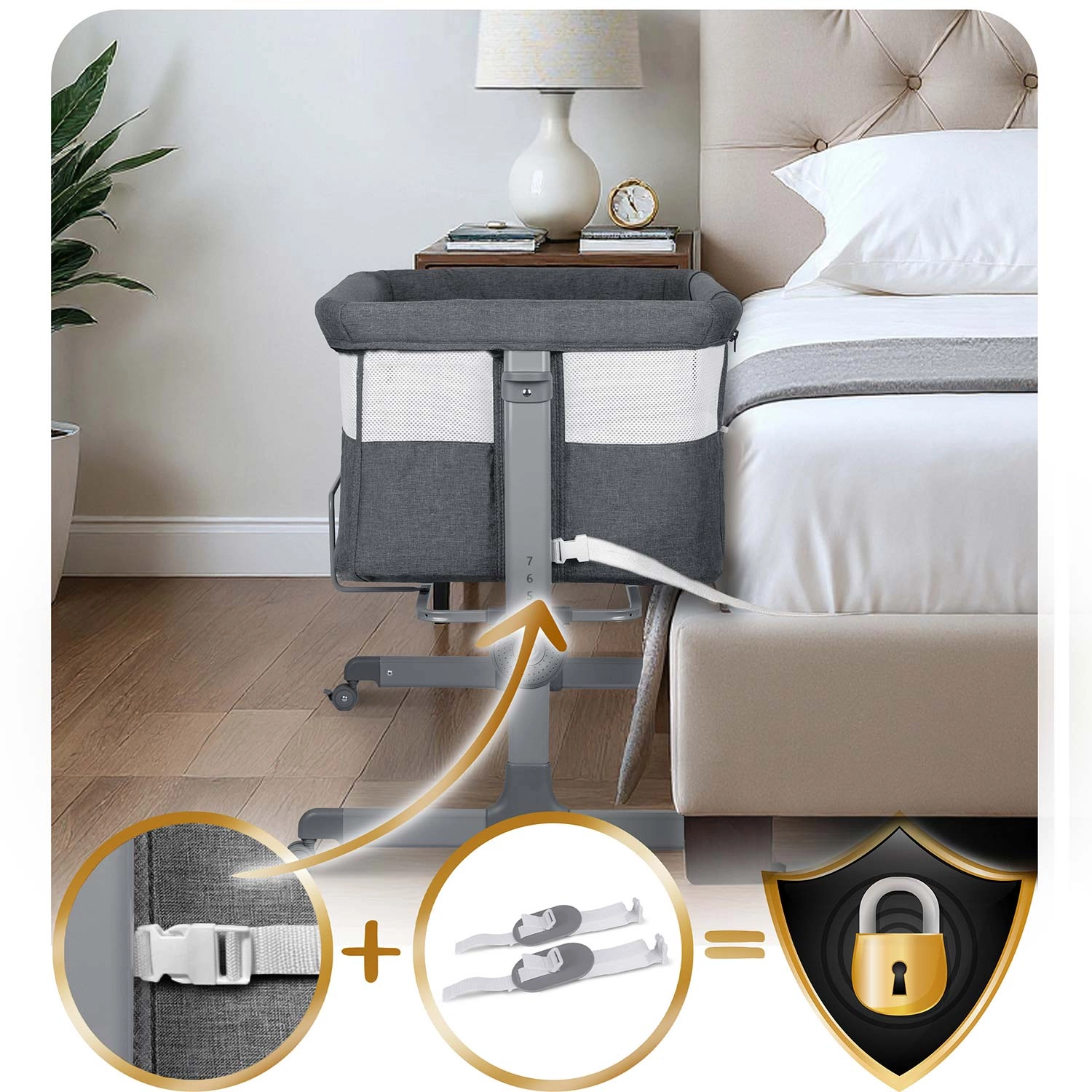 - Varna pritrditev – univerzalni trakovi za trdno povezavo s posteljo brez vrtanja.