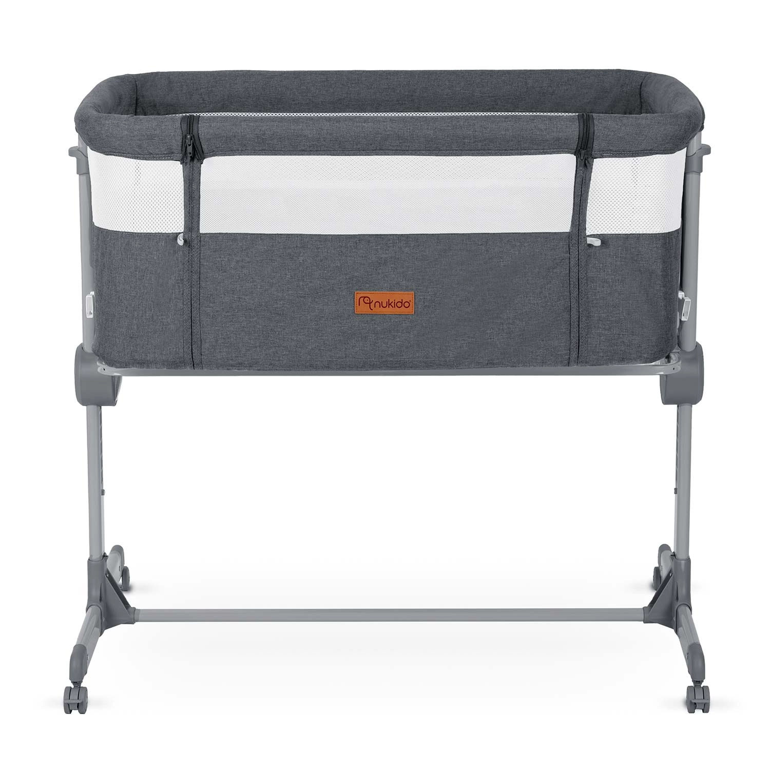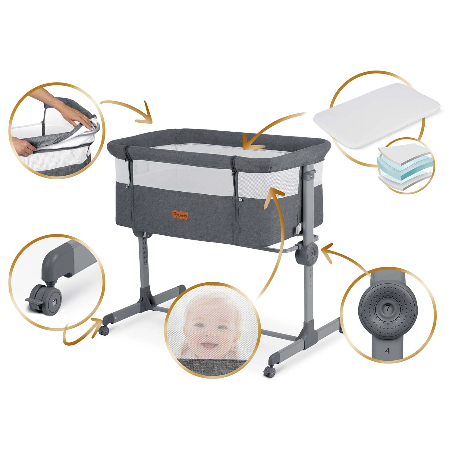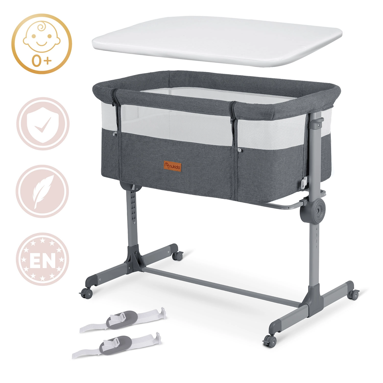 Praktična obposteljna posteljica NUKIDO ponuja varen spanec v bližini, 7-stopenjsko nastavitev višine z možnostjo neodvisne nastavitve obeh strani, zložljivo konstrukcijo za potovanja in 4 kolesca z zavoro za enostavno premikanje. Priloženi sta vzmetnica s pralno prevleko in pritrdilni trakovi za trdno povezavo s posteljo staršev.