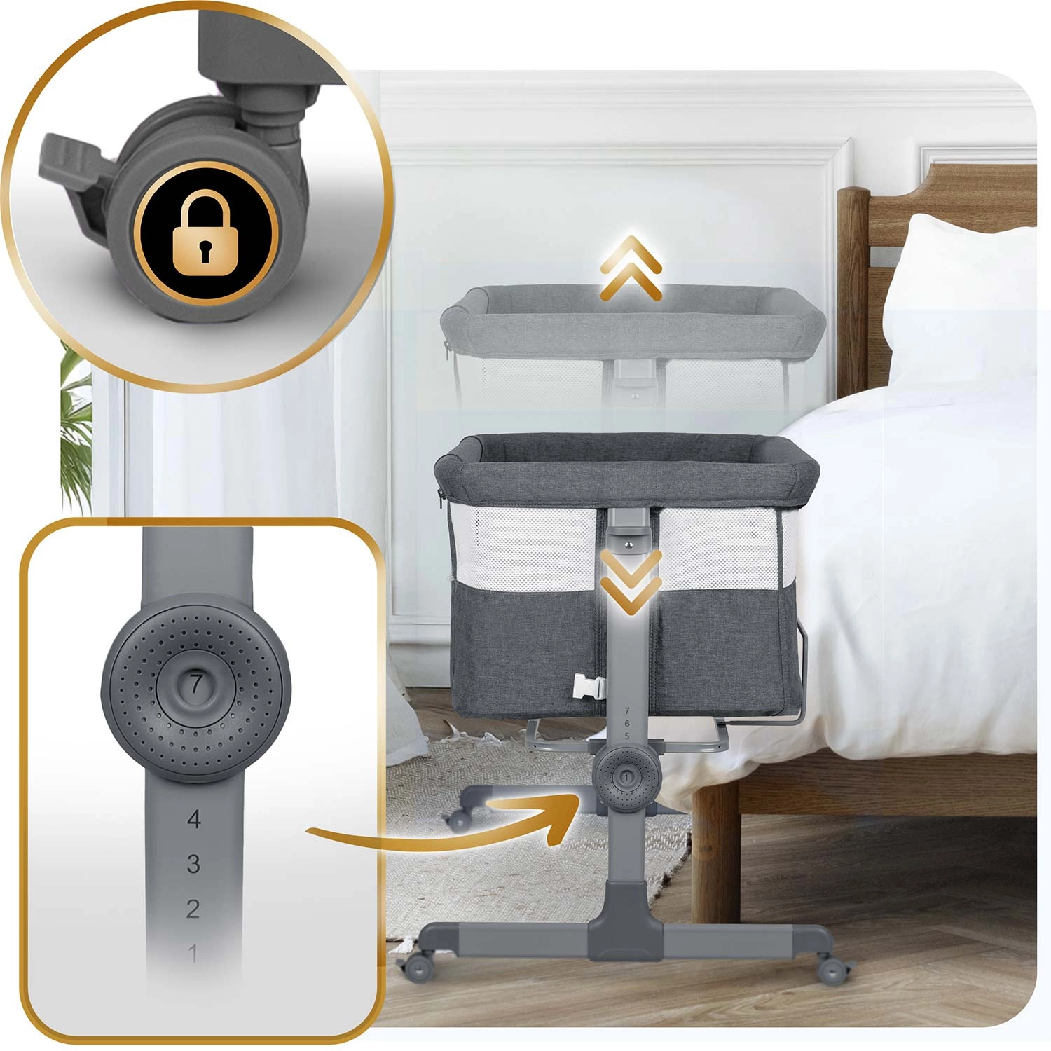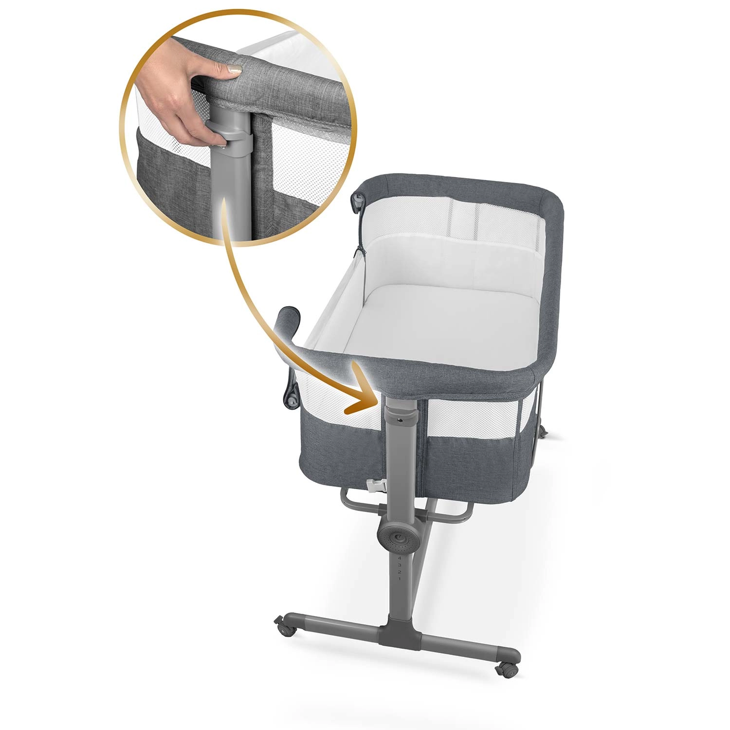 Prilagodite posteljico višini svoje vzmetnice ali ustvarite rahel naklon za udobje dojenčka. Nastavitev poteka hitro in zanesljivo z enim gibom.