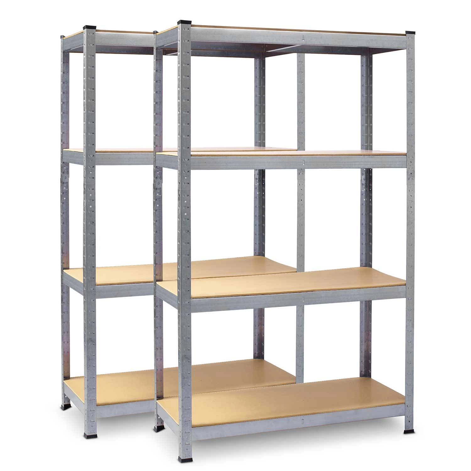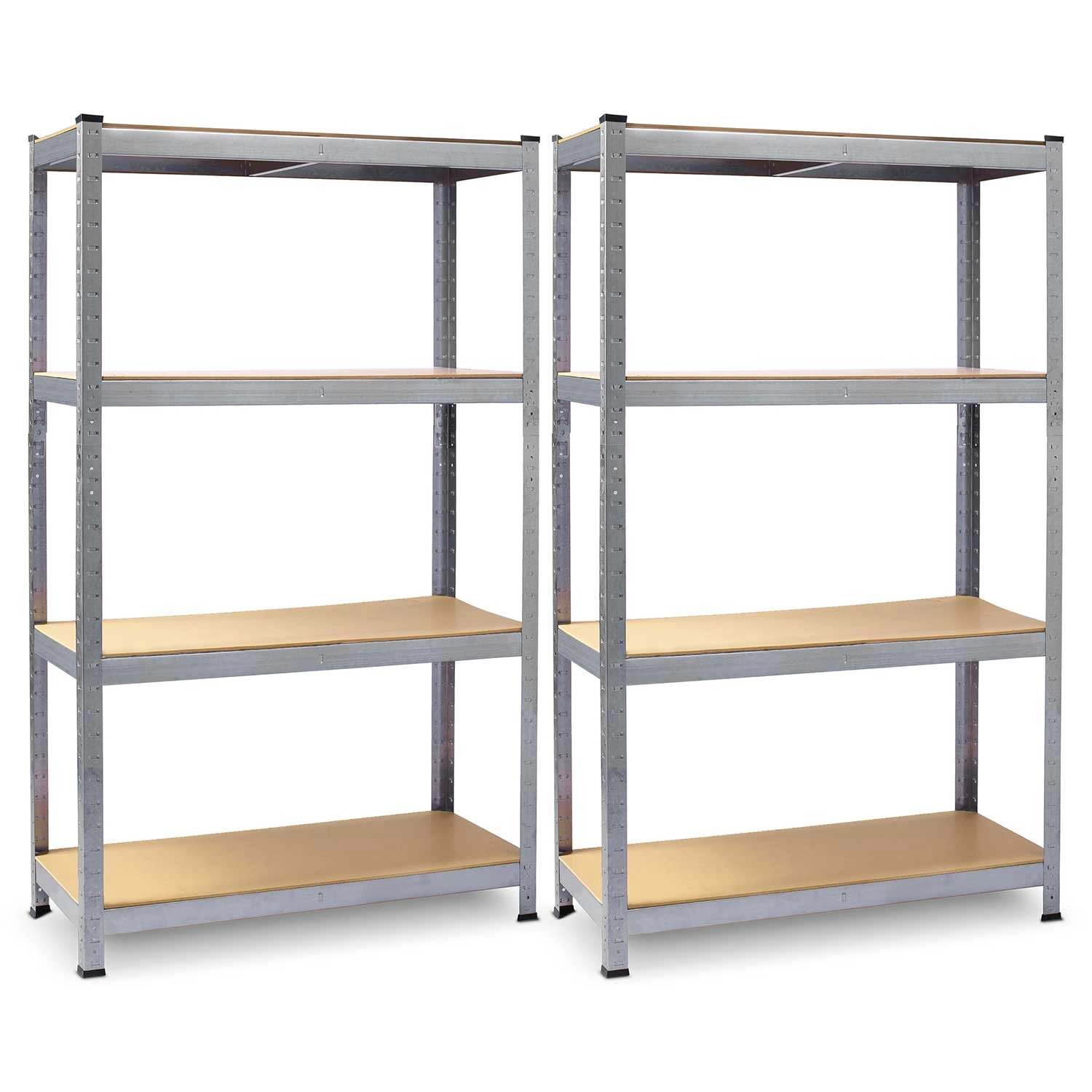 Ta komplet 2 robustnih skladiščnih regalov z galvanizirano obdelavo je idealen za pregledno shranjevanje orodja, zabojnikov in arhivskih škatel. Vsak regal ima 4 vzdržljive police iz MDF (debelina 3,3 mm) s sredinskimi ojačitvami in nosilnostjo do 135 kg na polico, zato brez težav prenese tudi težjo opremo.