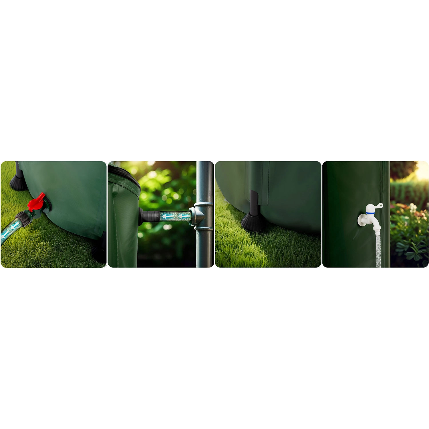 Praktični upravljalni elementi omogočajo udobno uporabo: sprednja pipa z ročico on/off za hitro polnjenje zalivalke in spodnji izpustni/odtočni ventil za priklop cevi in učinkovito distribucijo vode po celotnem vrtu. Zložen sod zavzame malo prostora, zato je odličen tudi za manjše vrtove in sezonsko shranjevanje.