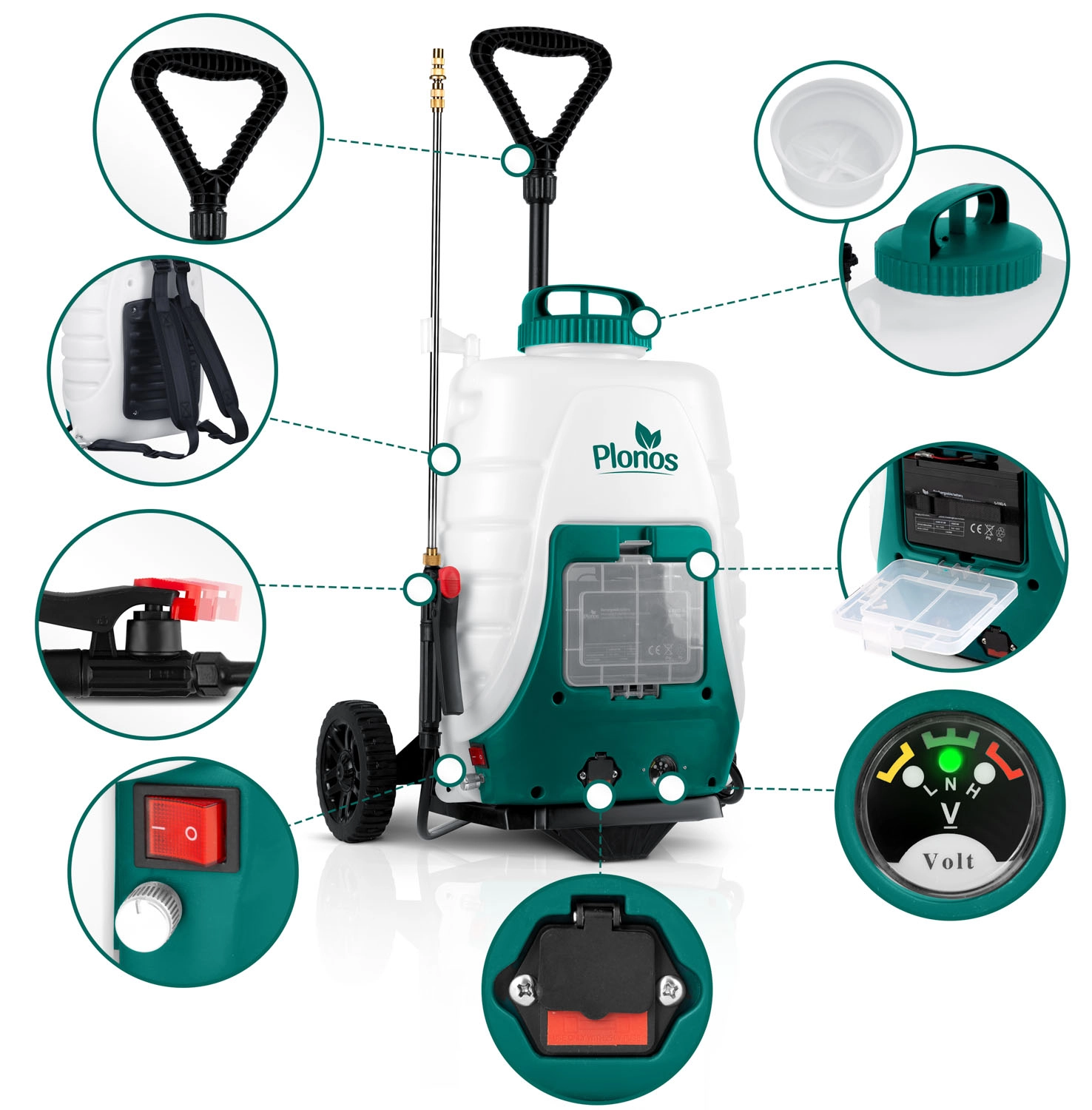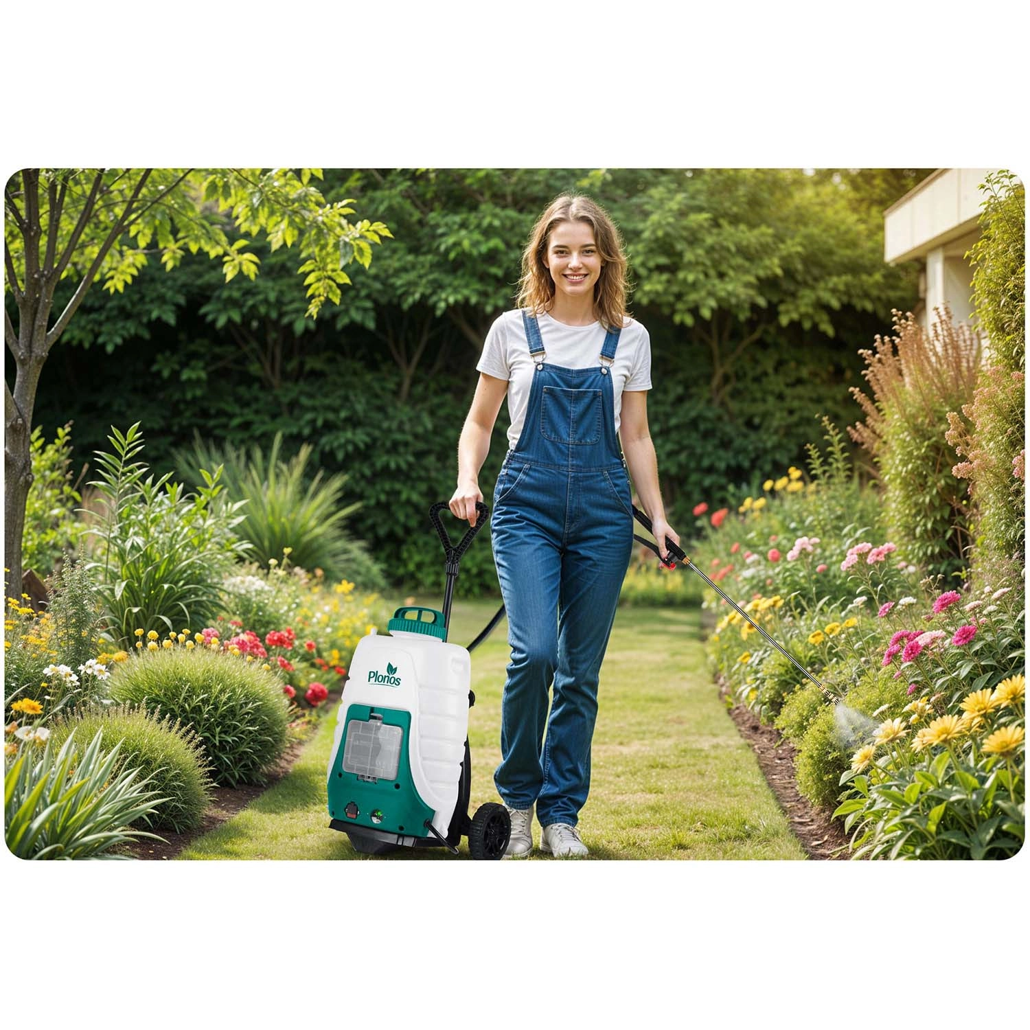 Akumulatorski razpršilec na vozičku Plonos združuje visoko zmogljivost in največje udobje. Stabilno podvozje z velikimi kolesi, teleskopski ročaj in praktičen žep za dodatke olajšajo upravljanje v vsakem terenu. Regulacija vrtljajev motorja 2800–3200 vrt./min in delovni tlak 0,10–0,45 MPa omogočata nastavitev idealnega curka za občutljive rastline in intenzivne aplikacije.