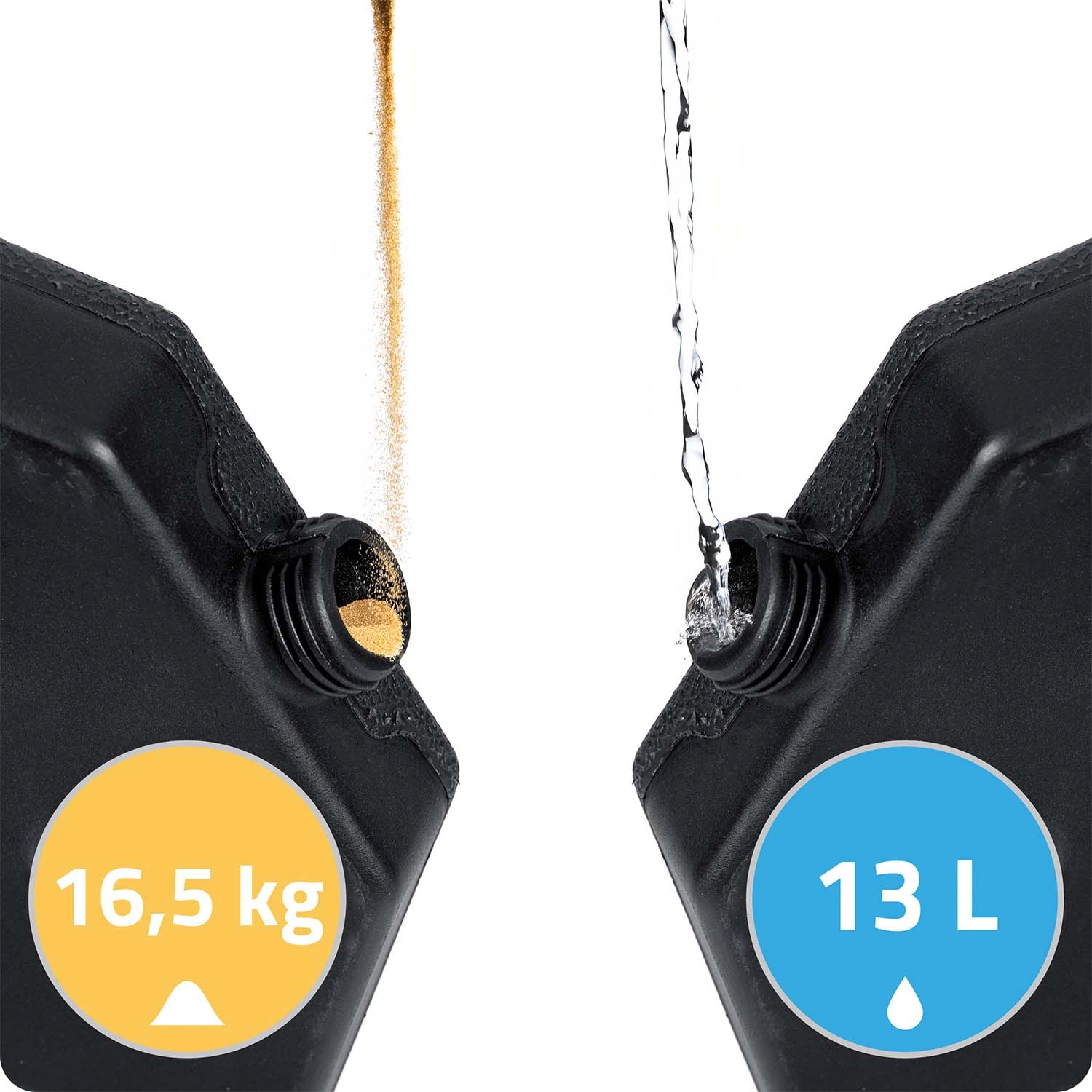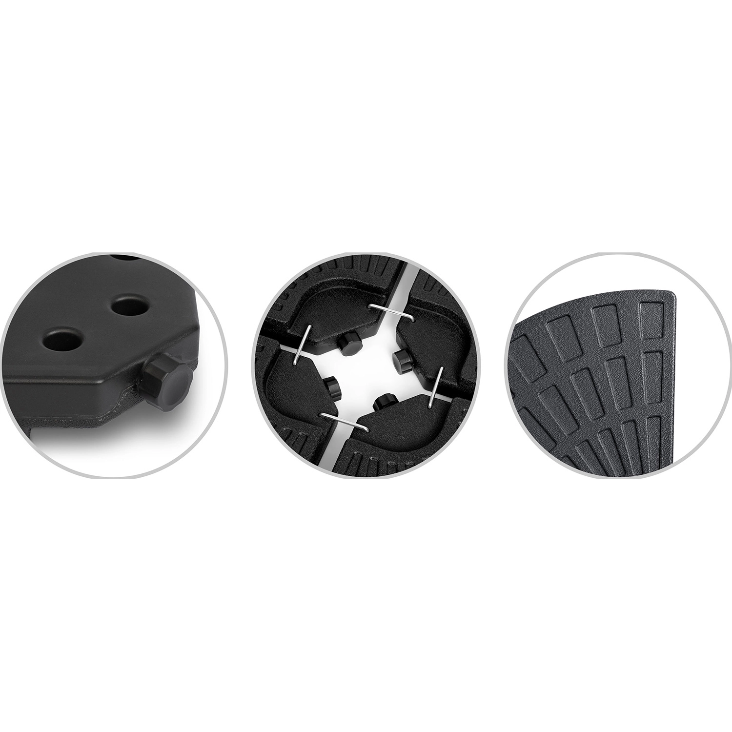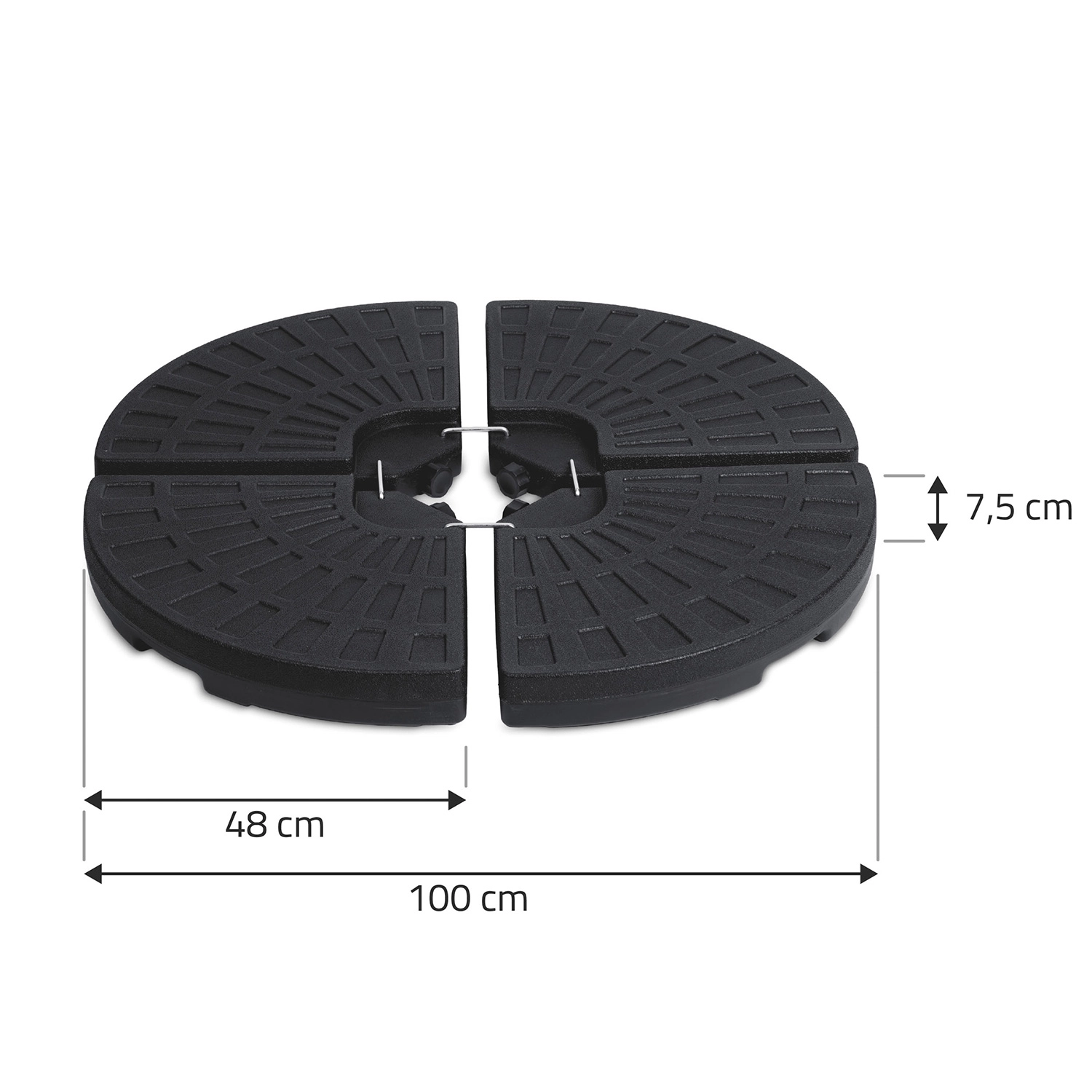 Montaža je hitra in intuitivna: štirje deli objamejo drog senčnika, kovinski kavlji (vključeni v komplet) pa jih trdno povežejo. Teksturirana površina poveča oprijem s podlago, polnilne odprtine pa omogočajo udobno polnjenje in praznjenje. Idealna rešitev za terase, vrtove in gostinske vrtne terase.