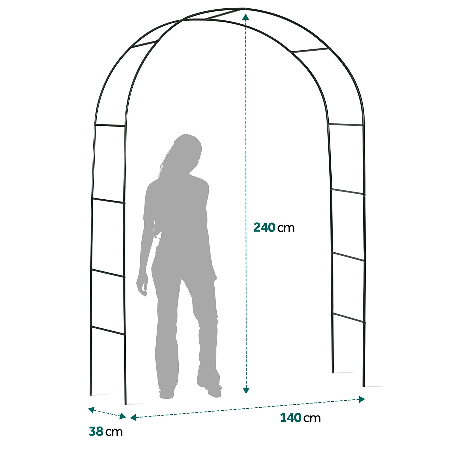 Elegantna vrtna lokasta pergola višine 240 cm bo vašemu vrtu dodala romantičen vhod in oporo za vzpenjavke. Ima odporno jekleno konstrukcijo s prašnim lakiranjem, preprosto montažo brez specializiranega orodja ter sidra za stabilno pritrditev v zemljo. Idealna za vrtnice, bršljan, vinsko trto in okrasitev s svetlobnimi verigami.