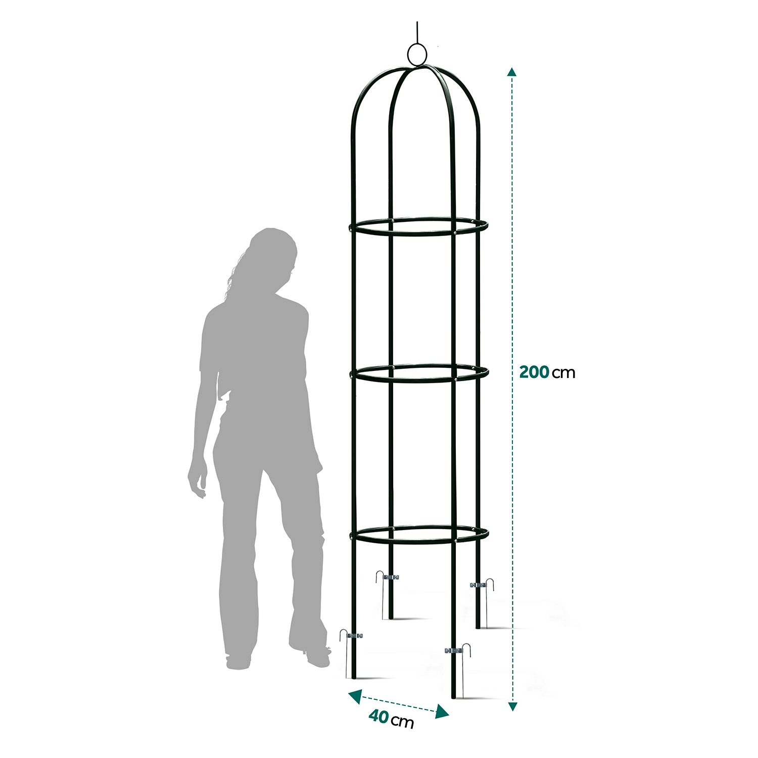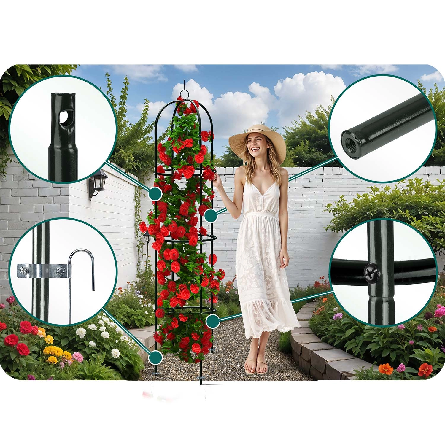 Montaža je hitra in intuitivna – posamezni deli natančno sežejo skupaj, potrebni vijaki pa so priloženi. Četverica talnih sider ohranja konstrukcijo trdno v tleh, zato bodo vaše rastline rasle varno in pokonci. Ustvarite romantičen vhod, navpični poudarek v gredici ali efektno dekoracijo v loncu.