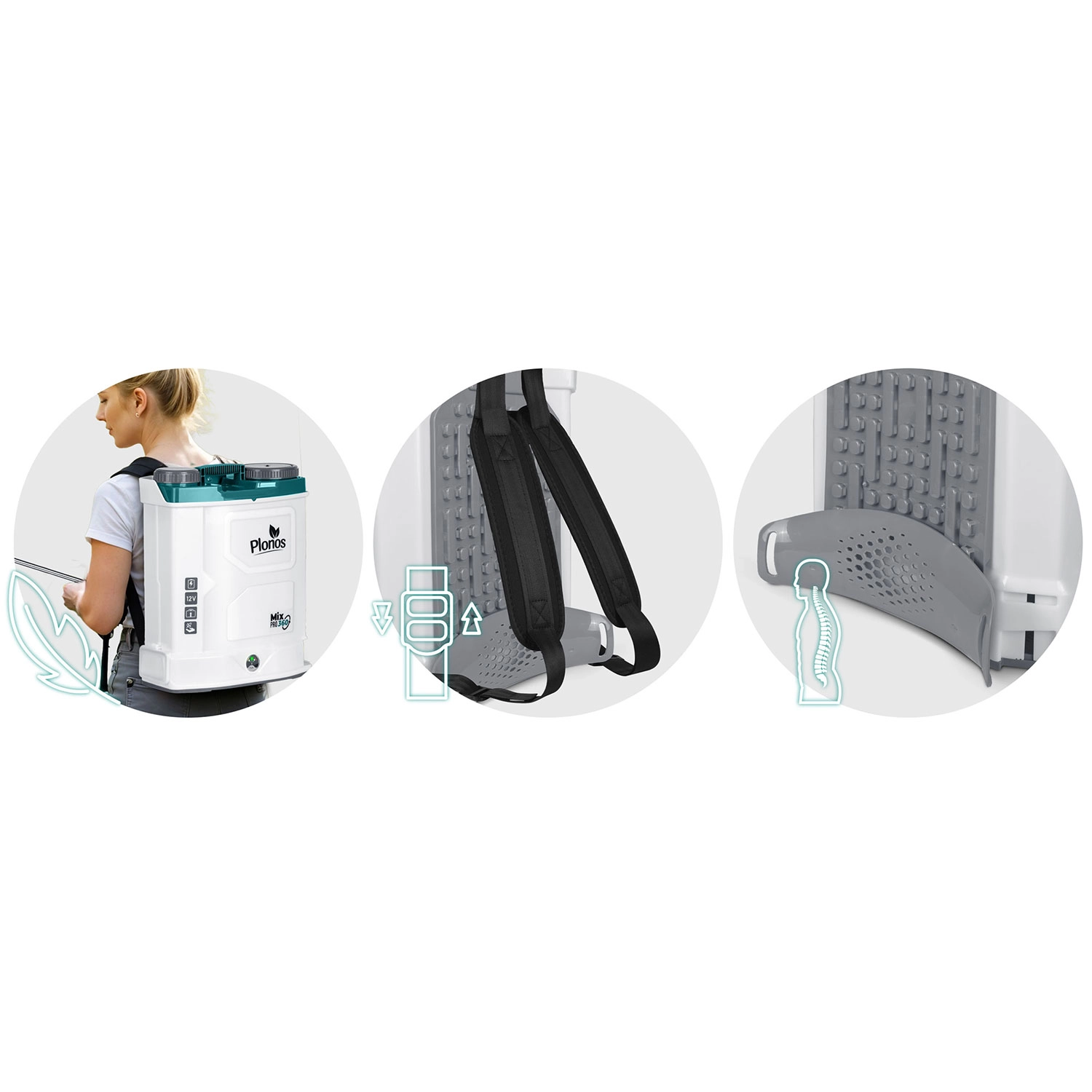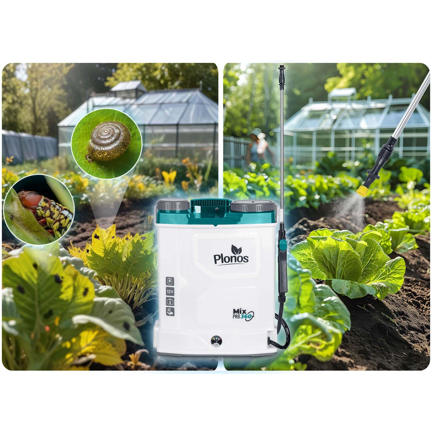 Razpršilec PLONOS Mix Pro 360 je zanesljiv pomočnik za zaščito in prehrano rastlin na gredicah, travnikih in v sadovnjakih. Vgrajen mešalni sistem ohranja delovno raztopino homogeno, s čimer povečuje učinkovitost razprševanja in odpravlja mašenje šob. 12V/8Ah baterija omogoča tiho delovanje in avtonomijo do 9 ur z enim polnjenjem, zato boste zlahka obdelali tudi večje površine.