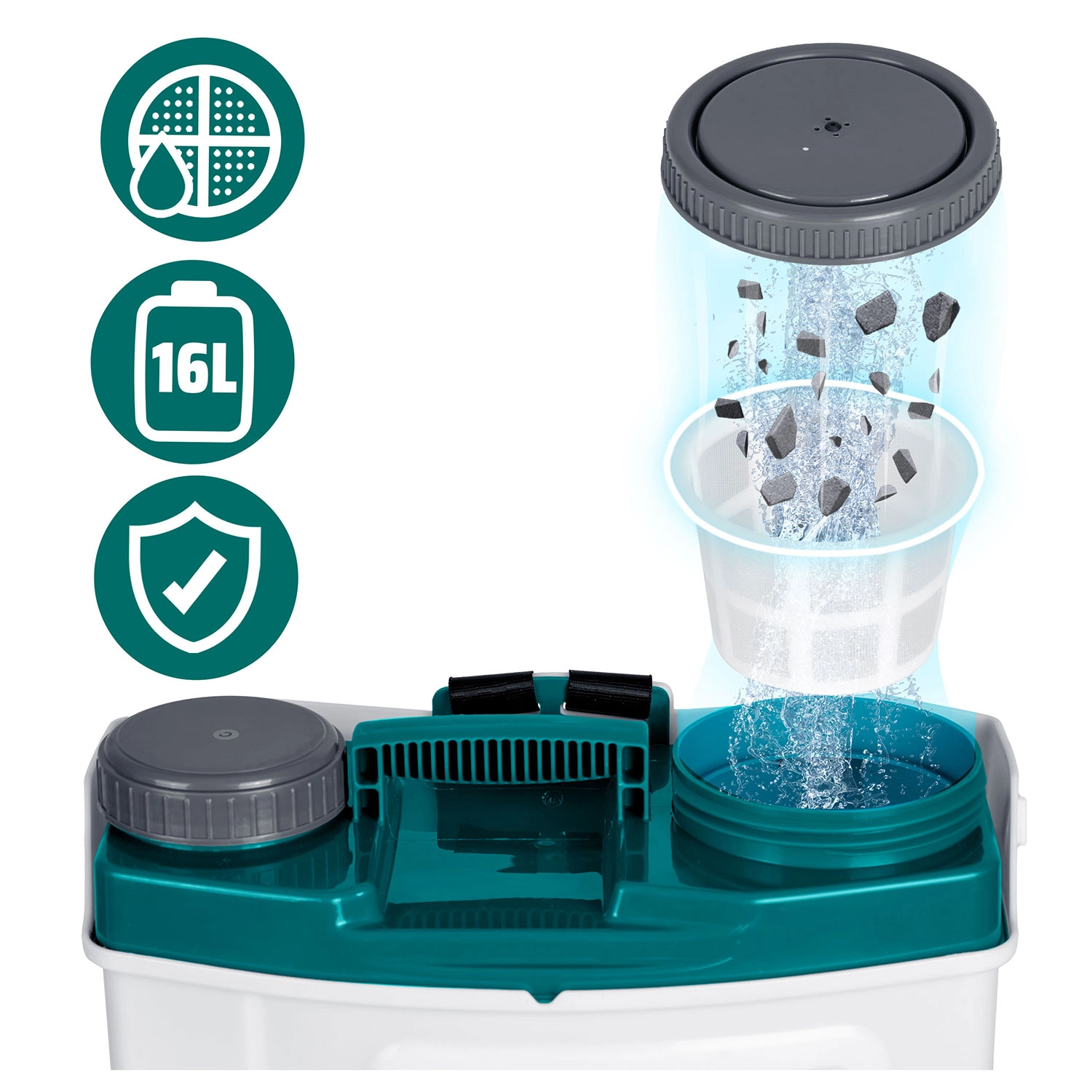Z 4 zamenljivimi šobami preprosto izberete idealen curek – fino meglico za občutljive rastline, ploščati curek za natančno delo, nastavljivo štiriluknjično šobo za univerzalno rabo ali dvojno glavo za hitro pokritje širših gredic. Oblazinjene, ojačane naramnice z nastavitvijo, filtrirno sito proti nečistočam in trpežen PE rezervoar zagotavljajo dolgo življenjsko dobo in udobje pri delu.